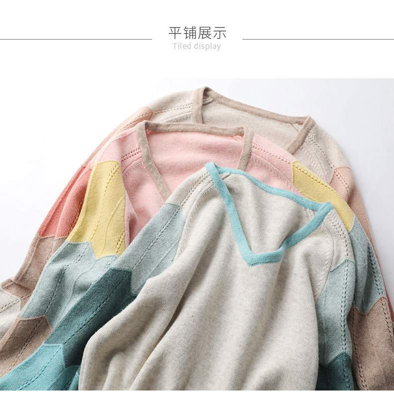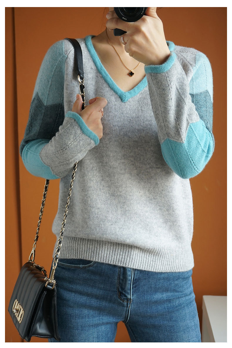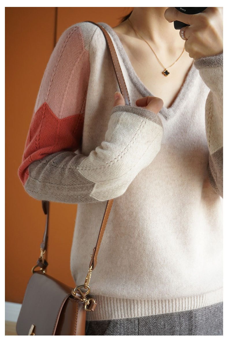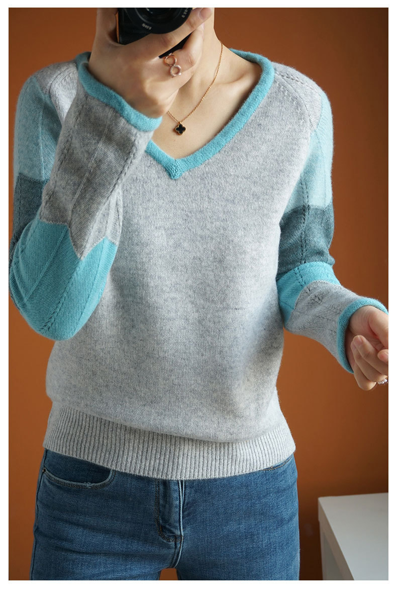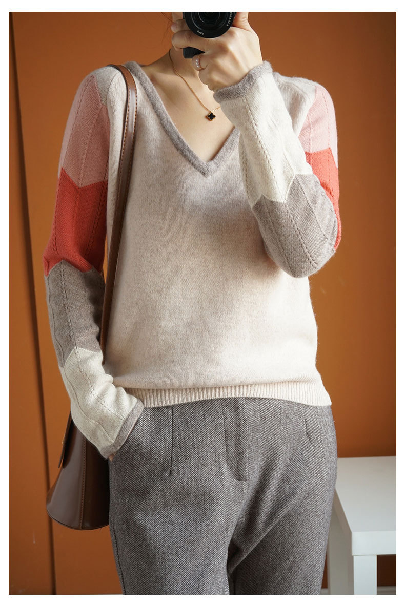 QHJY-JY807撞色羊毛衫女V领 23秋冬新款女装V领套头拼接彩色保暖针织毛衣女
