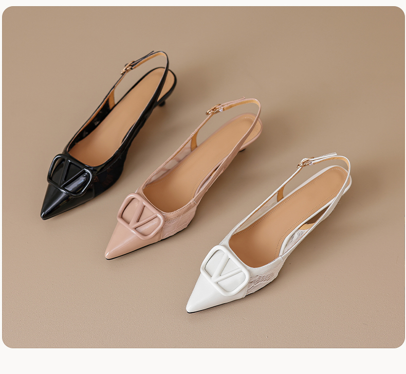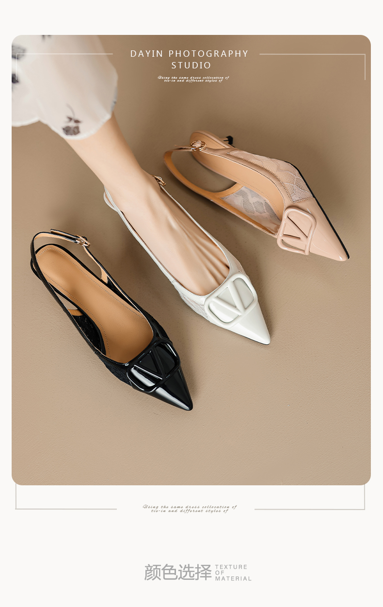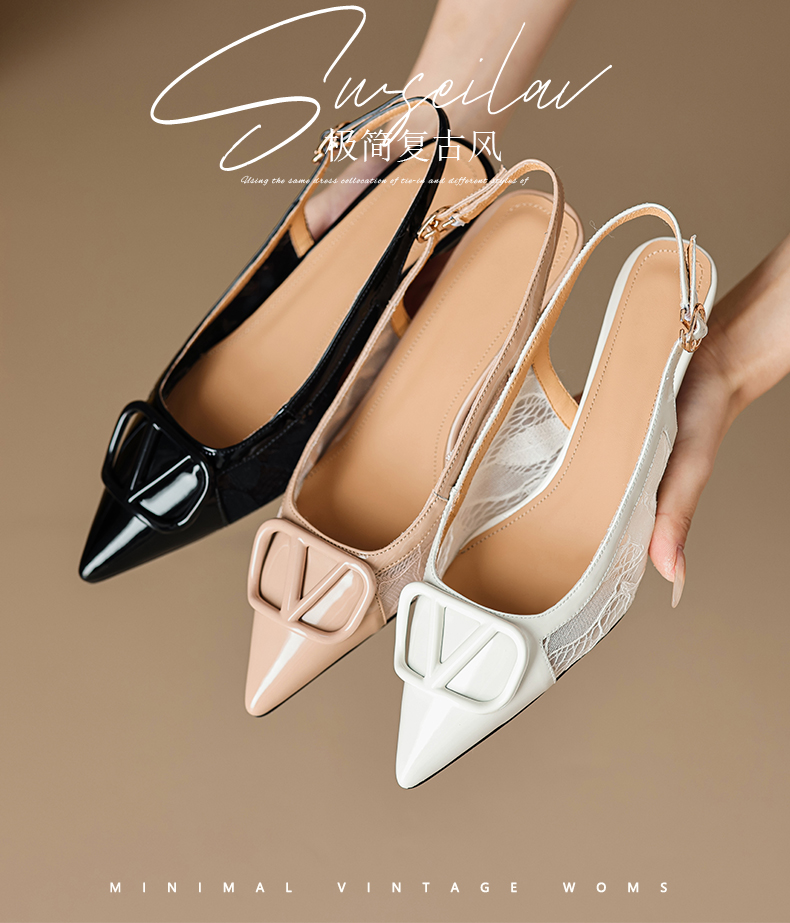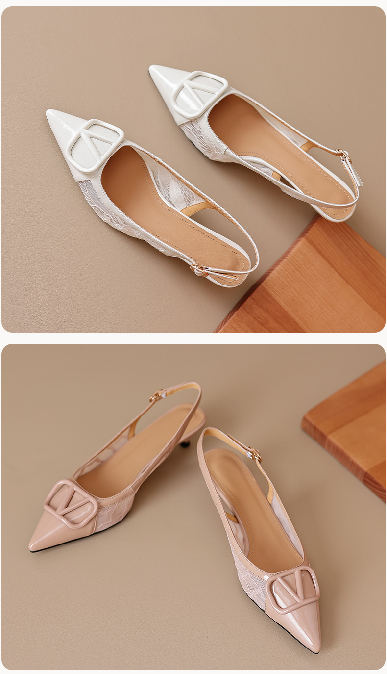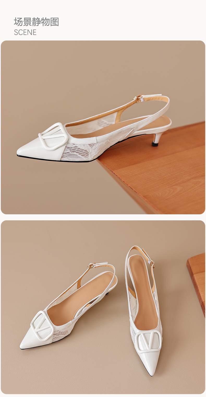 气质感V扣,尖头细跟低跟后空蕾丝凉鞋MLD-D6052