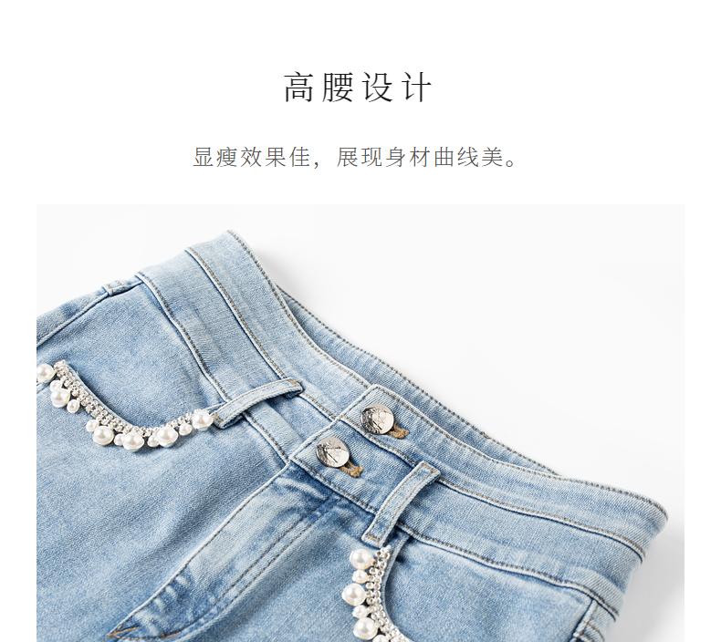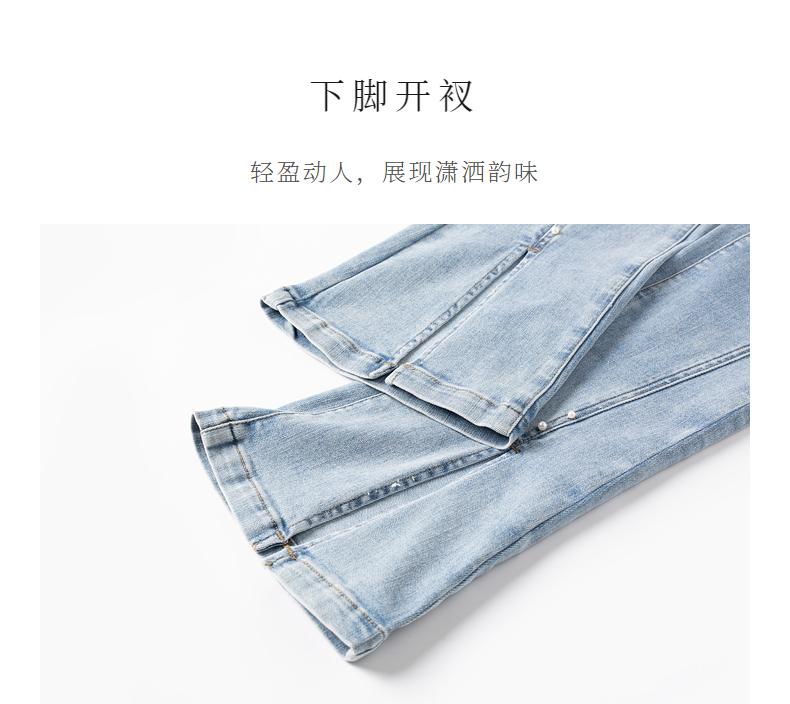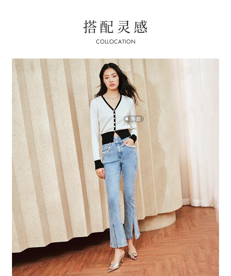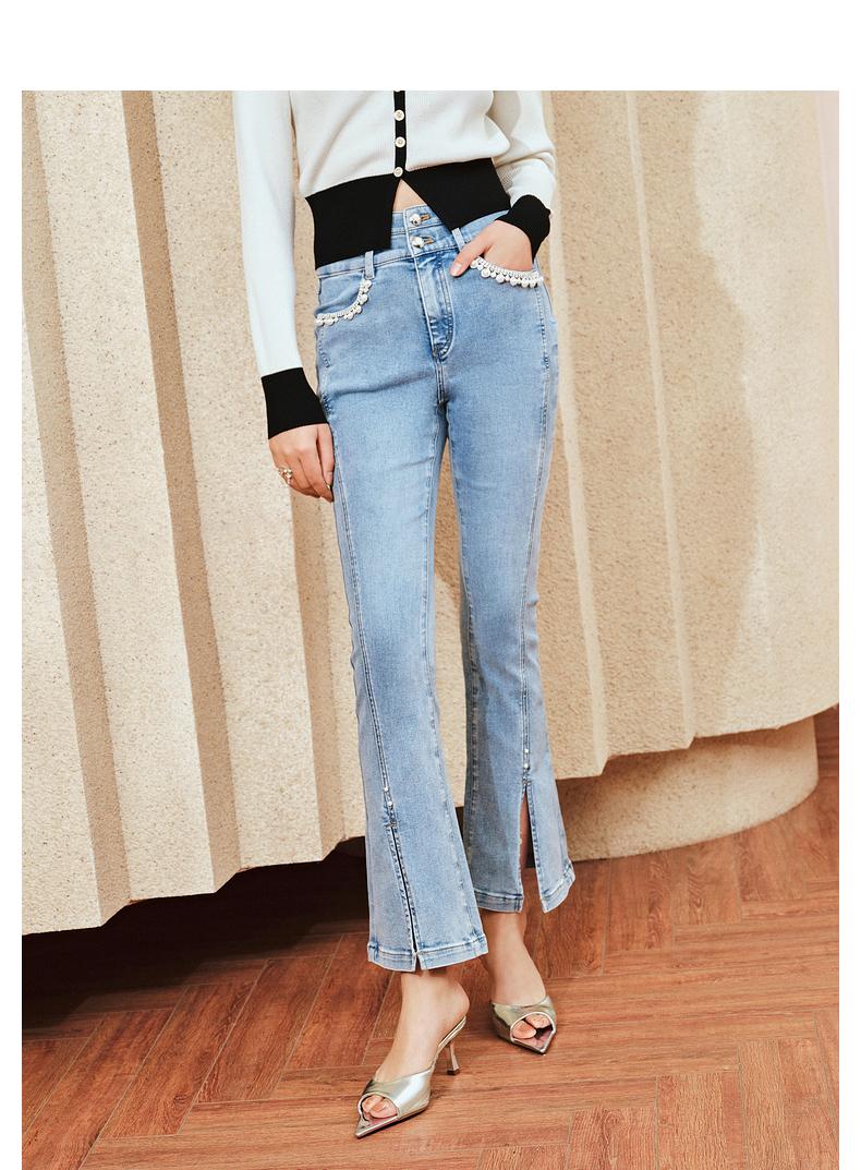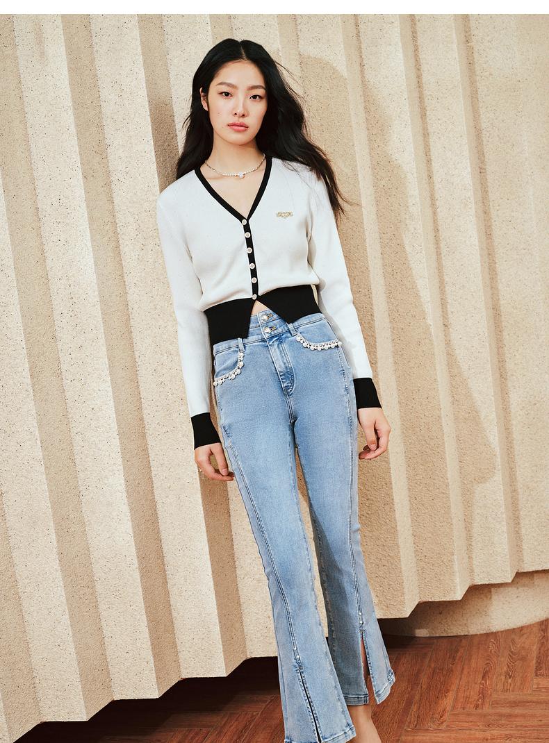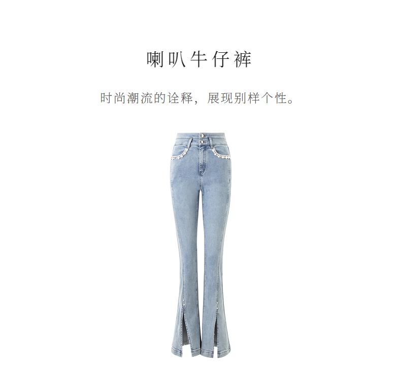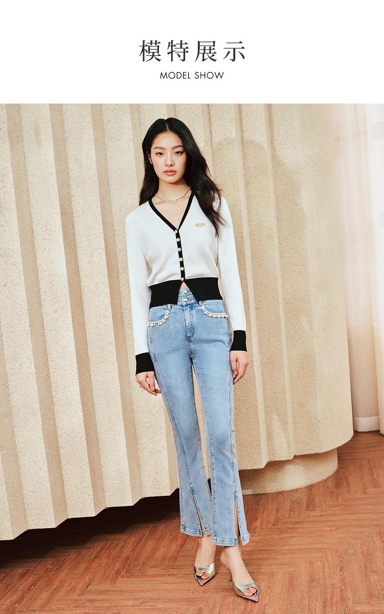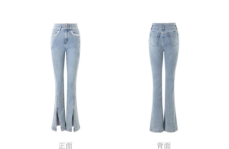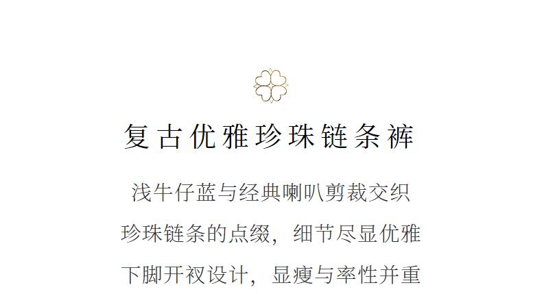 MAXRIENY复古优雅感珍珠链条裤子2024春季新品微喇开叉修身牛仔裤(货号:MS85PA026)
