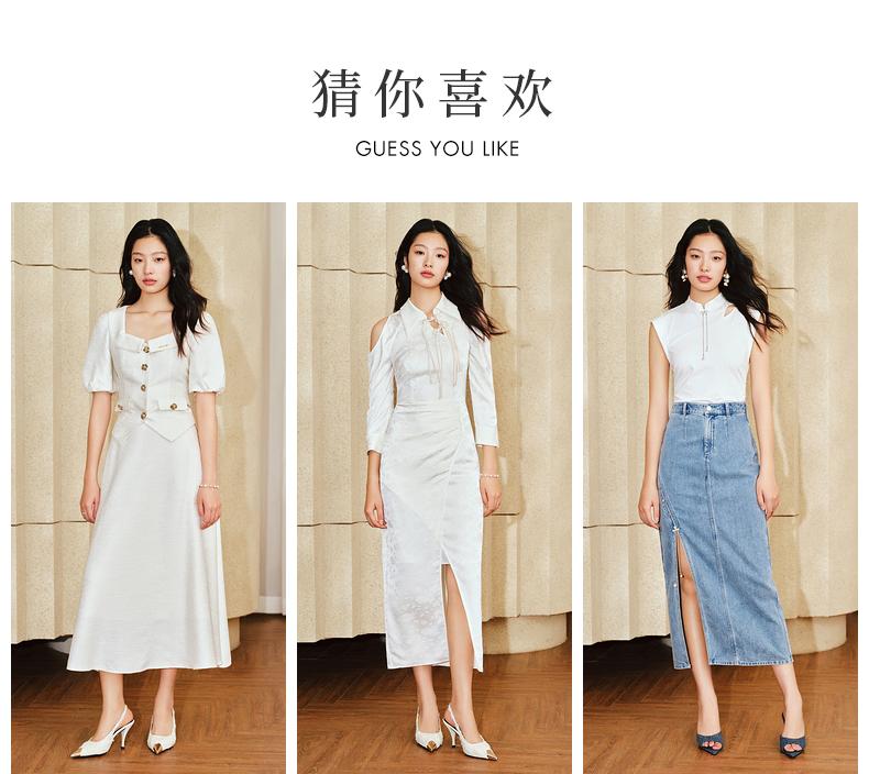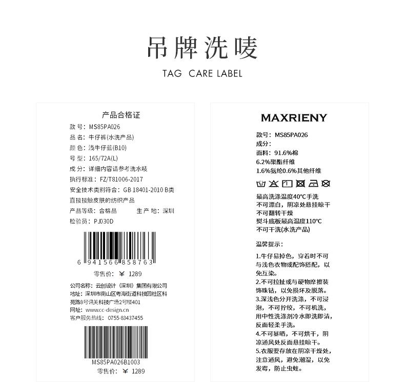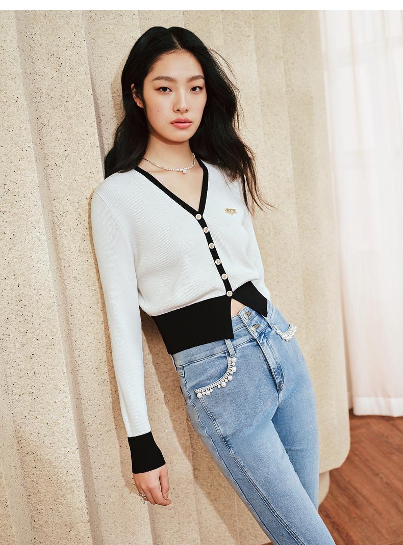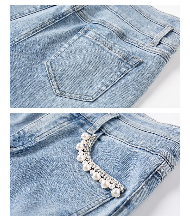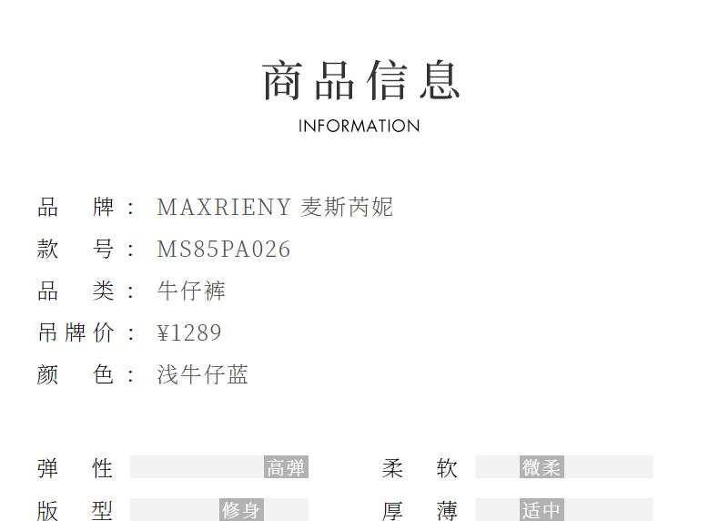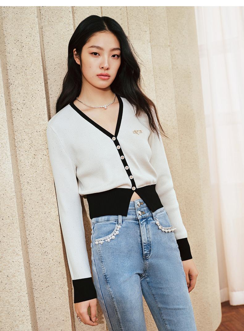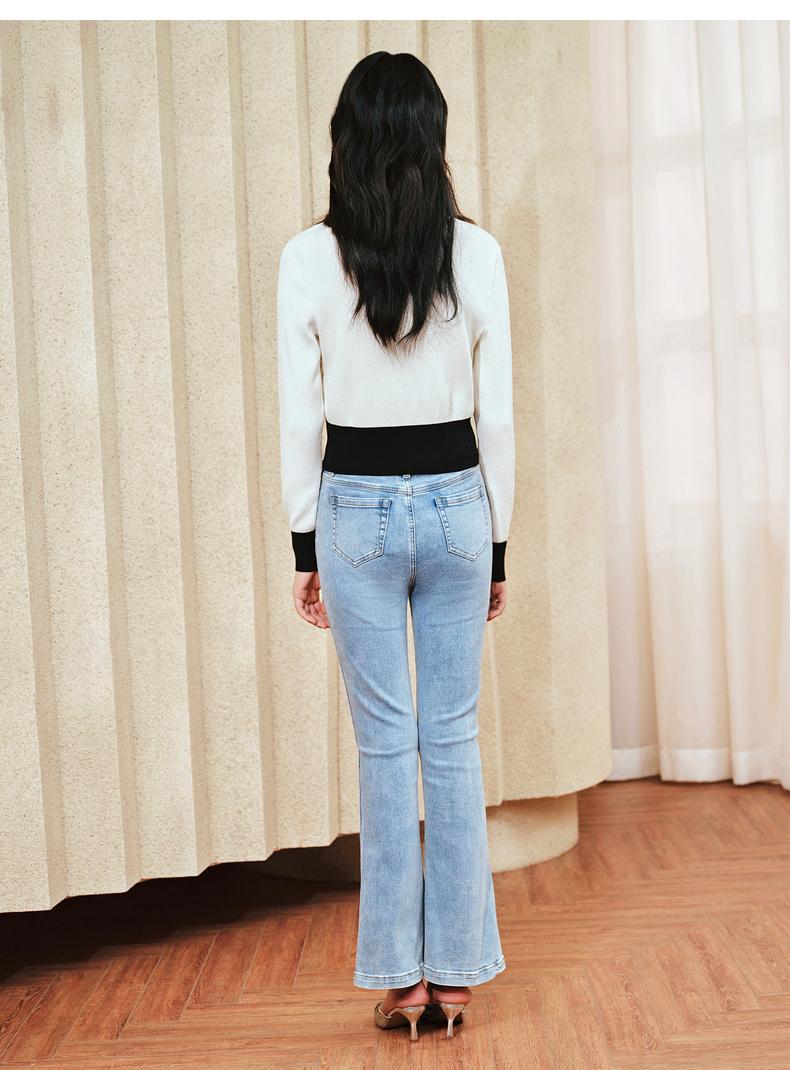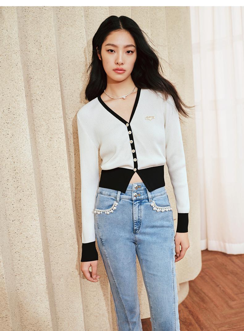 MAXRIENY复古优雅感珍珠链条裤子2024春季新品微喇开叉修身牛仔裤(货号:MS85PA026)