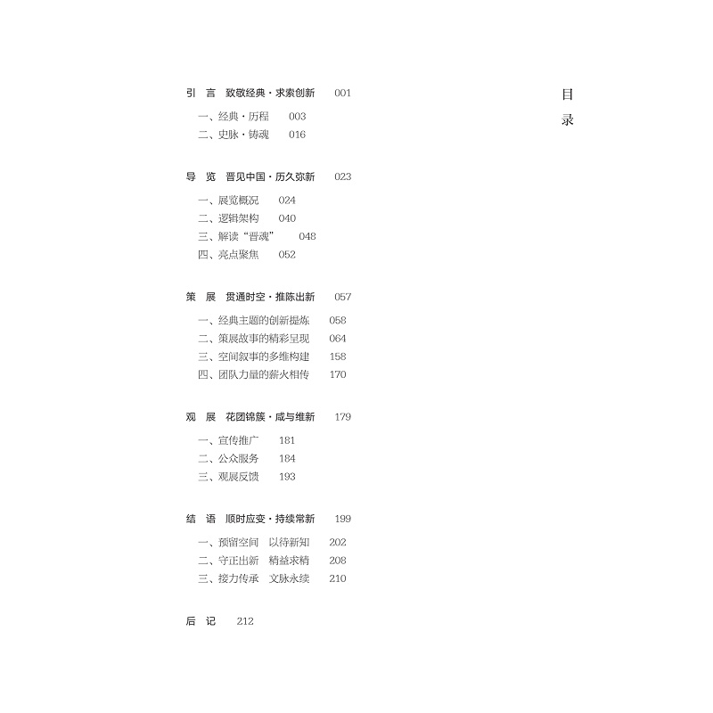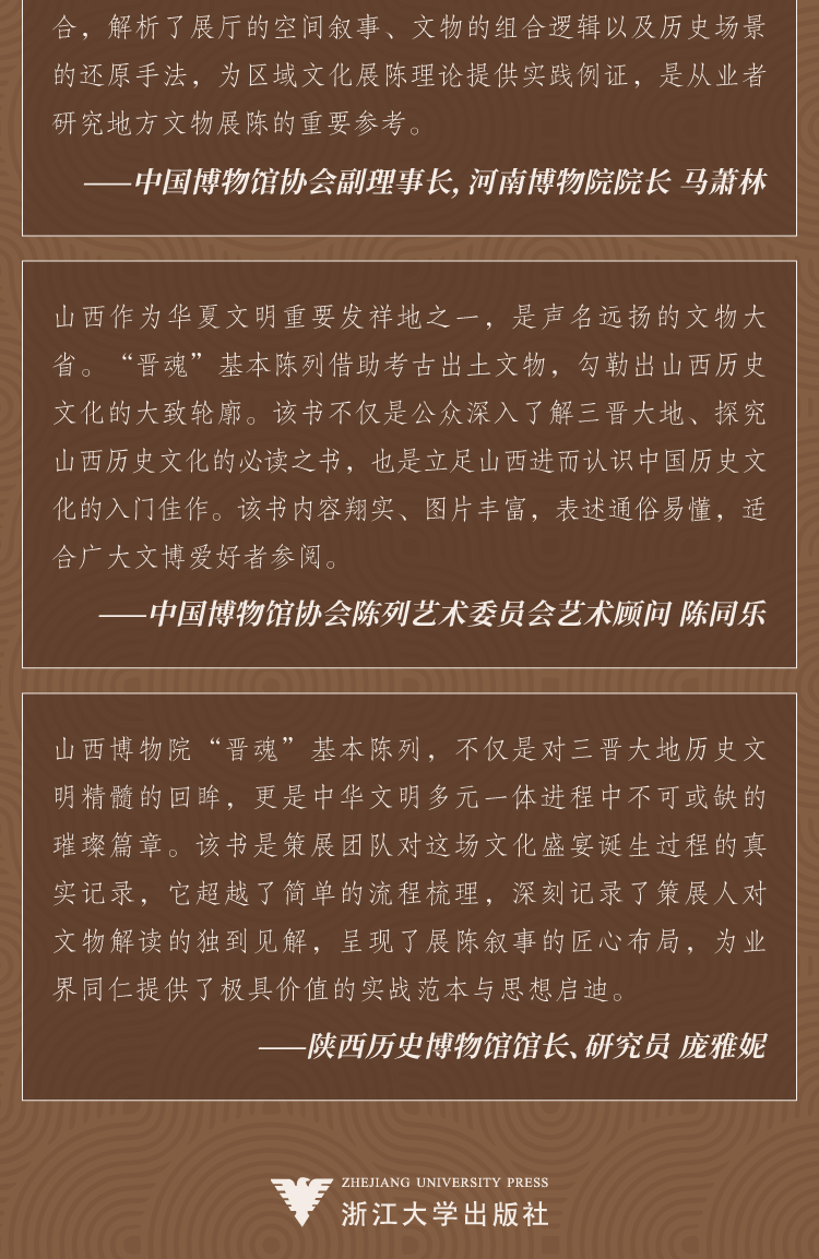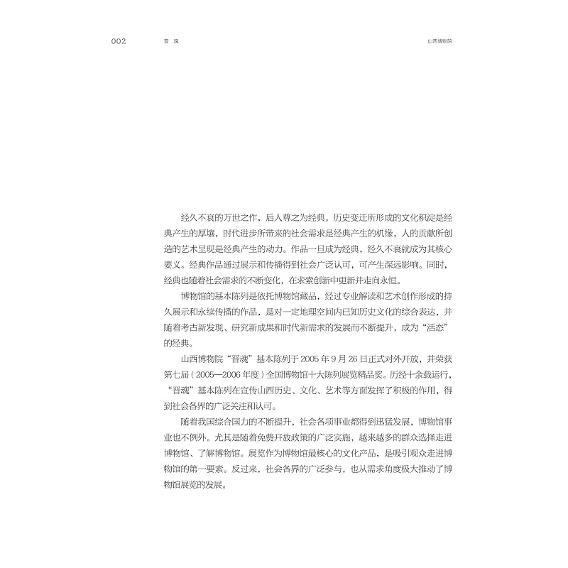 该书是晋地文物展陈研究的珍贵范本。它系统梳理了晋文化谱系与文物信息层级,呈现了展陈主题与学术研究的深度结合,解析了展厅的空间叙事、文物的组合逻辑以及历史场景的还原手法,为区域文化展陈理论提供实践例证,是从业者研究地方文物展陈的重要参考。