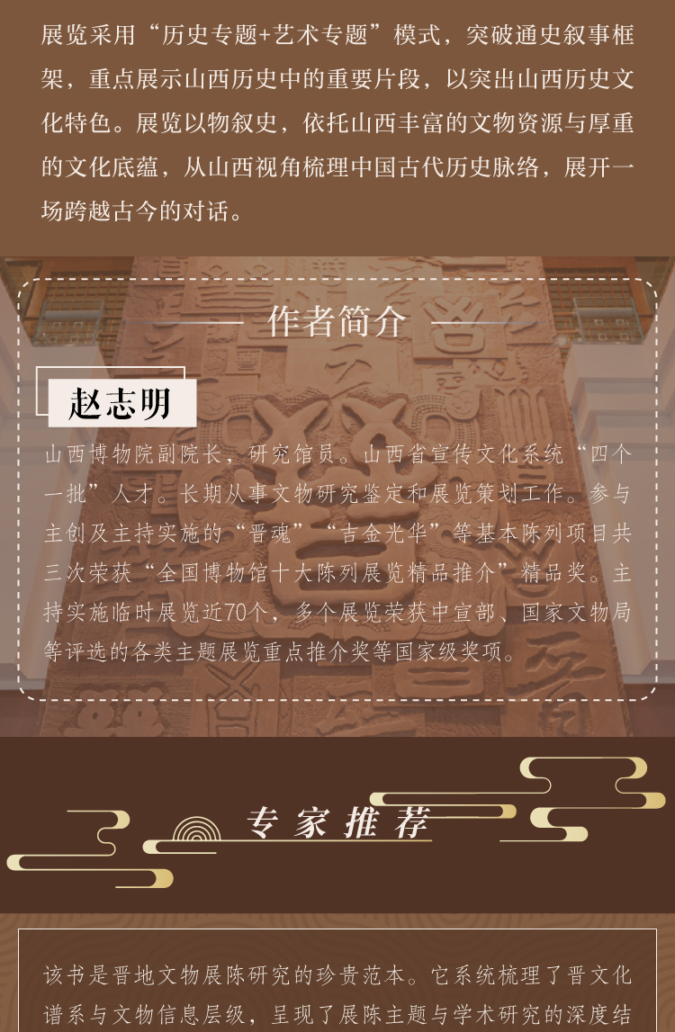 赵志明,山西博物院副院长,研究馆员。山西省宣传文化系统“四个一批”人才。长期从事文物研究鉴定和展览策划工作。参与主创及主持实施的“晋魂”“吉金光华”等基本陈列项目共三次荣获“全国博物馆十大陈列展览精品推介”精品奖。主持实施临时展览近70个,多个展览荣获中 xuan部、国家文物局等评选的各类主题展览重点推介奖等国jia级奖项。