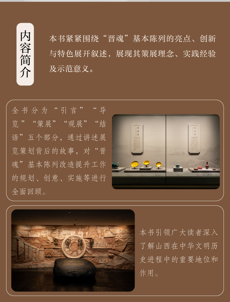 “晋魂”主题展览是山西博物院主馆的基本陈列,由七个历史专题和五个艺术专题组成。本书紧紧围绕“晋魂”基本陈列的亮点、创新与特色展开叙述,展现其策展理念、实践经验及示范意义。全书分为“引言”“导览”“策展”“观展”“结语”五个部分,通过讲述展览策划背后的故事,对“晋魂”基本陈列改造提升工作的规划、创意、实施等进行全面回顾,引领广大读者深入了解山西在中华文明历史进程中的重要地位和作用。