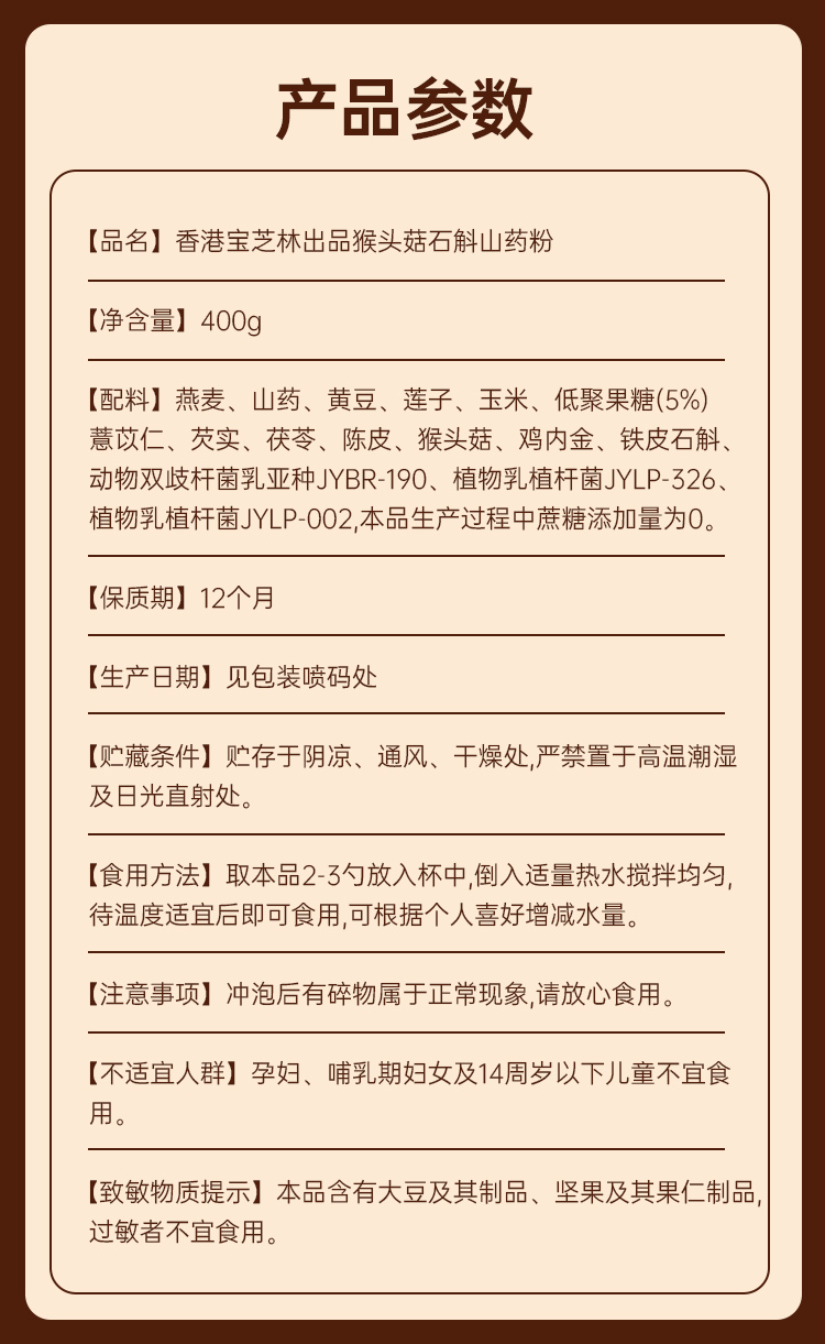 【甄选】宝芝林猴头菇石斛山药粉真材实料精细研磨细腻醇香400g/罐