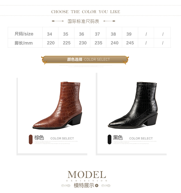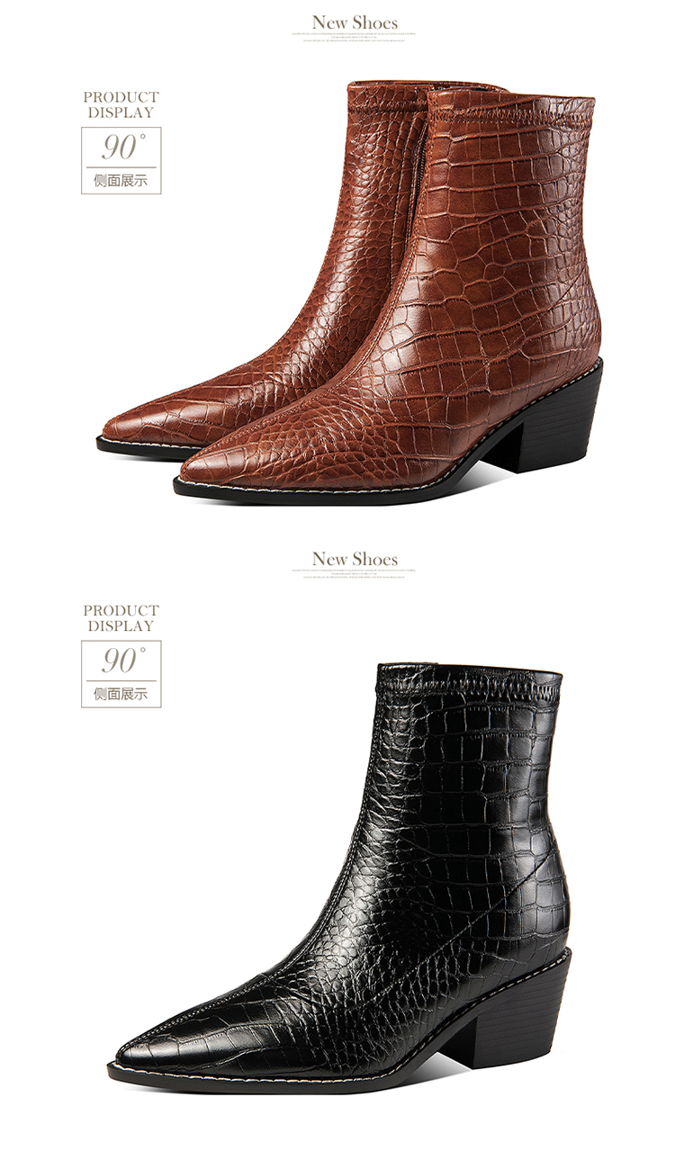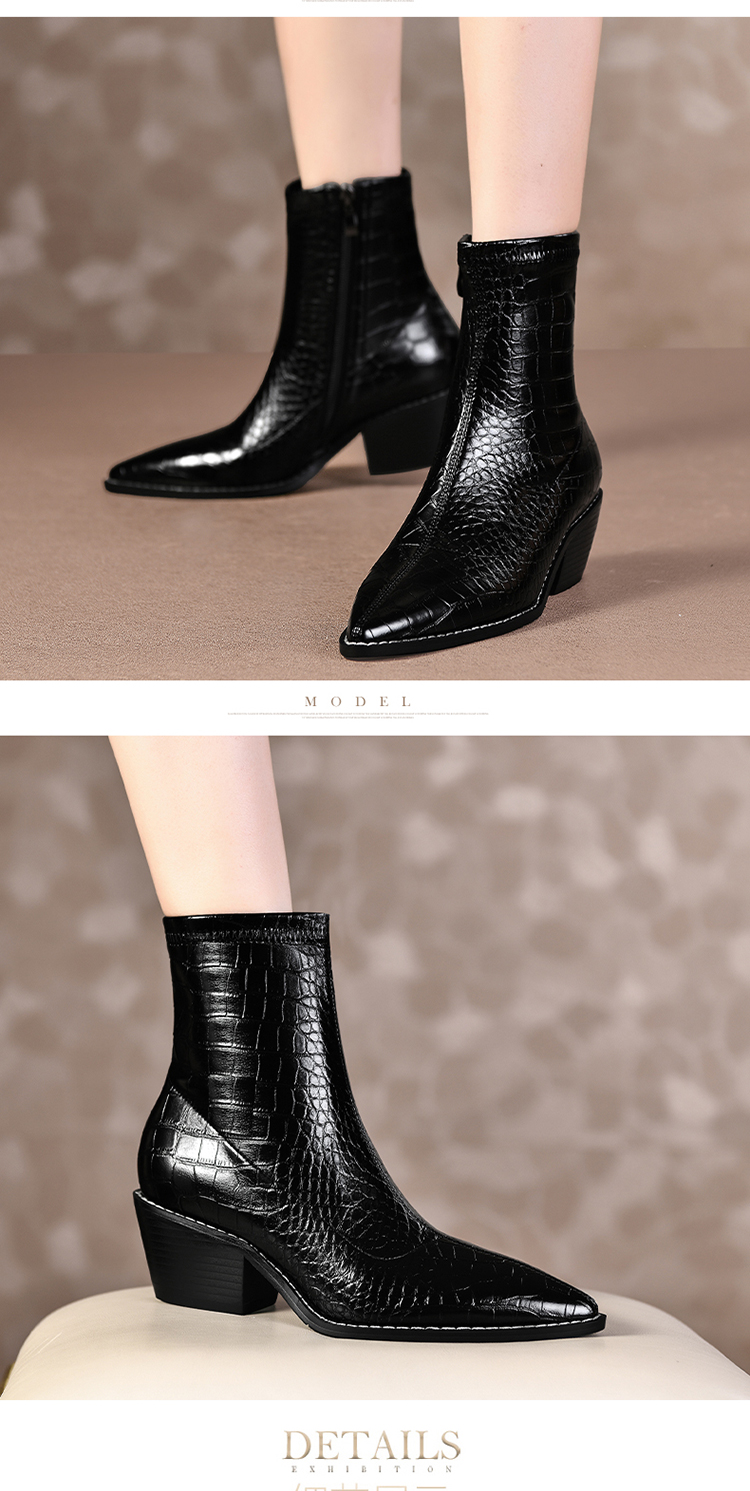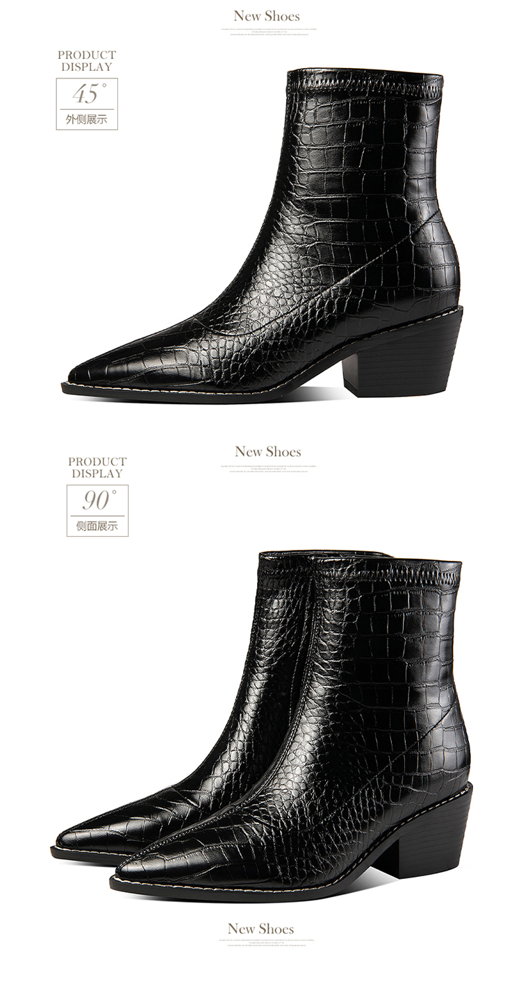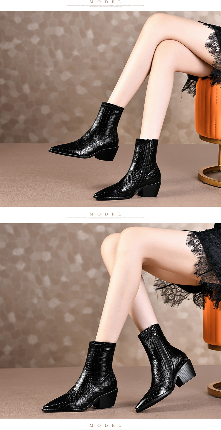 TJXY-XF8316C 秋季新款鳄鱼纹尖头粗跟中跟靴侧拉链时尚短筒气质百搭时装靴