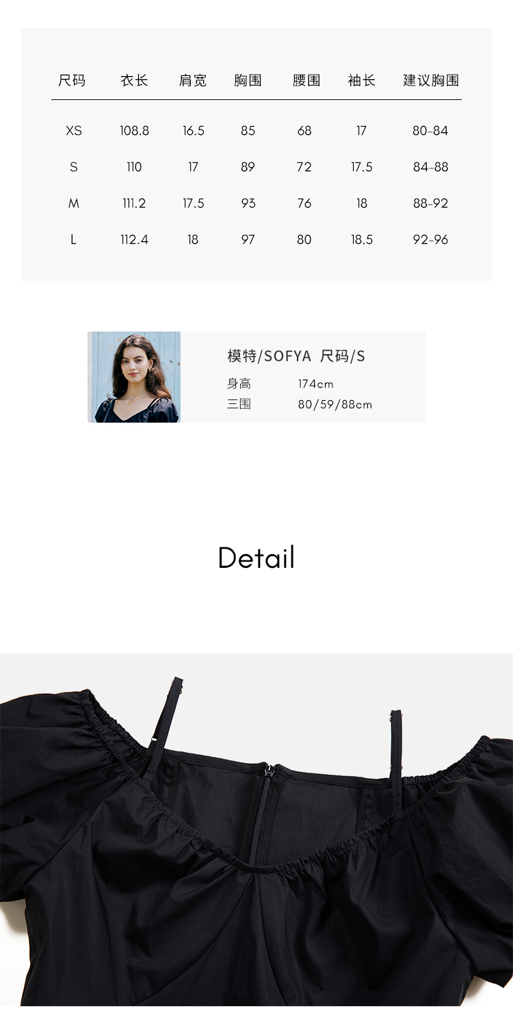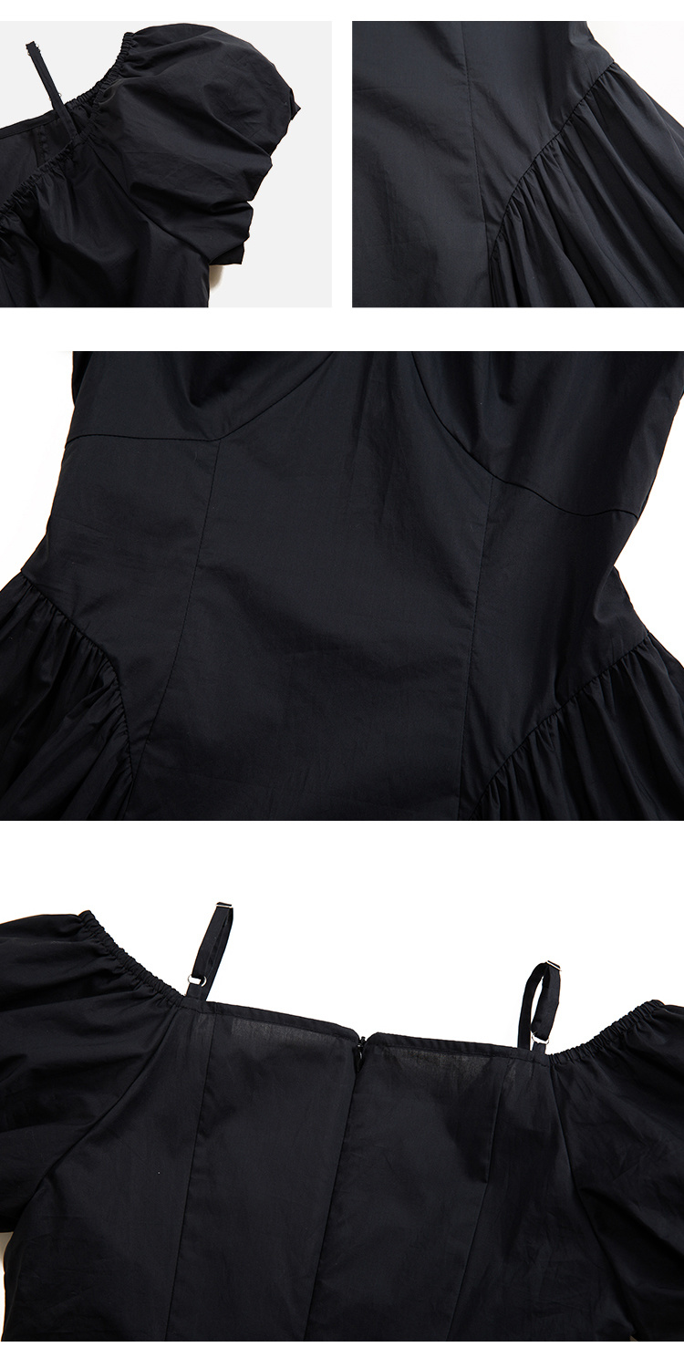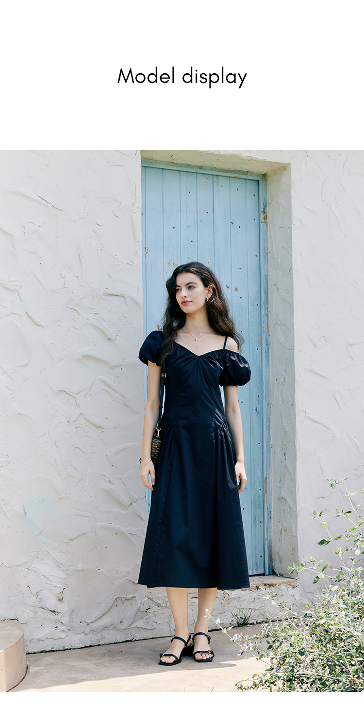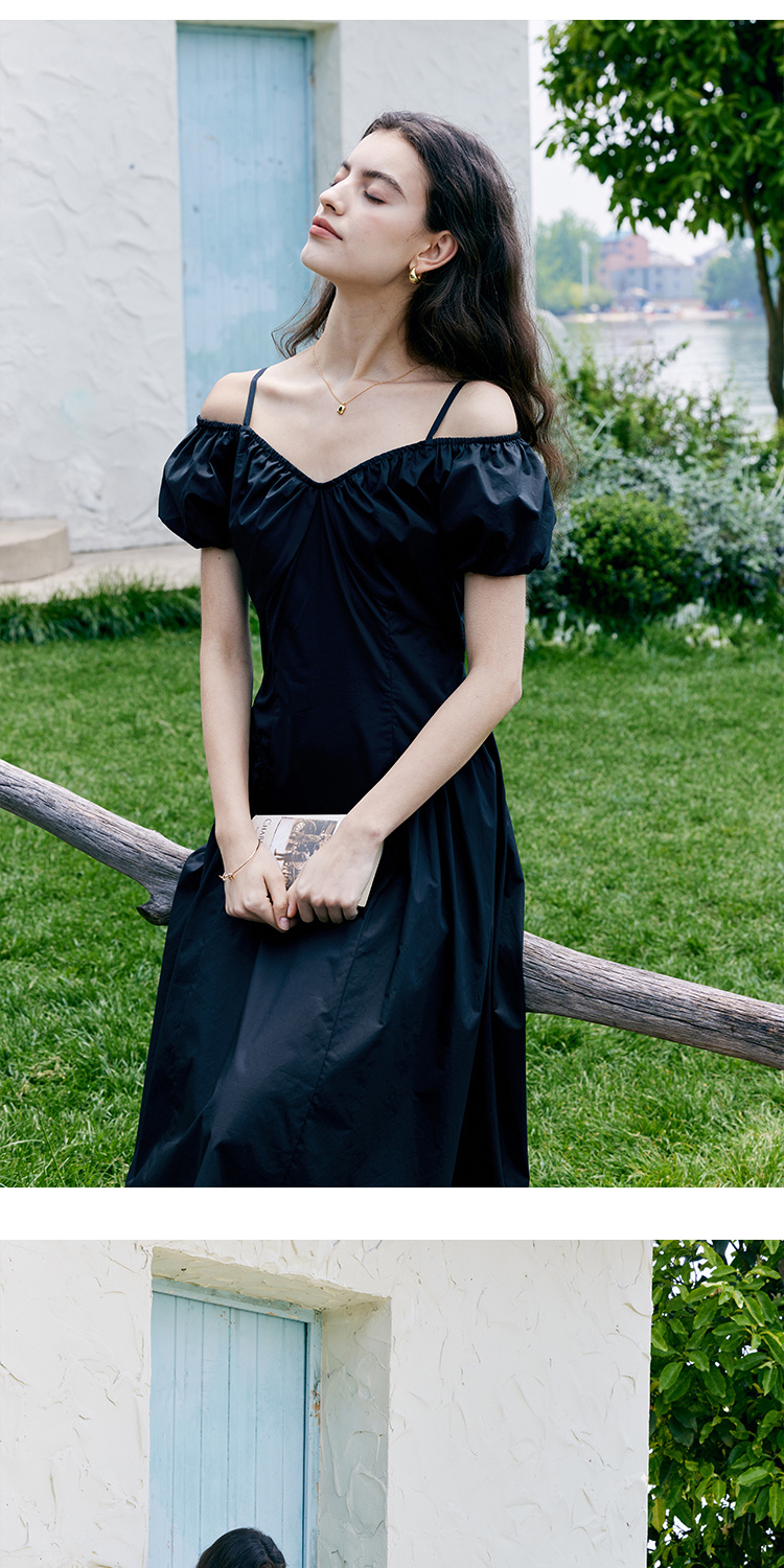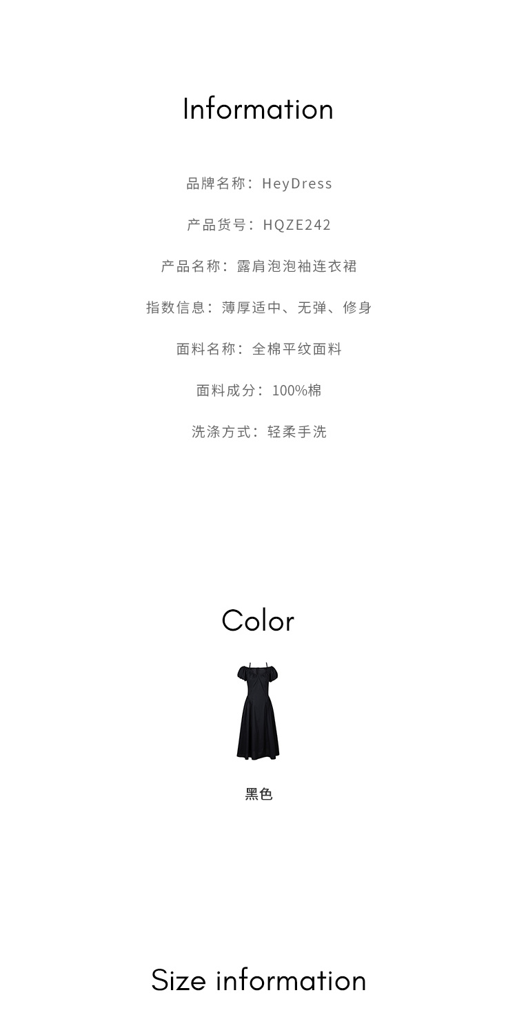 HeyDress黑色露肩连衣裙女夏季法式V领泡泡袖设计感气质a字裙子