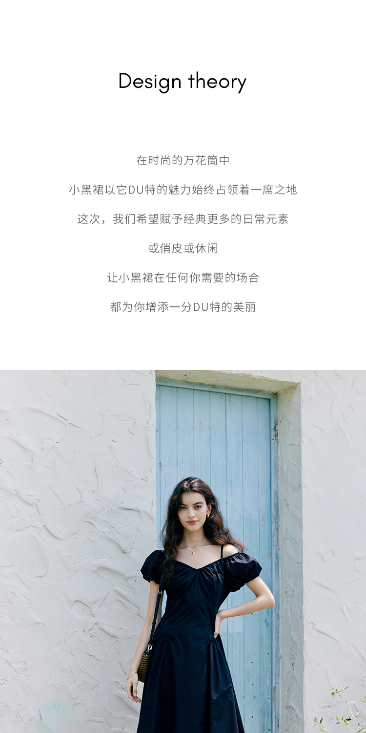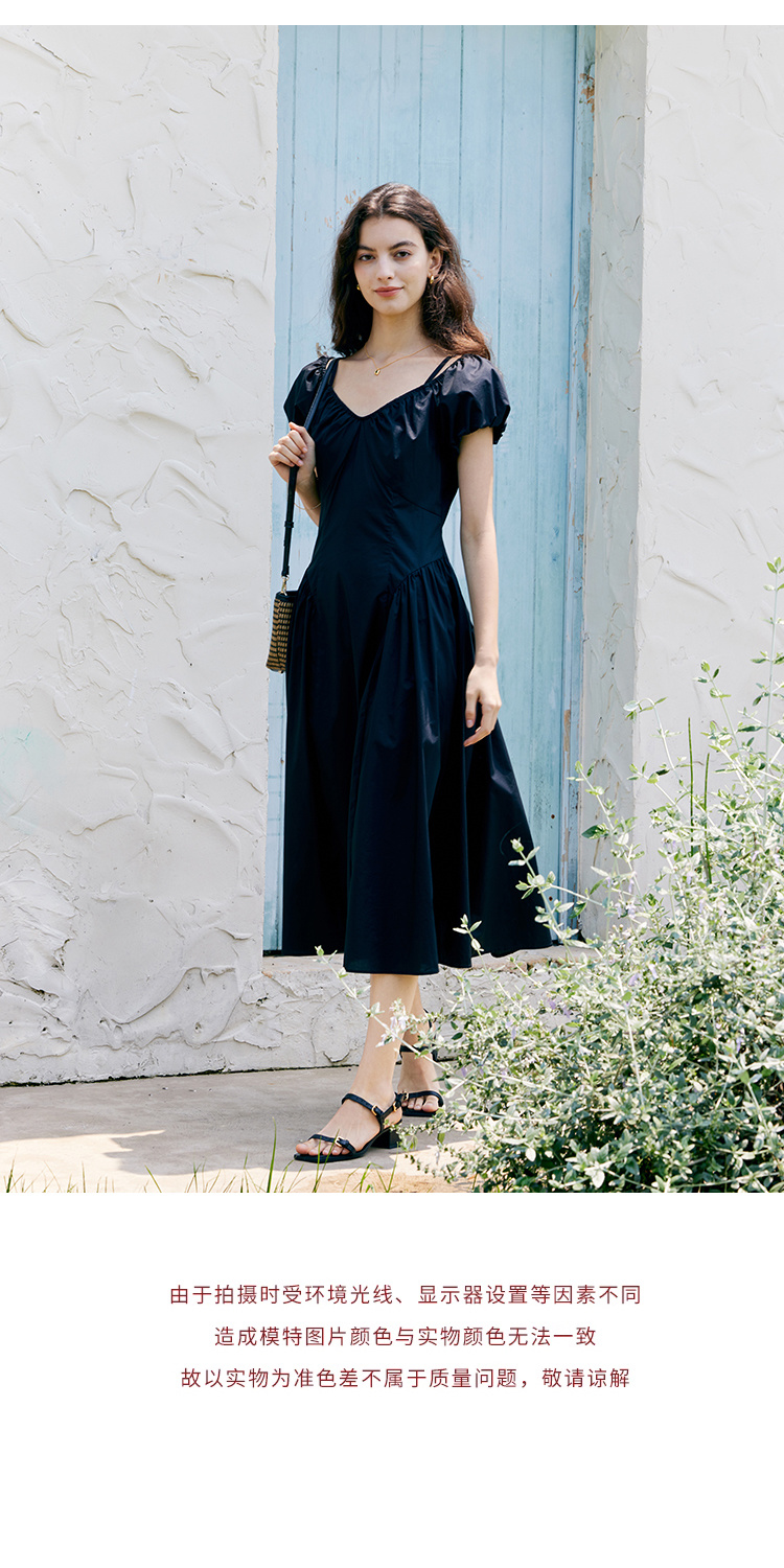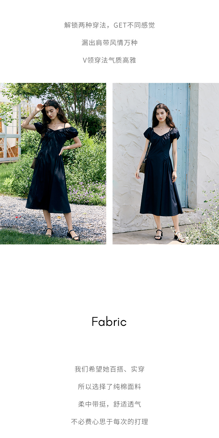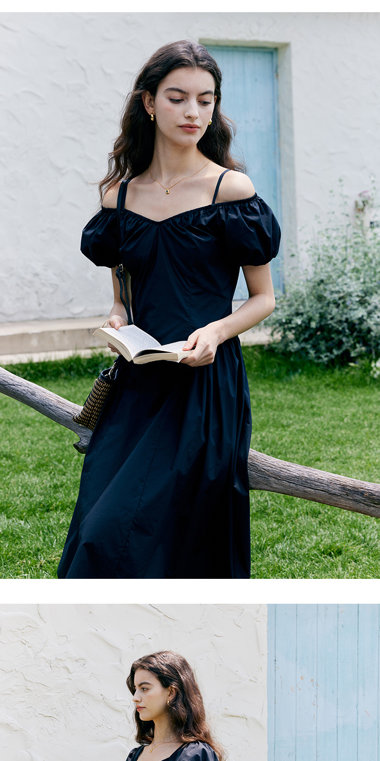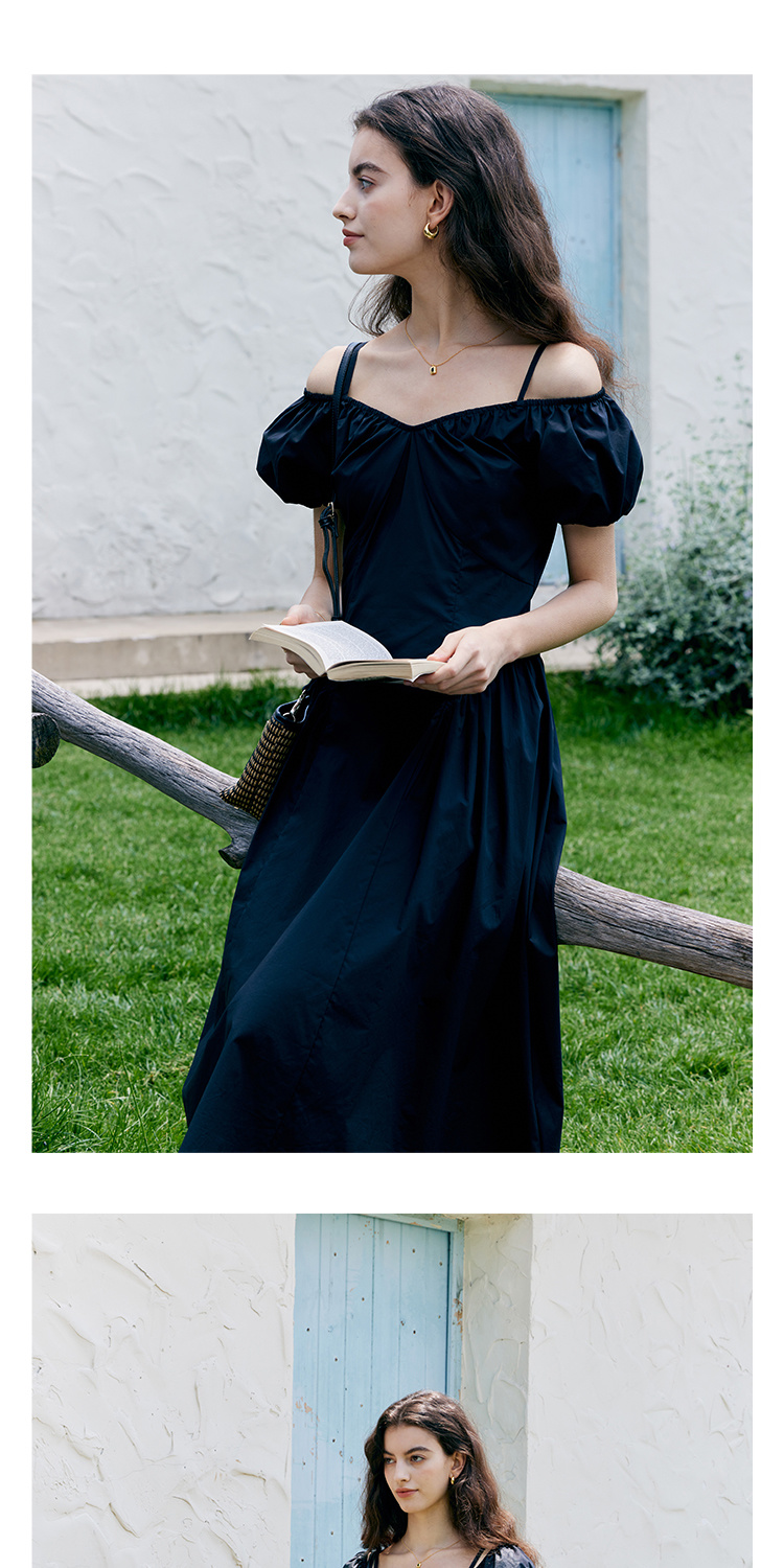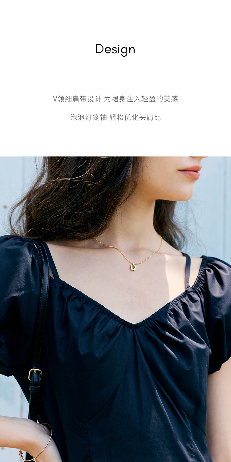 HeyDress黑色露肩连衣裙女夏季法式V领泡泡袖设计感气质a字裙子