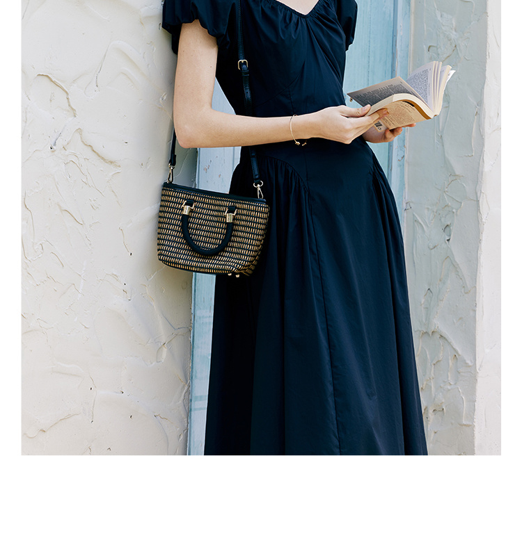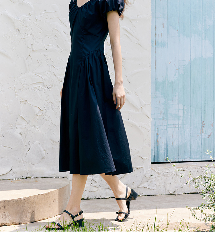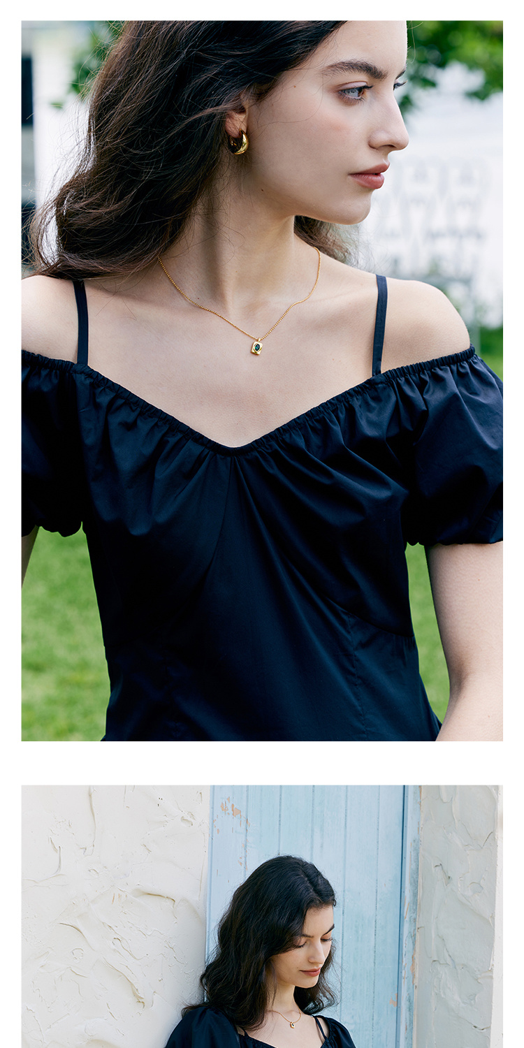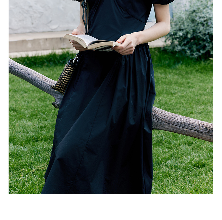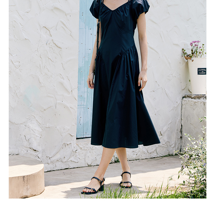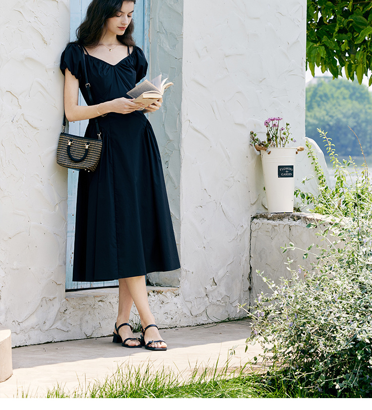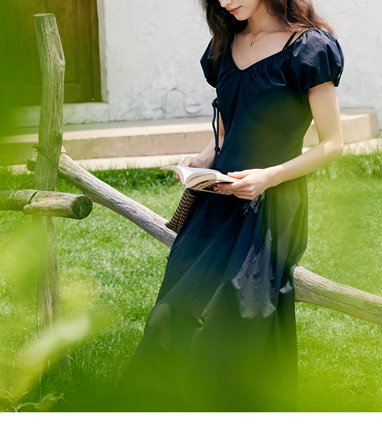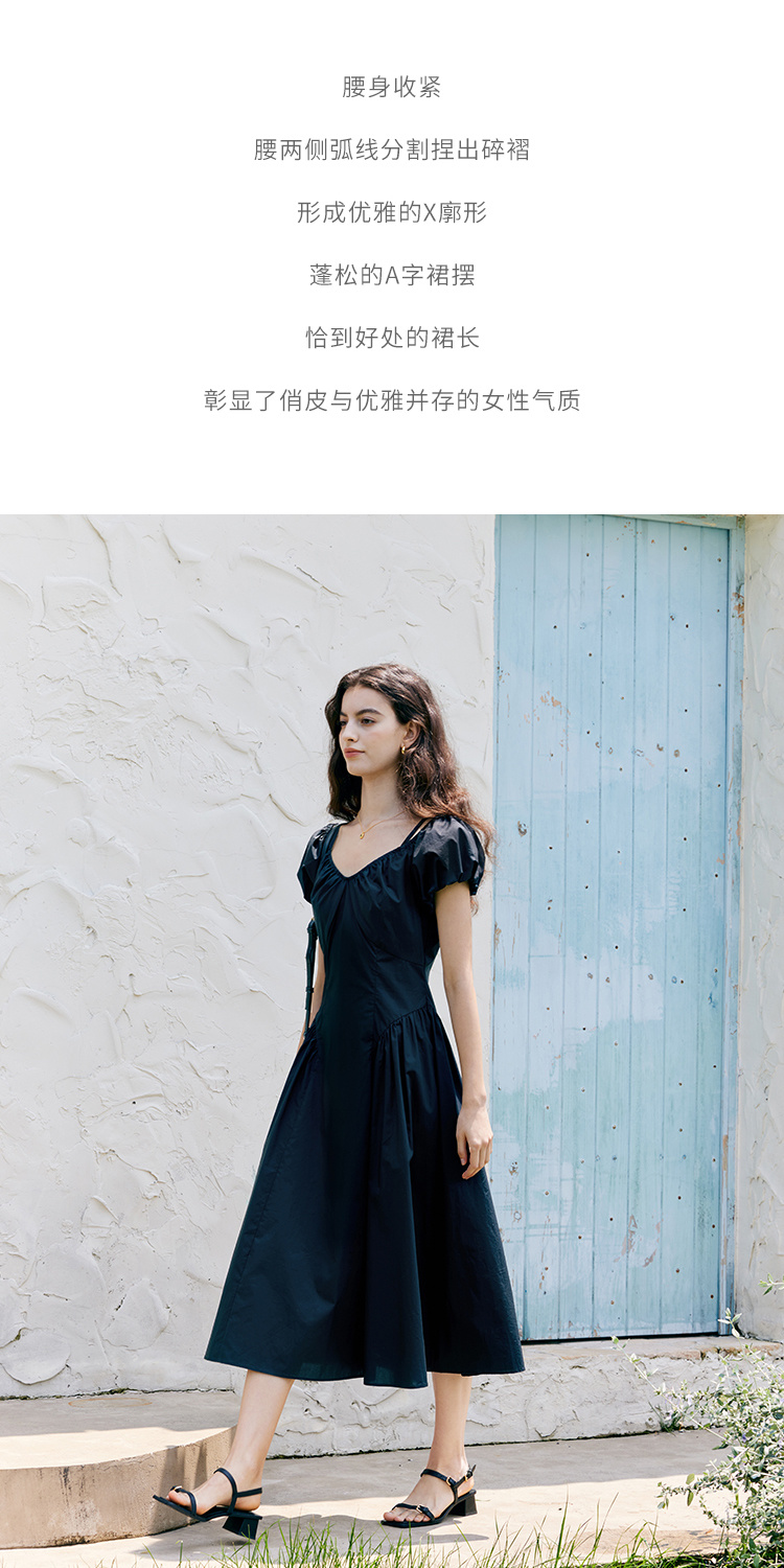HeyDress黑色露肩连衣裙女夏季法式V领泡泡袖设计感气质a字裙子