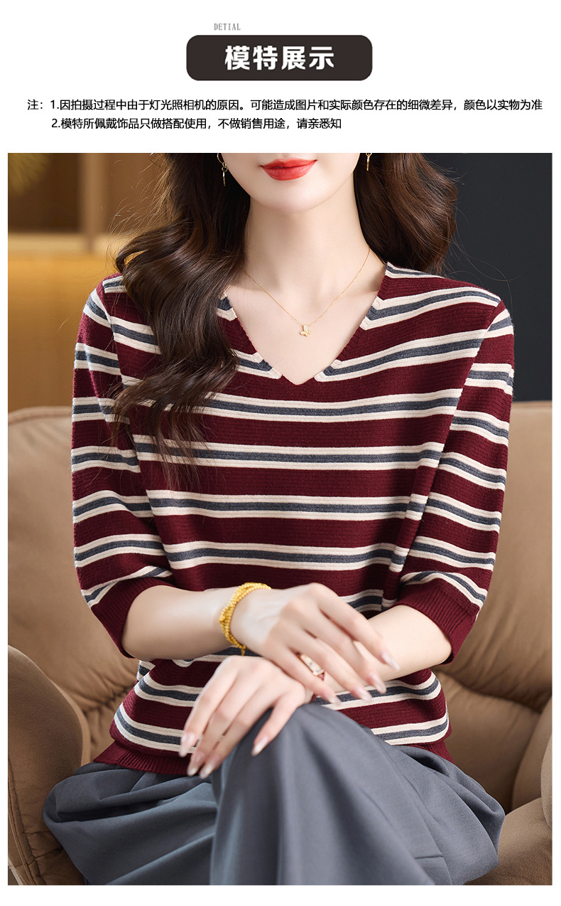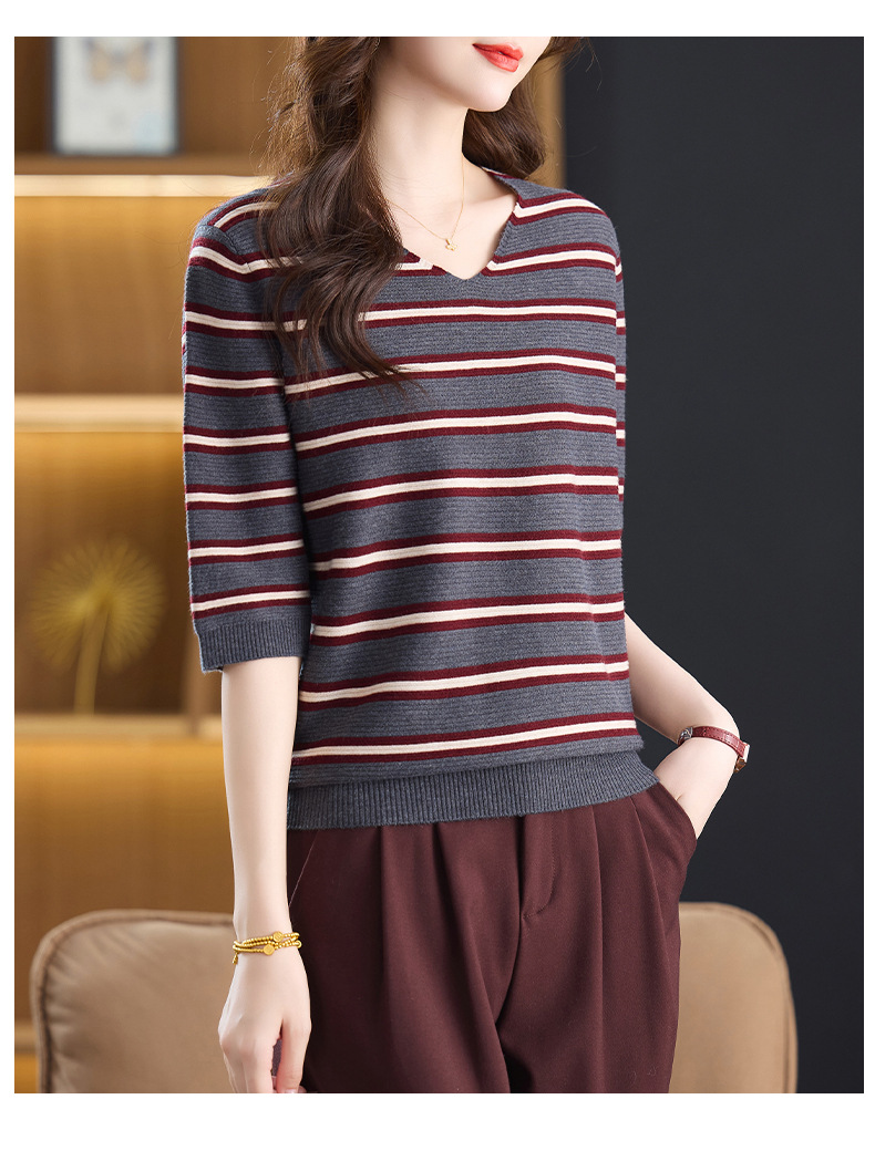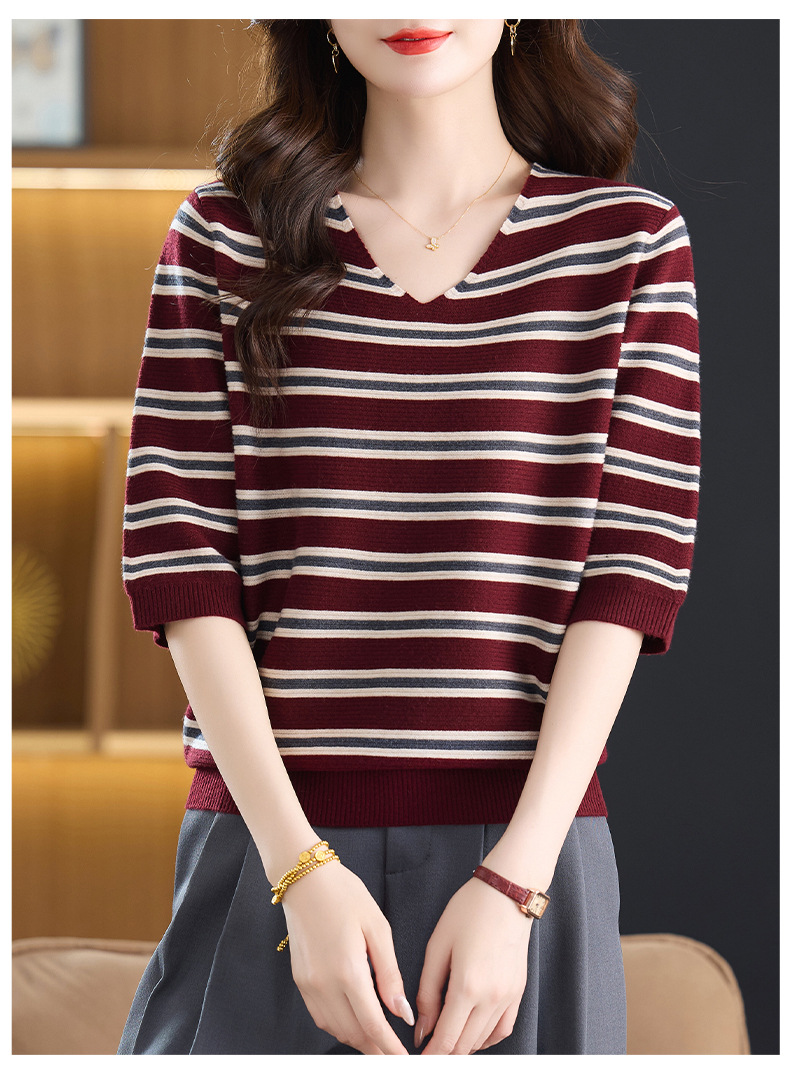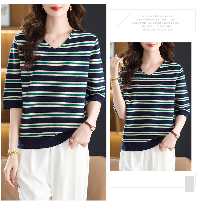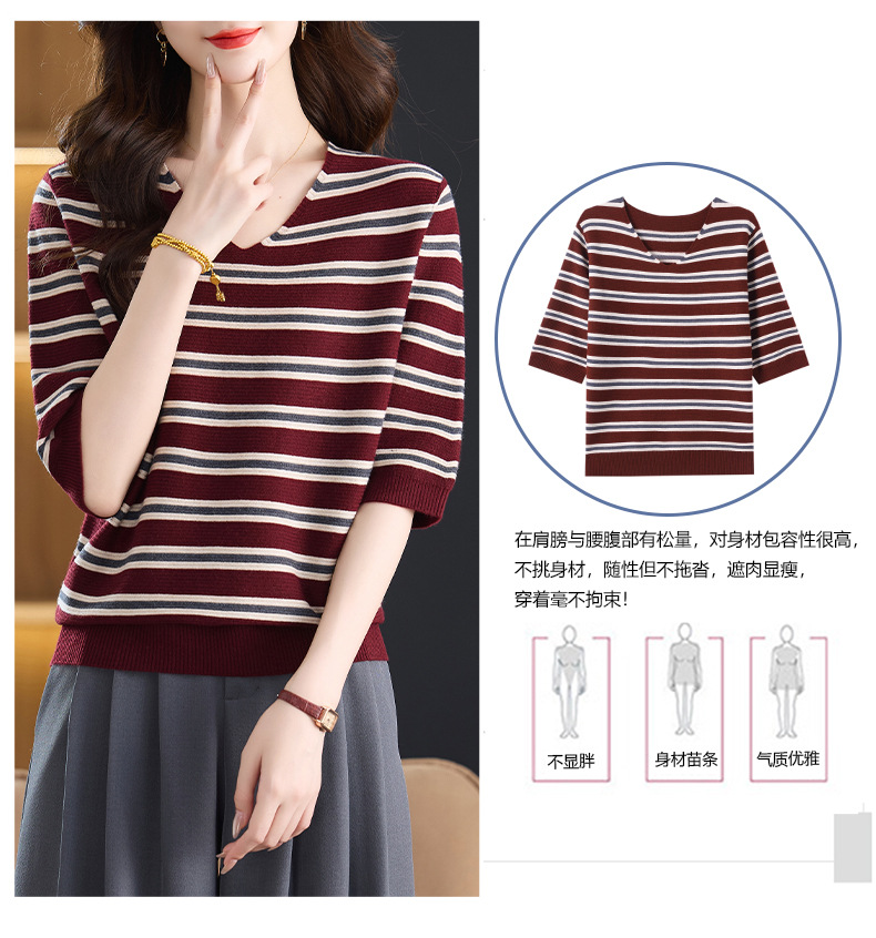 CC 5-6515秋装短袖针织衫显瘦遮肉V领上衣条纹洋气