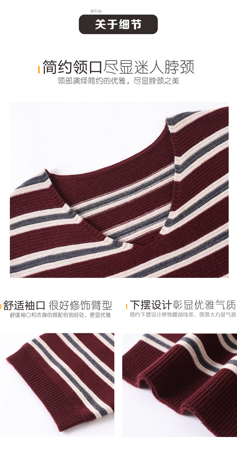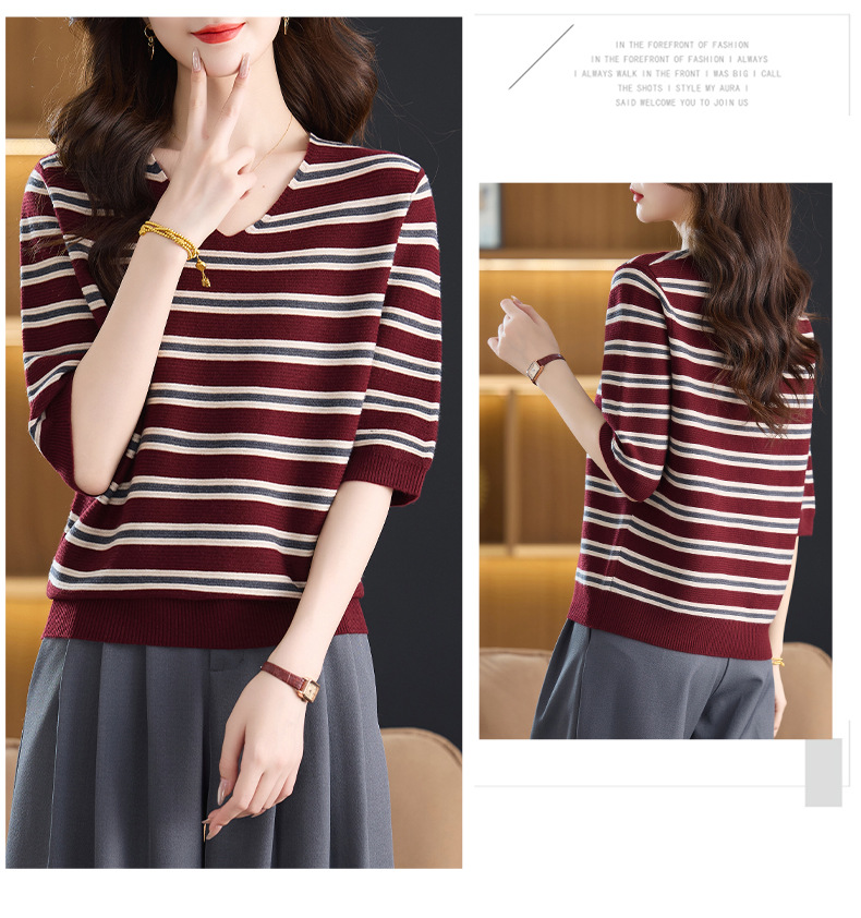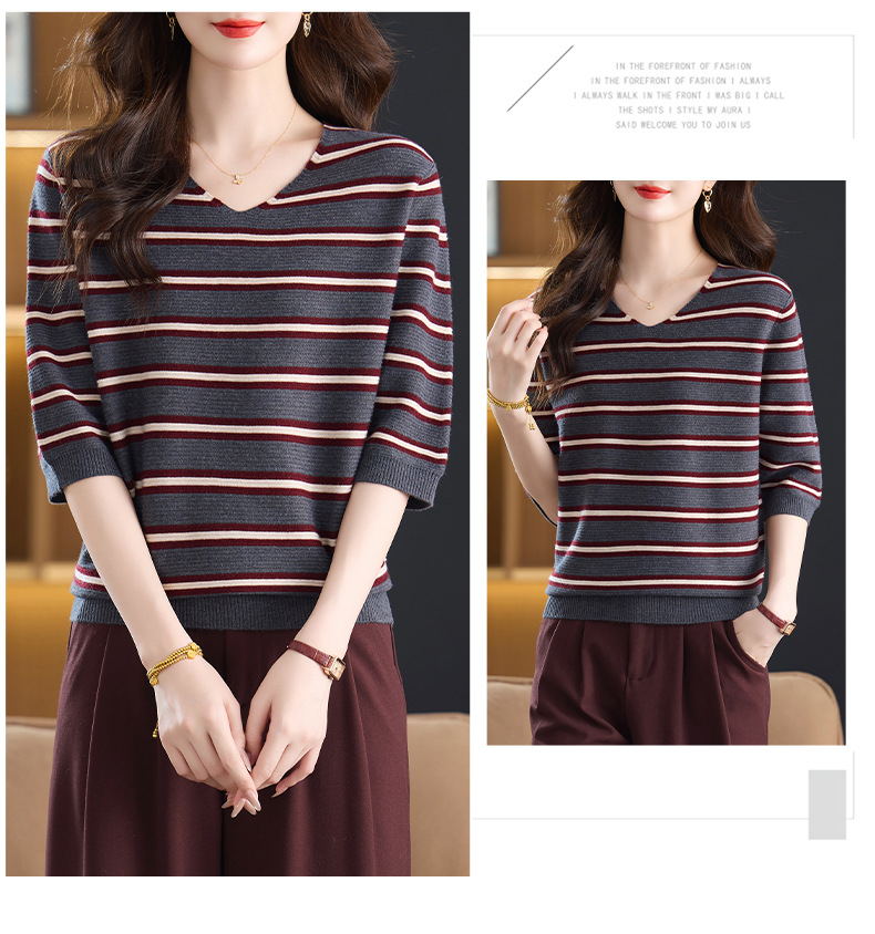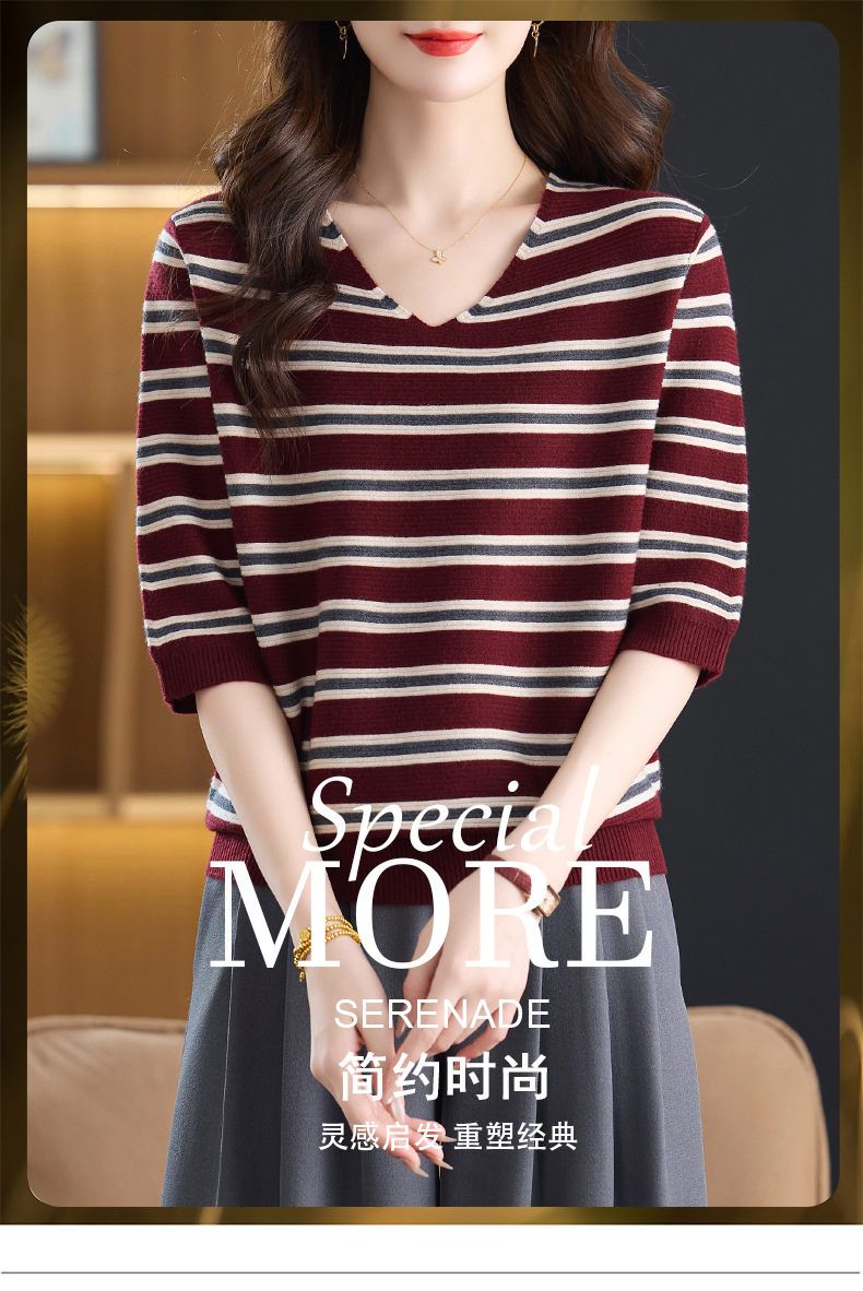 CC 5-6515秋装短袖针织衫显瘦遮肉V领上衣条纹洋气