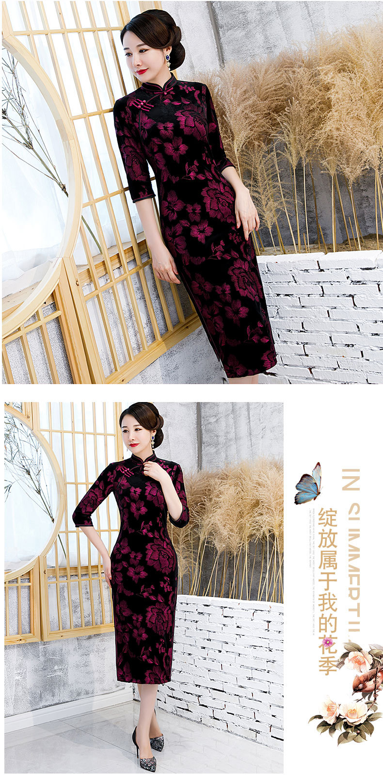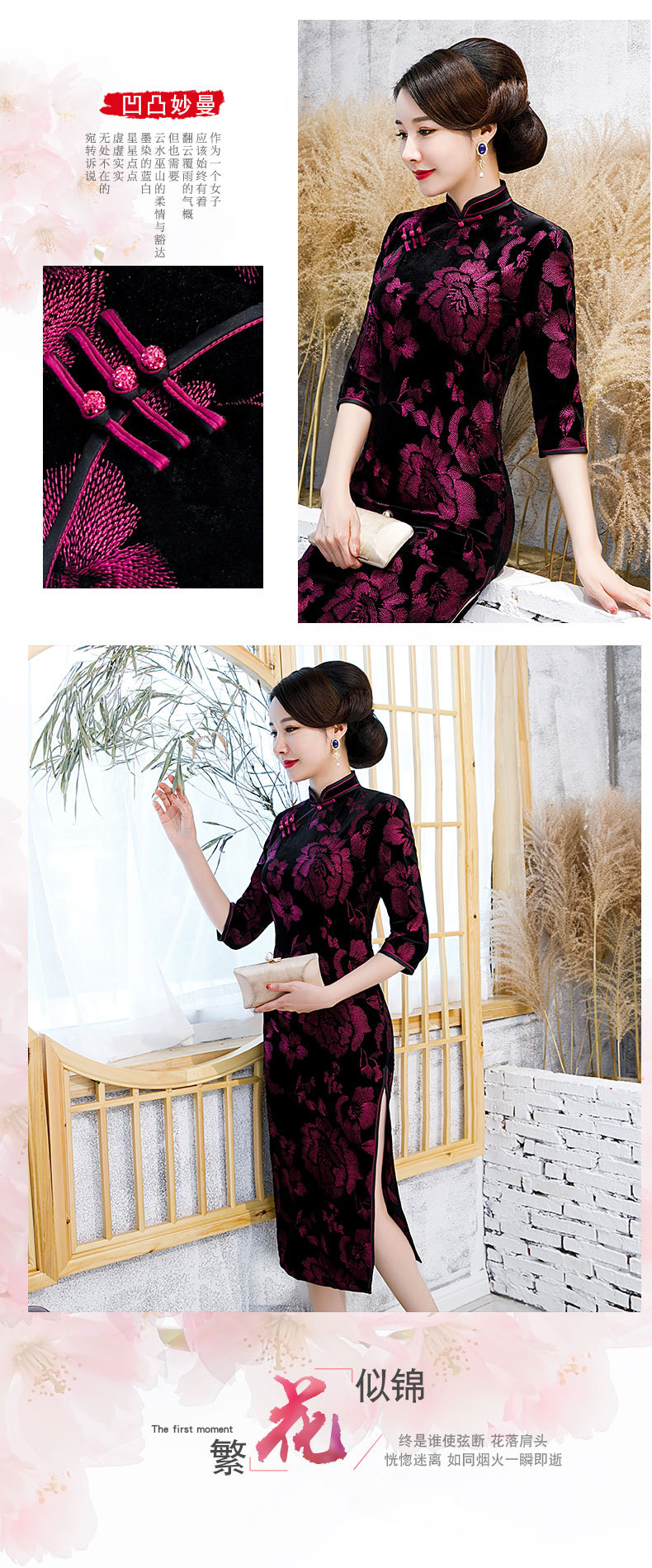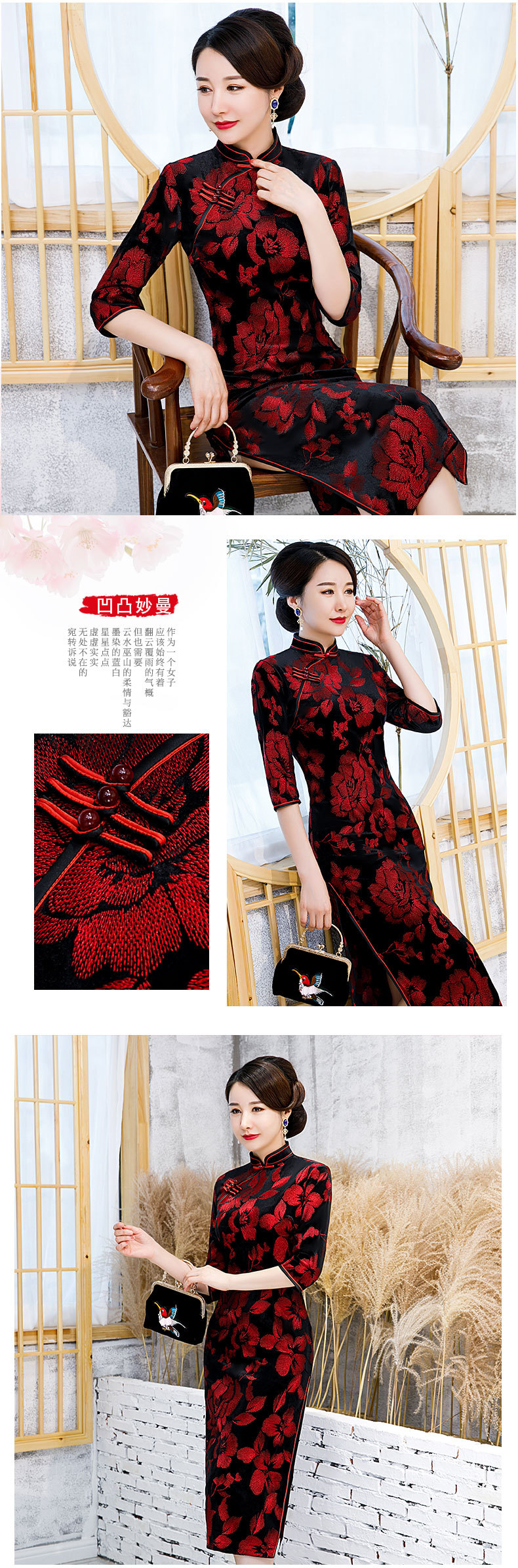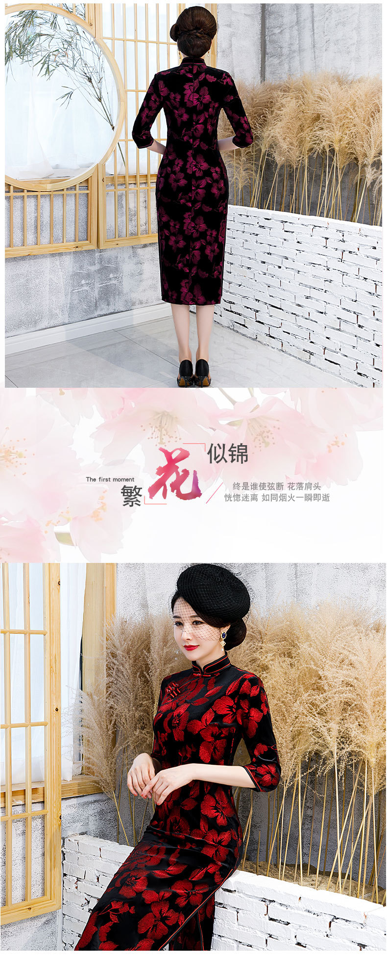JLM-9025秋季新款丝绒旗袍长款绣花走秀旗袍