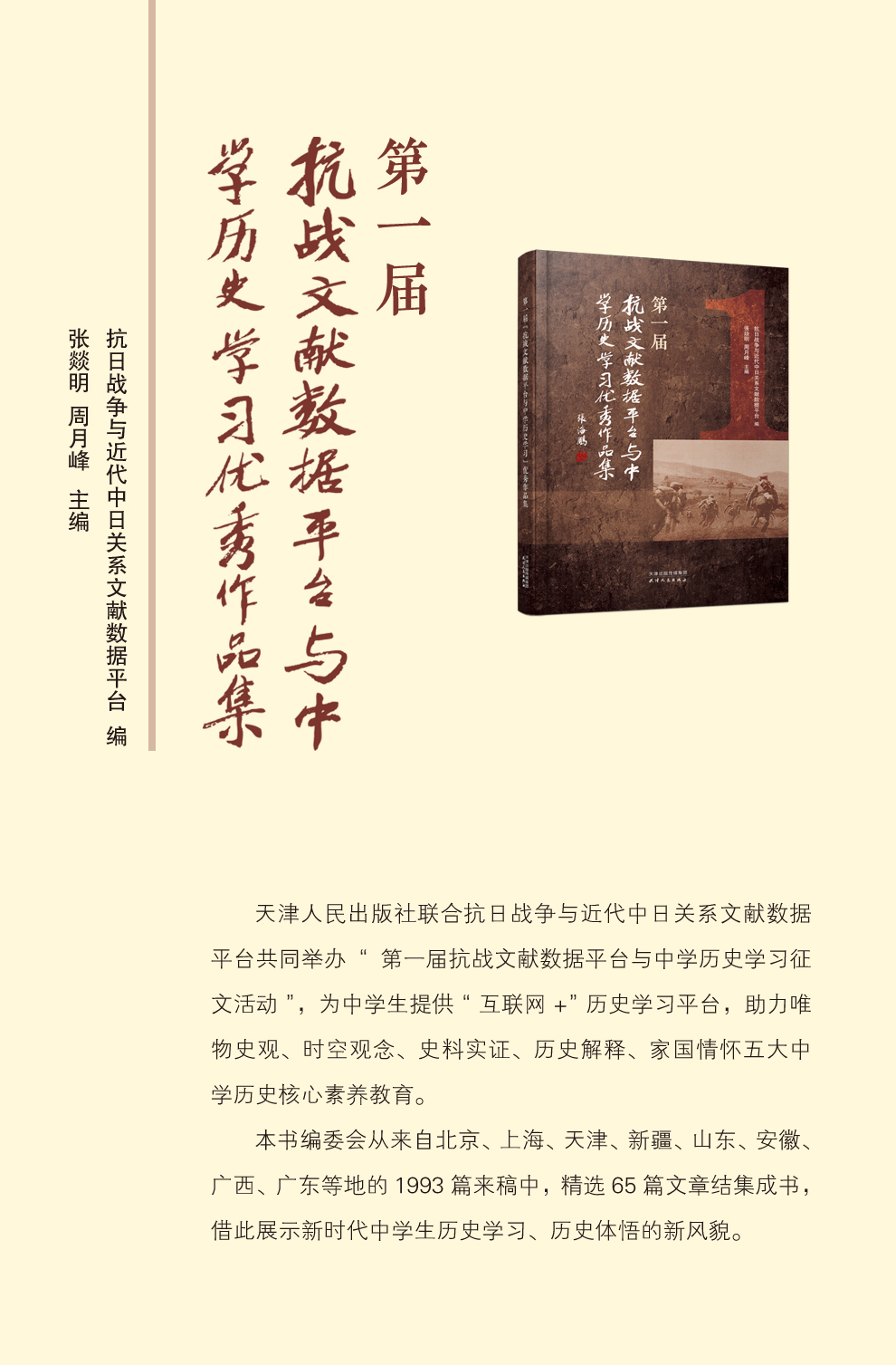 本书是“抗战文献数据平台与中学历史学习”征文活动的优秀作品集。此次活动由天津人民出版社及抗战文献平台共同主办,组委会从1993篇来稿中精选文章结集而成本书。内容展示了各位作者从抗战文献数据库平台的资料出发,选取视角成文,是当代中学生自我进行的史学作品的书写,也是教学课堂和史学研究的对话,展示了课堂教学的成果,具有良好的教学示范意义,有助于使学术成果普及化和社会化。