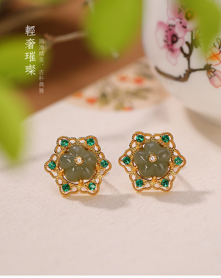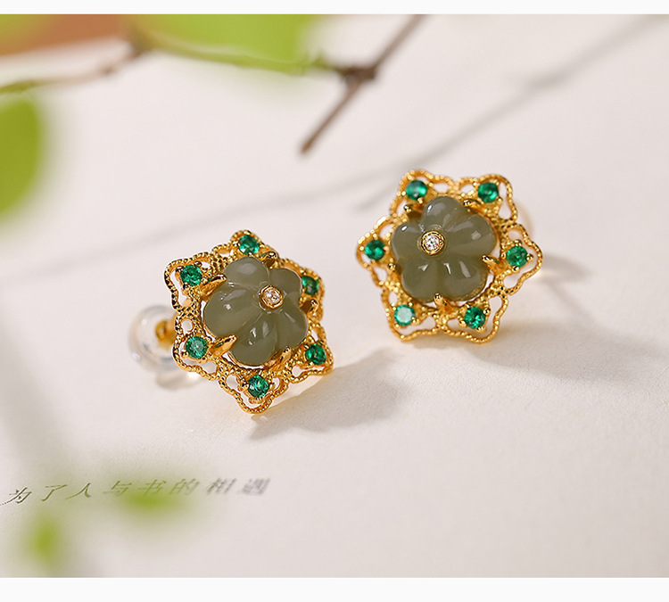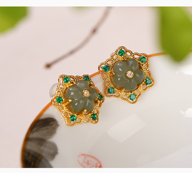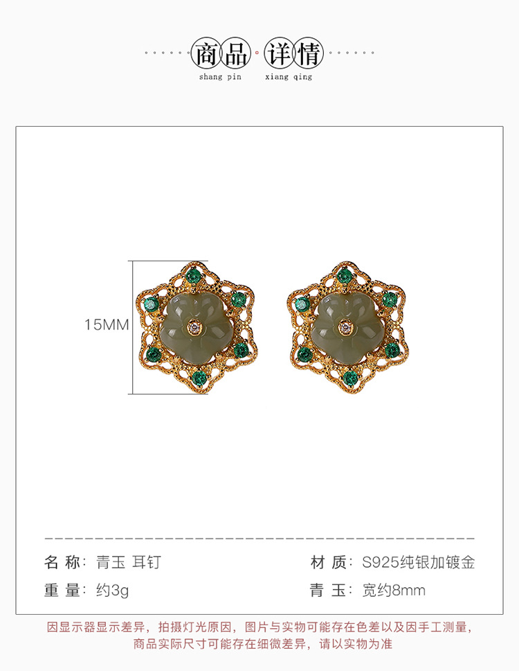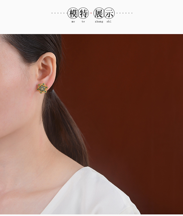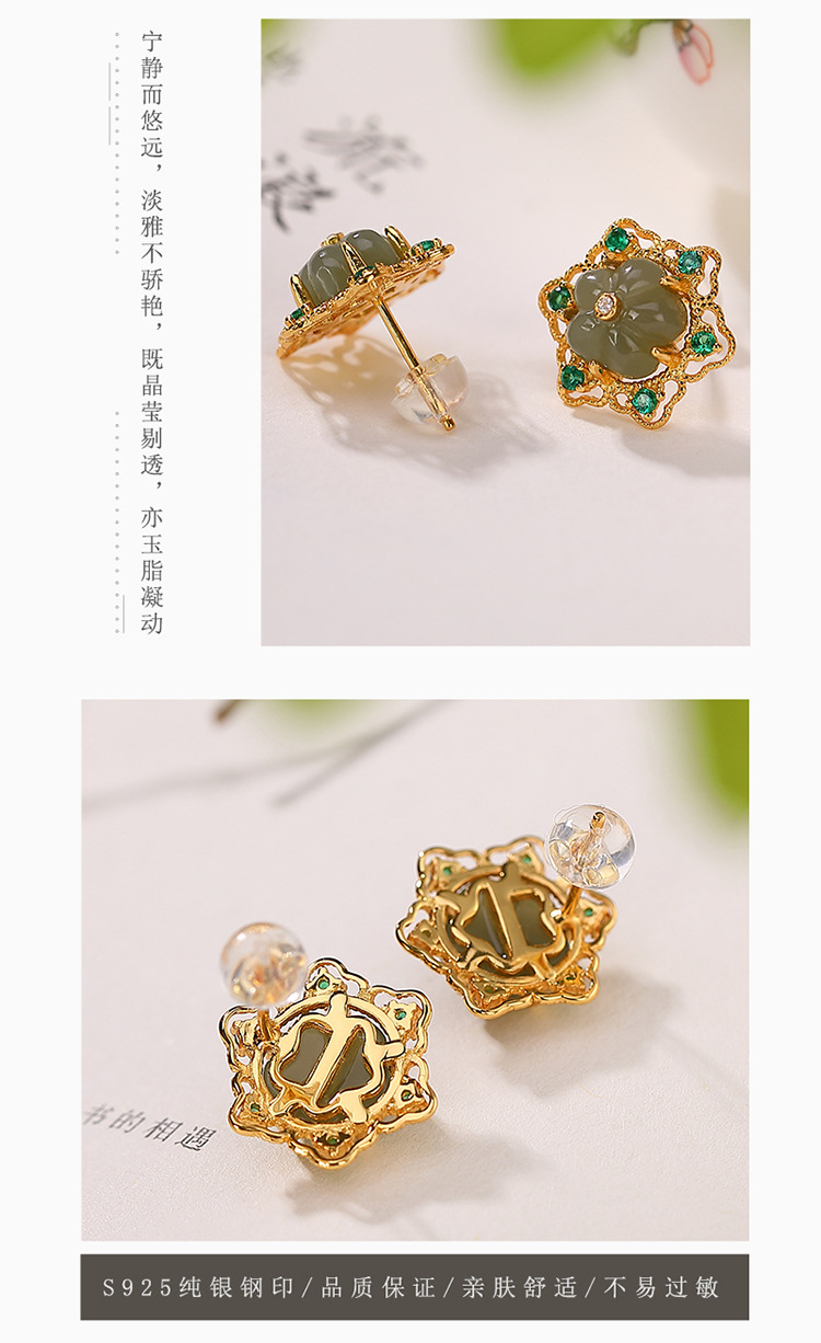 S925纯银镀金和田青玉耳钉复古个性南瓜耳钉 CW0115-66