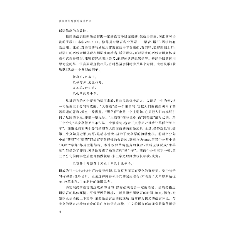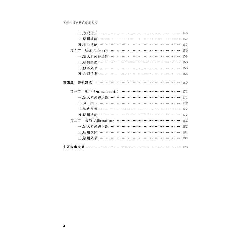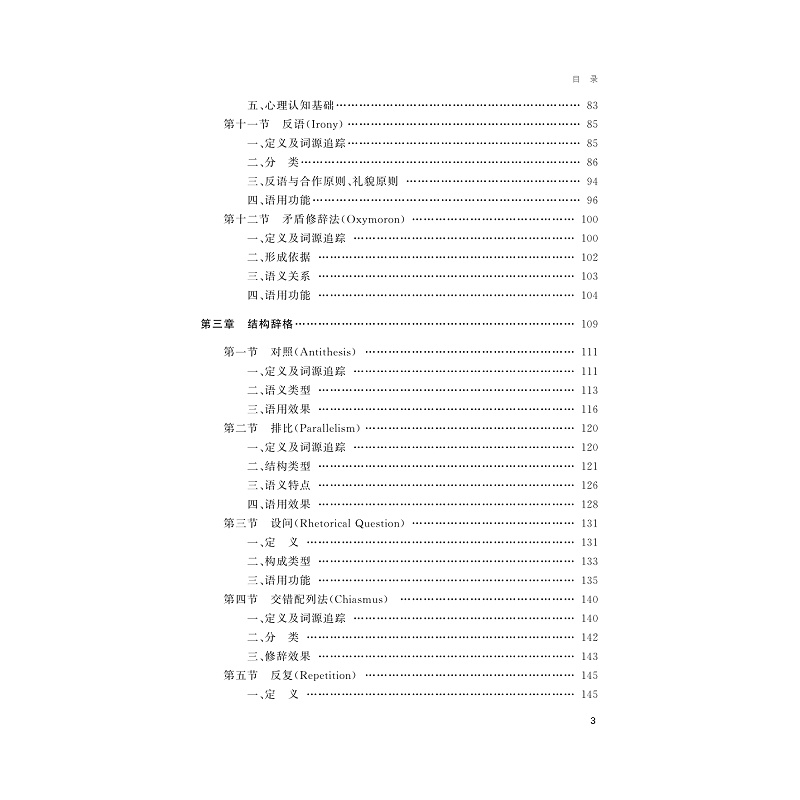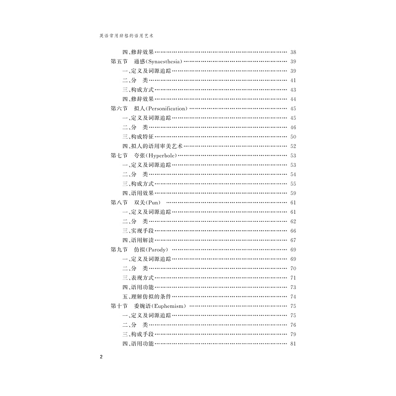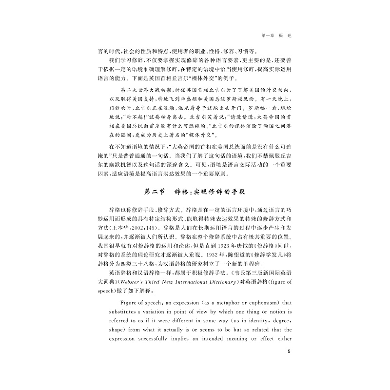 本书选定20种常见英语修辞格,首先,按照定义、词源追踪、结构与分类等方面进行分析和阐释;通过词源追踪进一步从定义、起源等方面明确阐述该修辞格的特点,加深读者对辞格的理解;通过辞格构造和分类的详述,对该修辞格进行学理上的分析介绍。其次,简要梳理该修辞格的研究动态,使读者对该辞格的研究现状有一个比较清晰的概念,拓展相关知识,理清自己的研究思路。最后,重点从语用学、跨文化交际角度,分析影响英语修辞格运用的社会、文化、心理、认知等因素;通过大量的修辞典型实例分析,使读者认识到如何依据情景,恰当运用语言材料,实现话语的语用目的,提高语言的敏感性和话语表达的恰当性、艺术性。