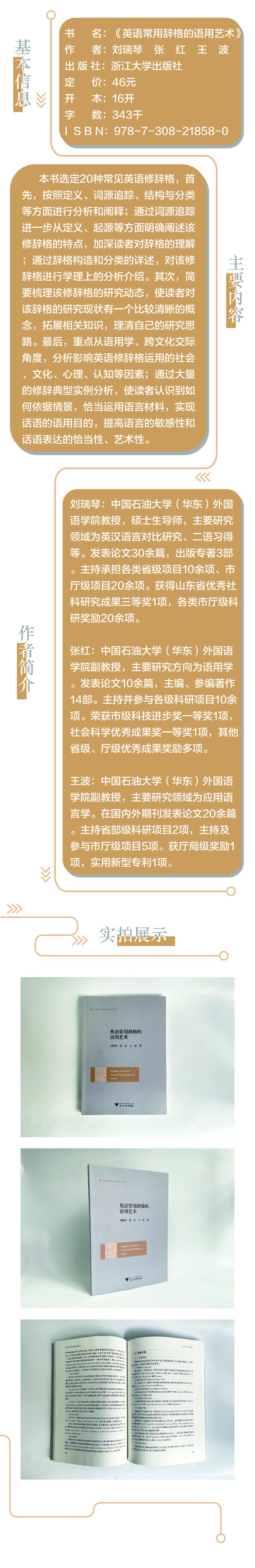 刘瑞琴:中国石油大学(华东)外国语学院教授,硕士生导师,主要研究领域为英汉语言对比研究、二语习得等。发表论文30余篇,出版专著3部。主持承担各类省级项目10余项、市厅级项目20余项。获得山东省优秀社科研究成果三等奖1项,各类市厅级科研奖励20余项。