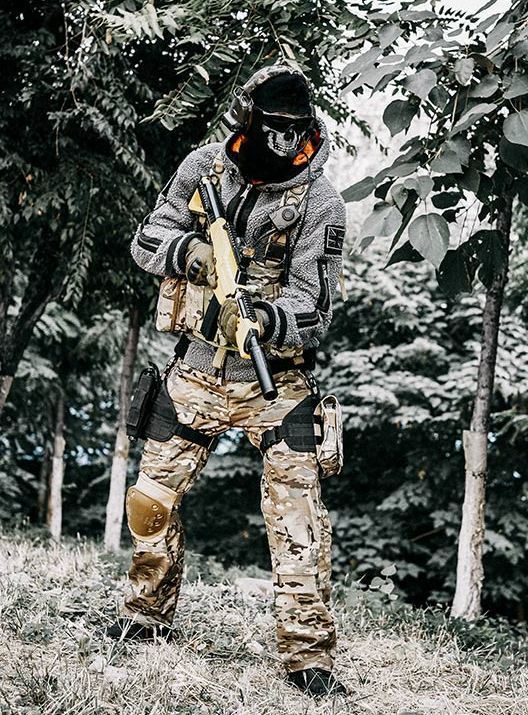 上身穿着灰色的作战服