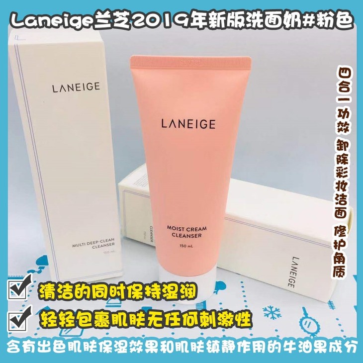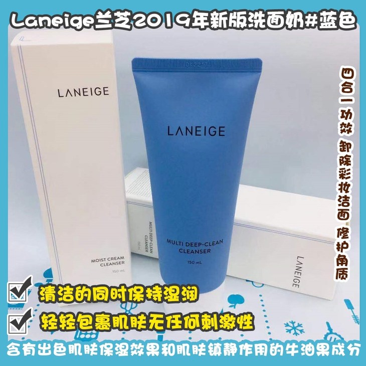 Laneige兰芝2019年新版洗面奶#蓝色/#粉色👍新款兰芝洗面奶🉐,性价比高的洗面奶首选❗成分升级⬆,温和清洁脸部污垢和老化角质,清洁的同时保持湿润💦。泡沫非常温和细腻☁,轻轻包裹肌肤无任何刺激性❌,含有出色肌肤保湿效果和肌肤镇静作用的牛油果成分🥑,洁面后滋润不紧绷哦☺。#蓝色💙四合一功效,卸除彩妆洁面,修护角质,清洁泡沫型,适合任何肤质/#粉色💖三合一功效,滋润保湿清洁型,适合中干皮肤质。
