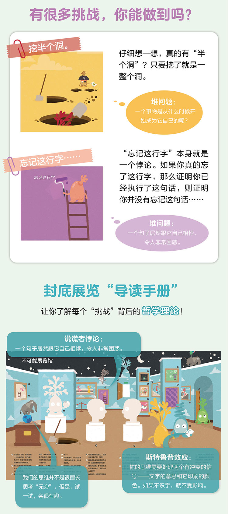 书中的每一页都会提出不同的问题或任务,要求我们去执行,你的大脑会高速运转,同时意识到自己的思维的局限性。而这一切都是为了帮助我们意识到我们的思维过程(即元认知)。最后一个跨页对正文中出现过的每一个悖论做了更详细的说明,引导我们思考:当我们开始思考时,思维正在发生什么变化?是什么在支配着我们?会不会陷入一些误区中?……
