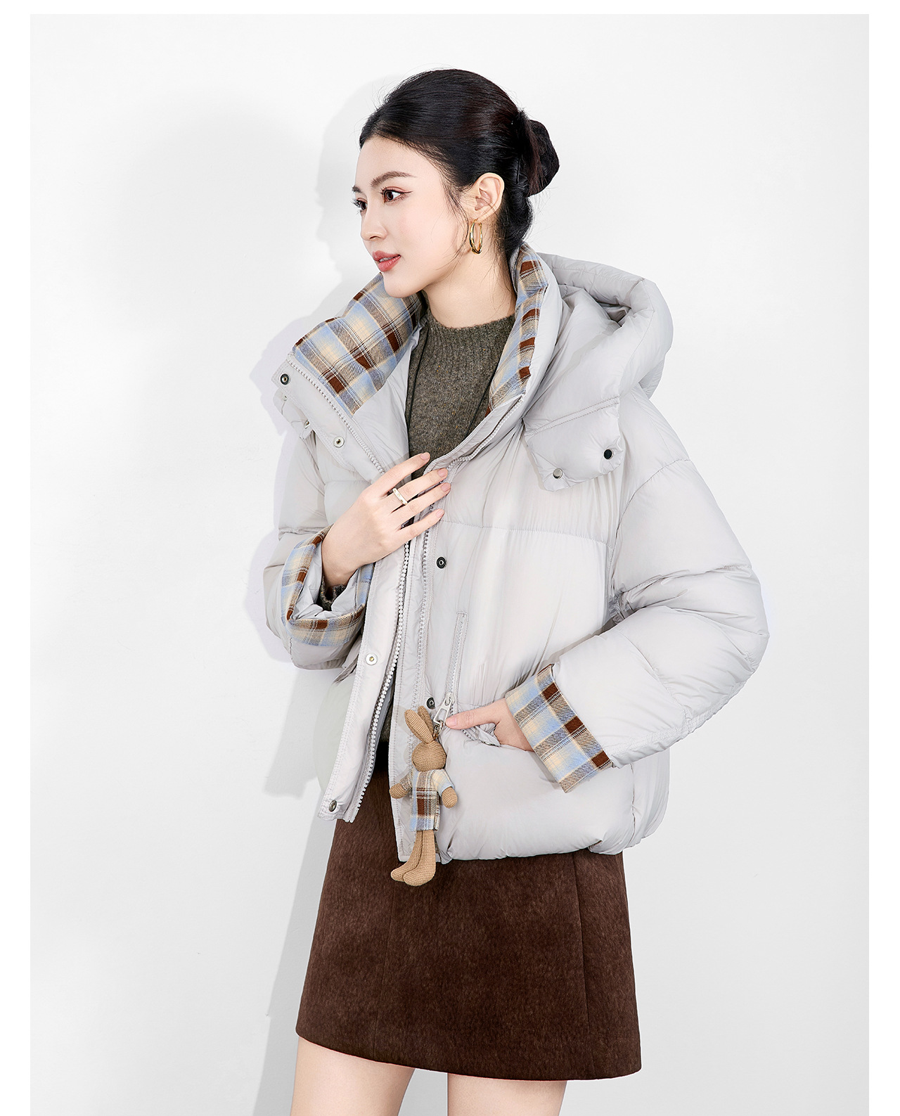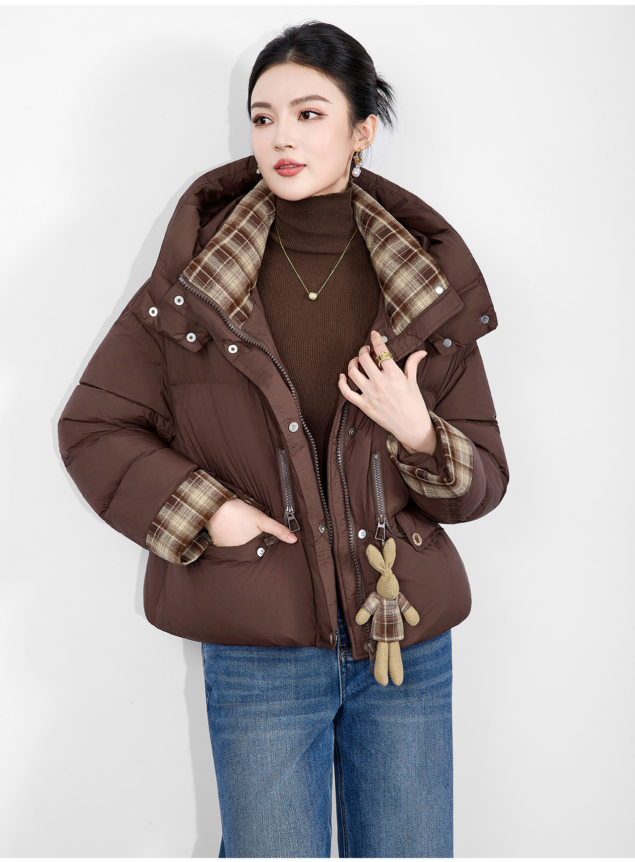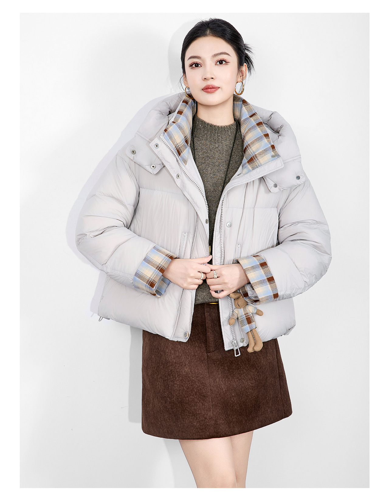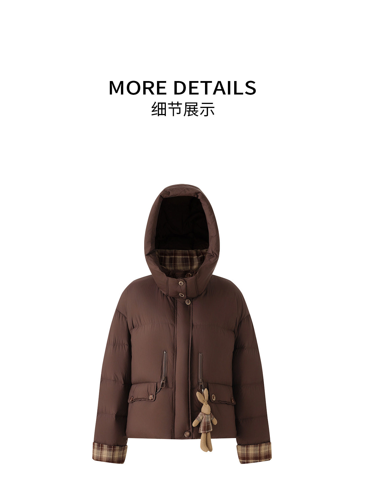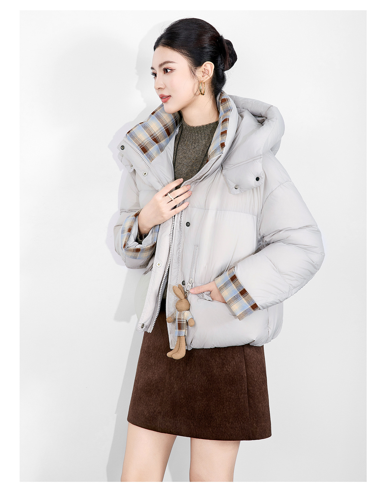 「高货wl」全新升级【铂金会员588/天猫799/差价211】(01933)洛诗琳连帽泡芙小熊挂饰羽绒服2025冬季格纹撞色保暖外套