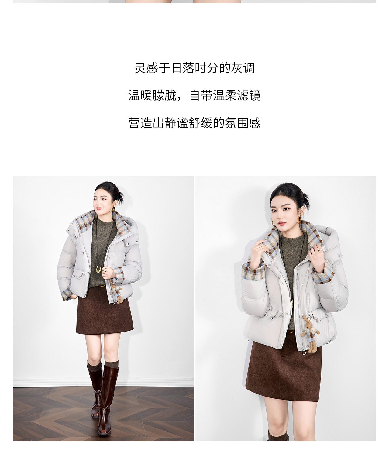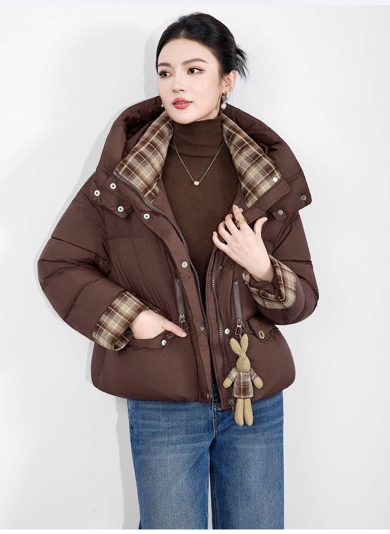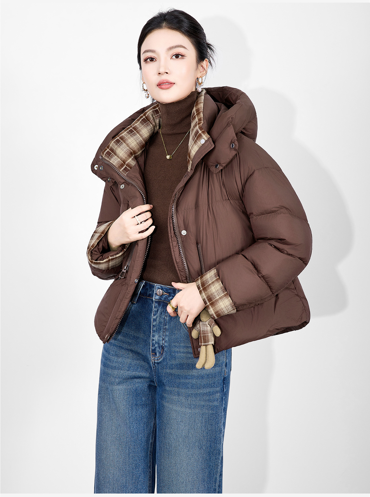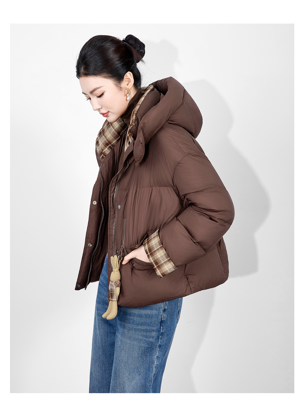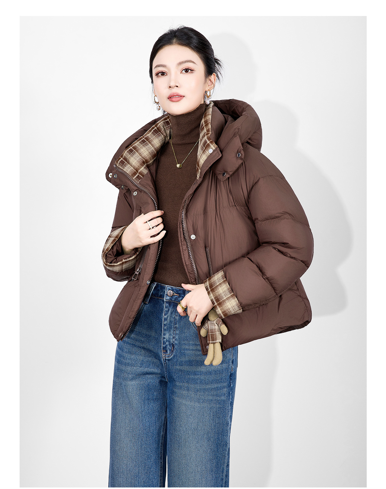 「高货wl」全新升级【铂金会员588/天猫799/差价211】(01933)洛诗琳连帽泡芙小熊挂饰羽绒服2025冬季格纹撞色保暖外套