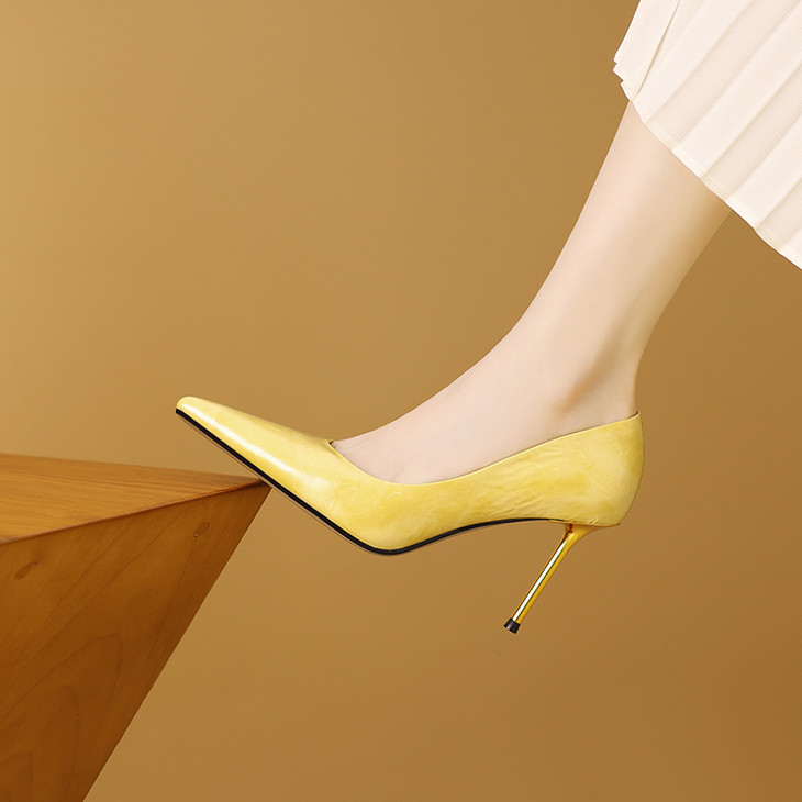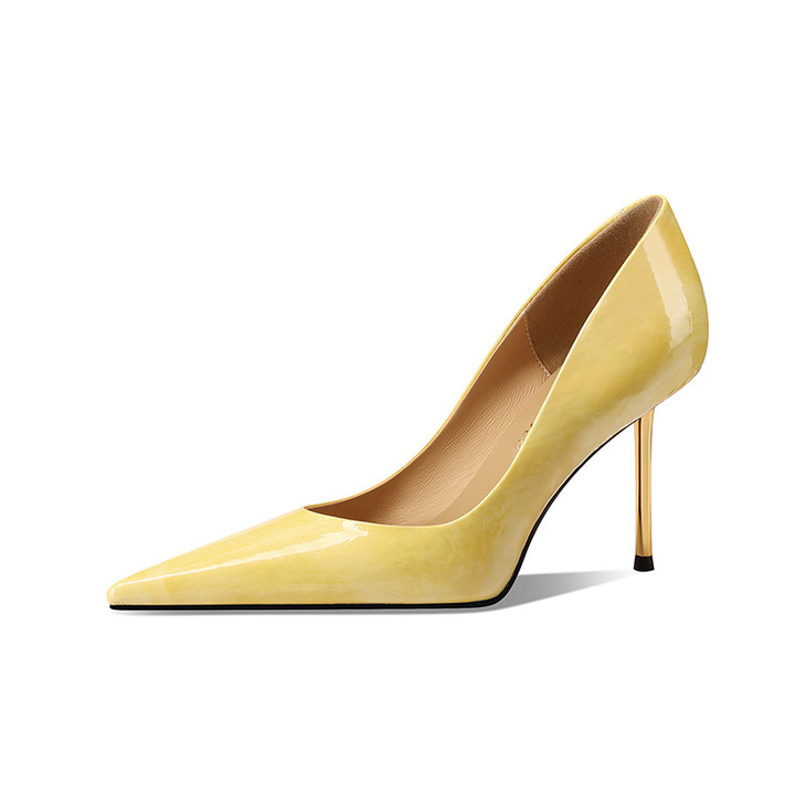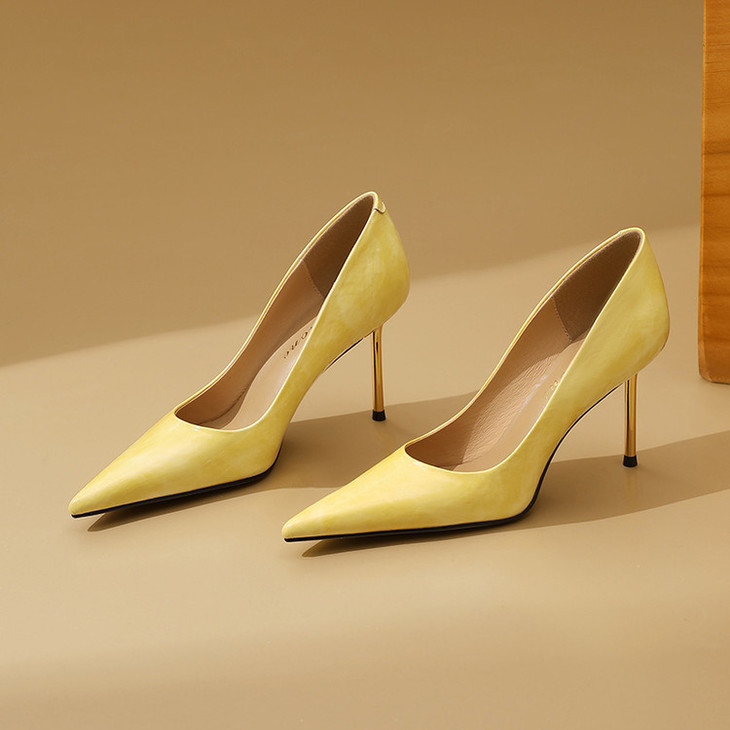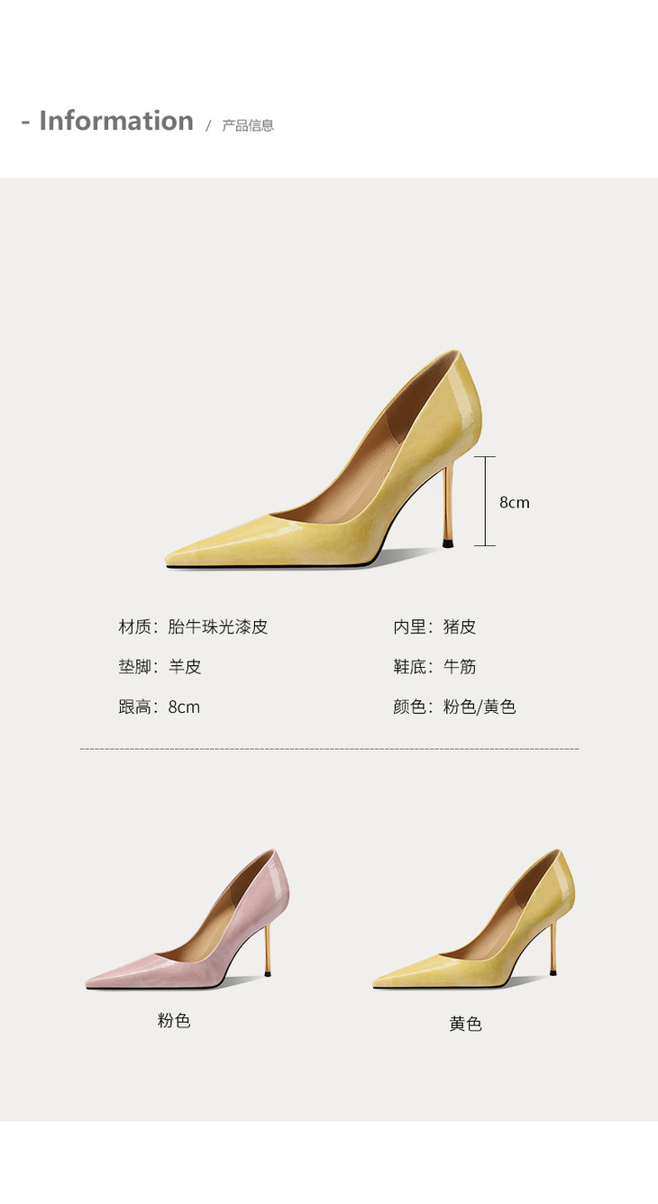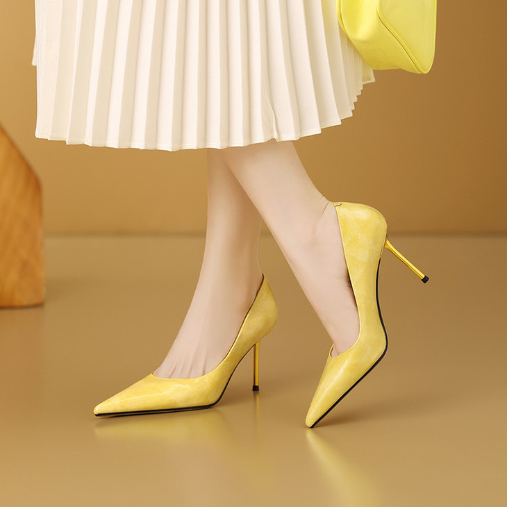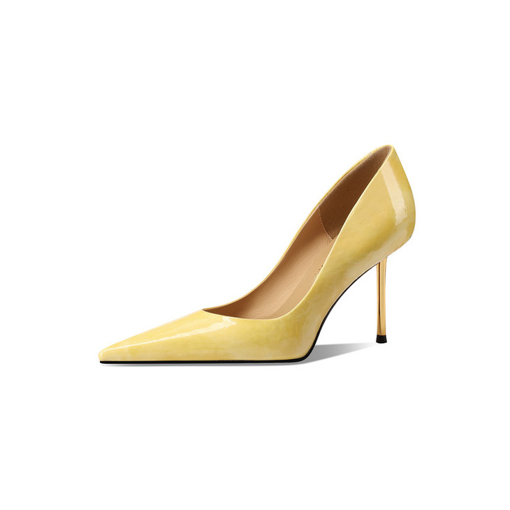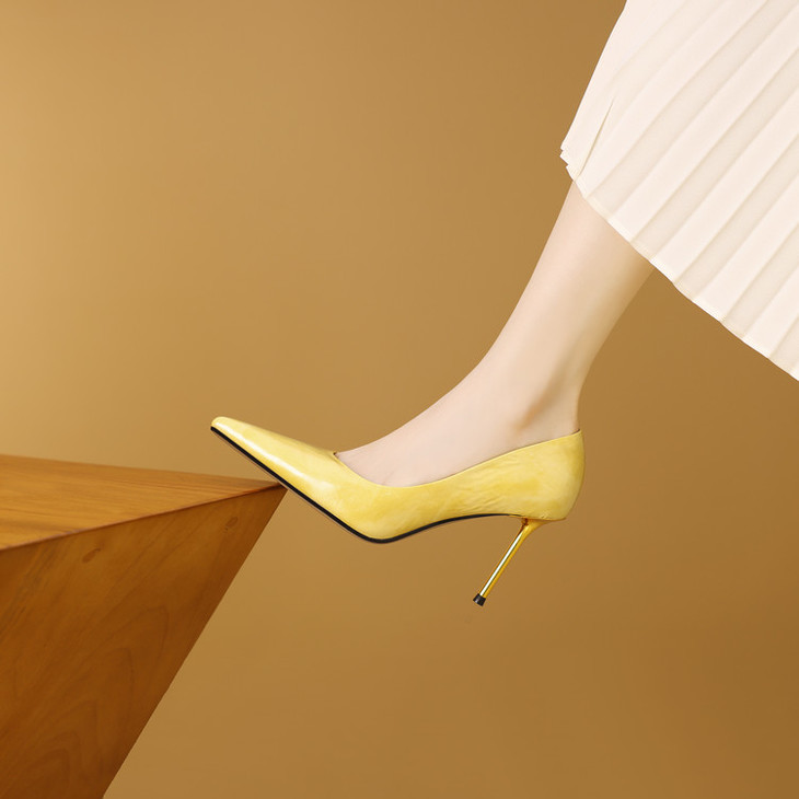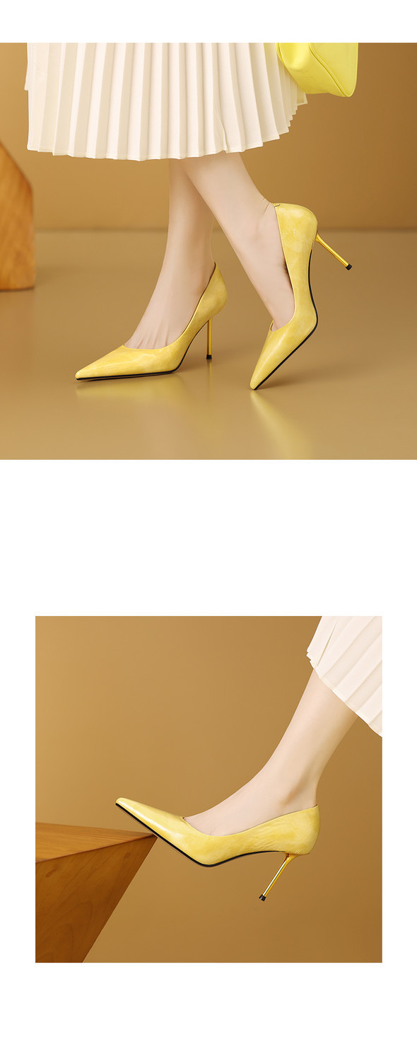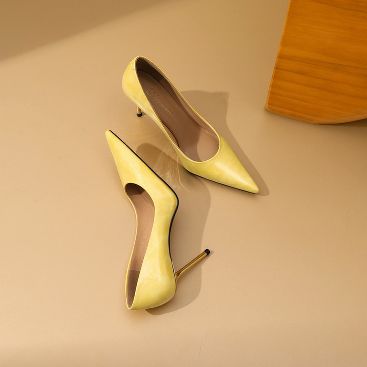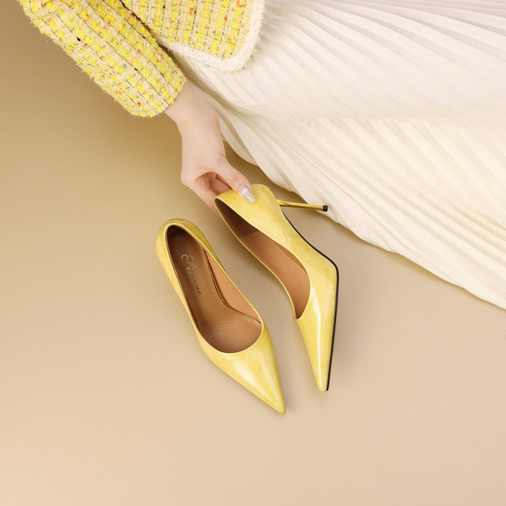 【预售7天】法式真皮尖头细跟高跟鞋女春秋新款性感职场黄色浅口单鞋时装女鞋CX&CX081-1