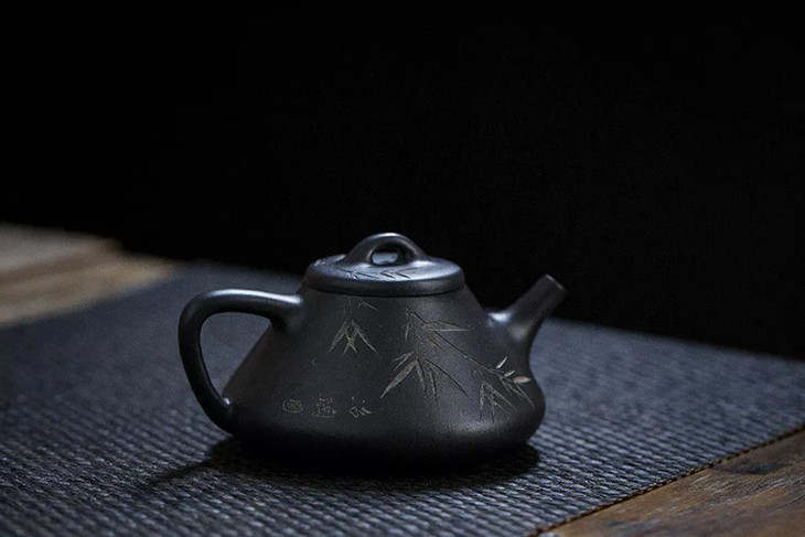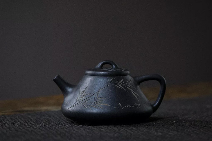 茶香记 黑料子冶小石瓢-刻绘板桥竹 杨飞 紫砂壶 原矿黑料 半手工