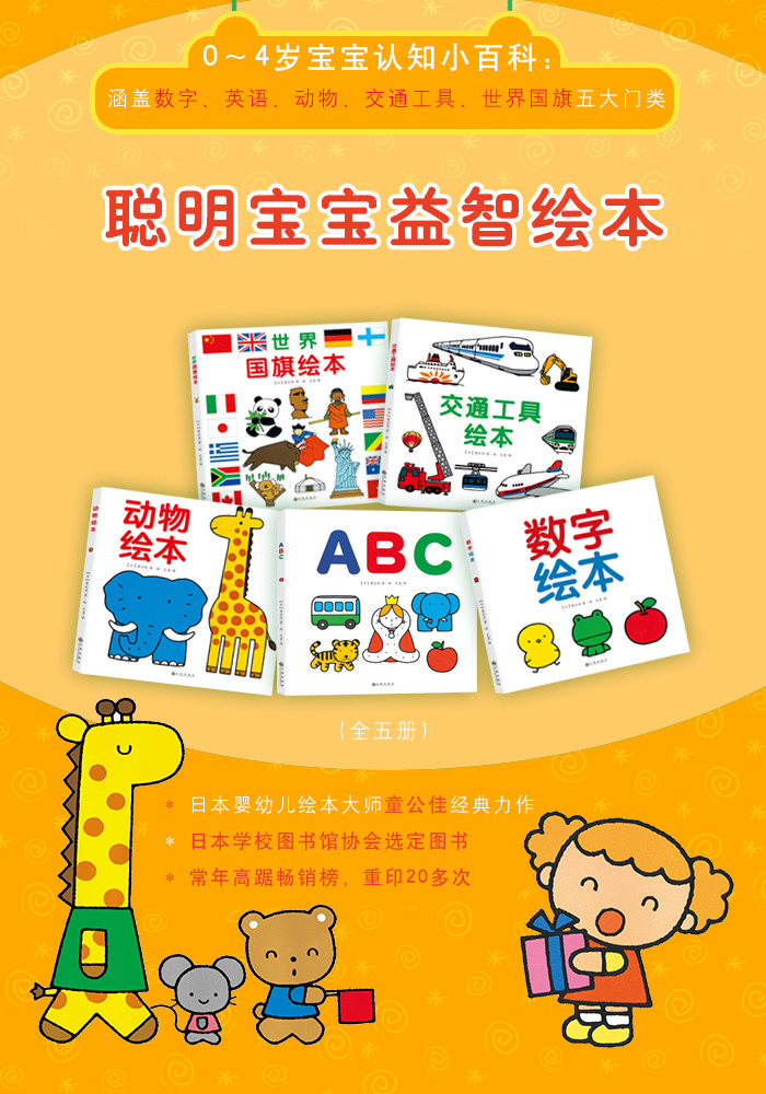 本系列书共五本,包括《世界国旗绘本》、《交通工具绘本》、《数字绘本》、《动物绘本》、《ABC》。本书的作者是日本首屈一指的婴幼儿绘本大师,本书作为日本学校图书馆协议会选定图书,多年来连续畅销。本书是让孩子和家人以及周围的朋友一起快乐阅读和欣赏的绘本。内容丰富,知识全面,图画鲜活,适合婴幼儿阅读,是小朋友的益智读物首选。