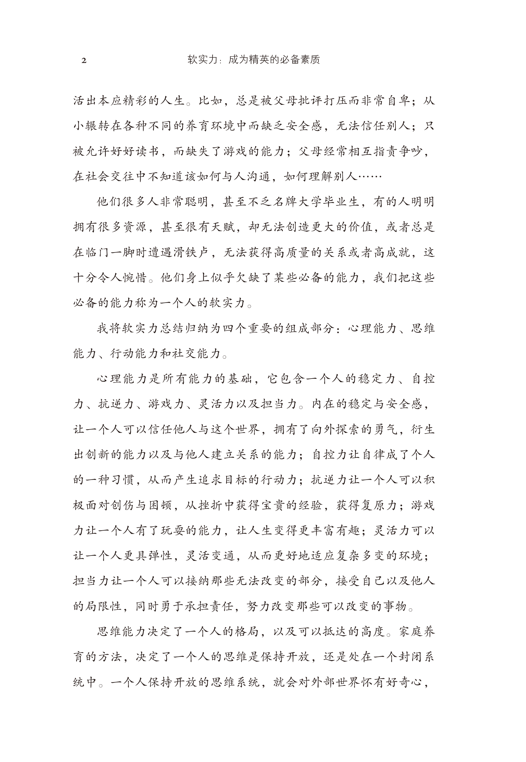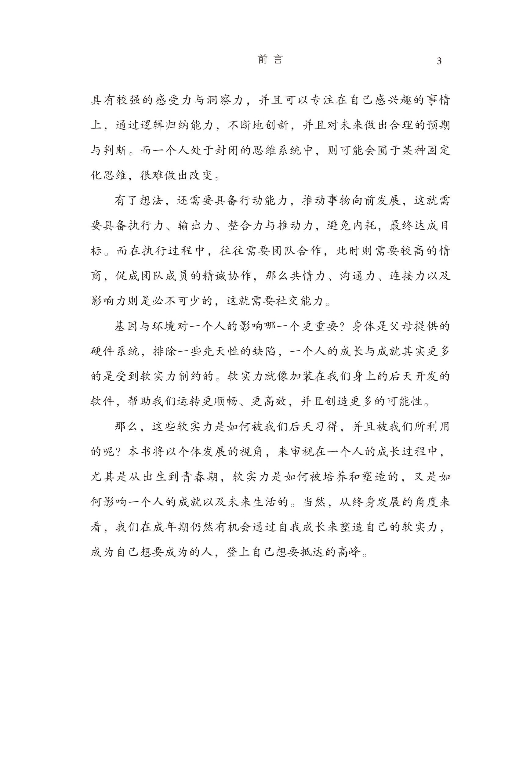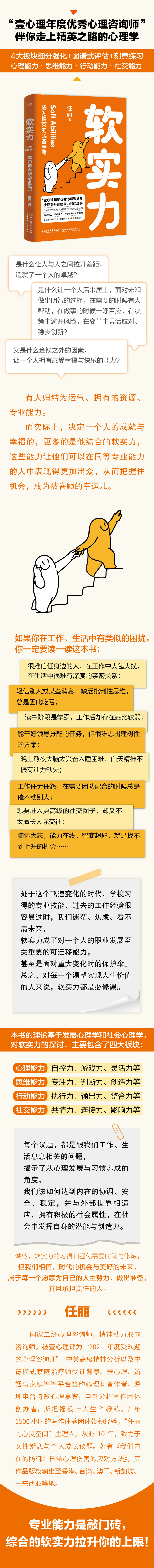 本书以发展心理学、社会心理学的视角,将软实力归纳为四大重要的组成部分 —— 心理能力、思维能力、行动能力和社交能力,相当于自我检视的 “软实力分类大图谱”,基于此,每个人都可以有针对性地提高自身某几种特定能力,从思维与行为双管齐下弥补自己的短板、强化自己的长项,为自己打造一套完整的内在成长与外在成为的能力系统,成为自己想要成为的人,创造自己想要的人生。