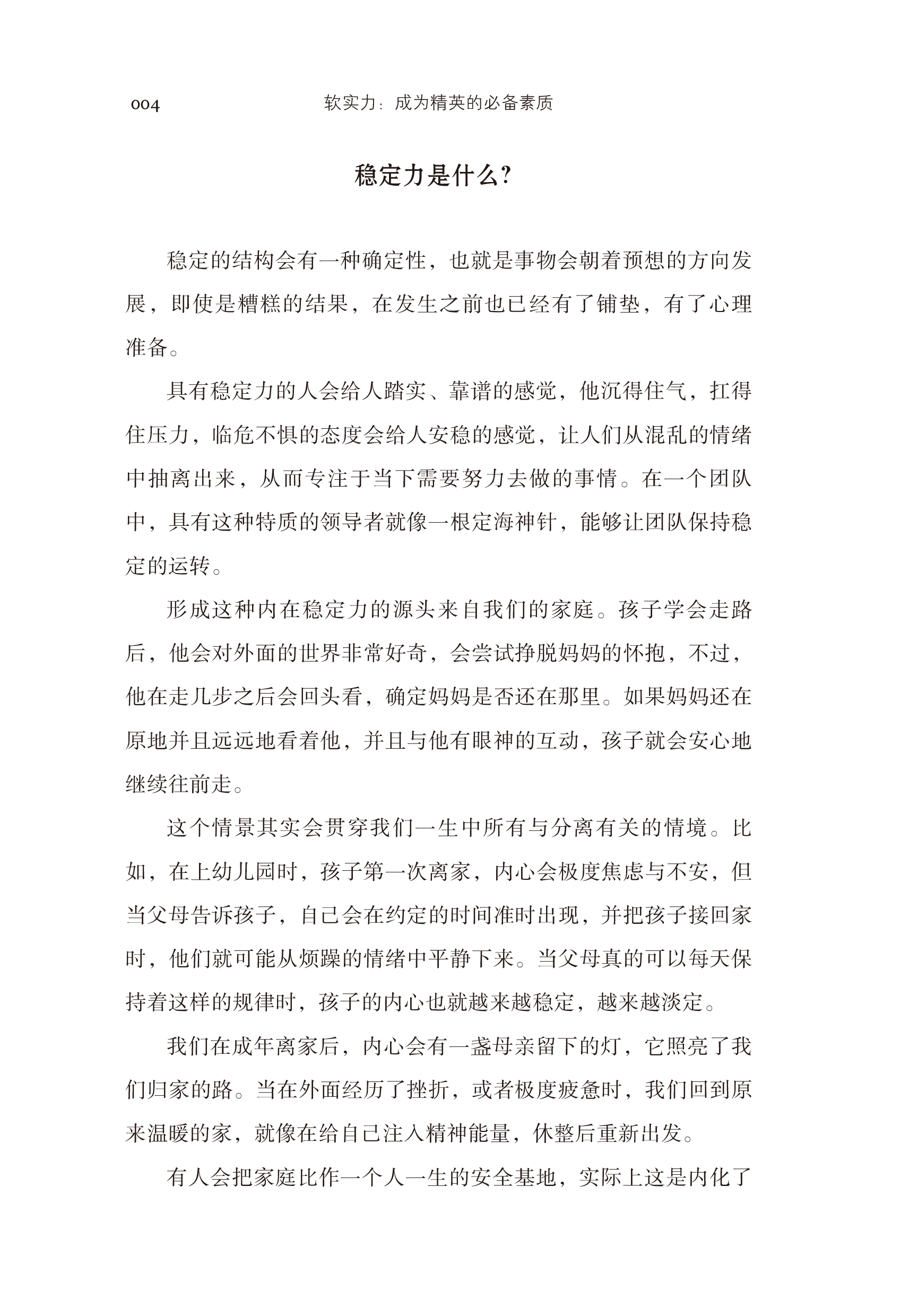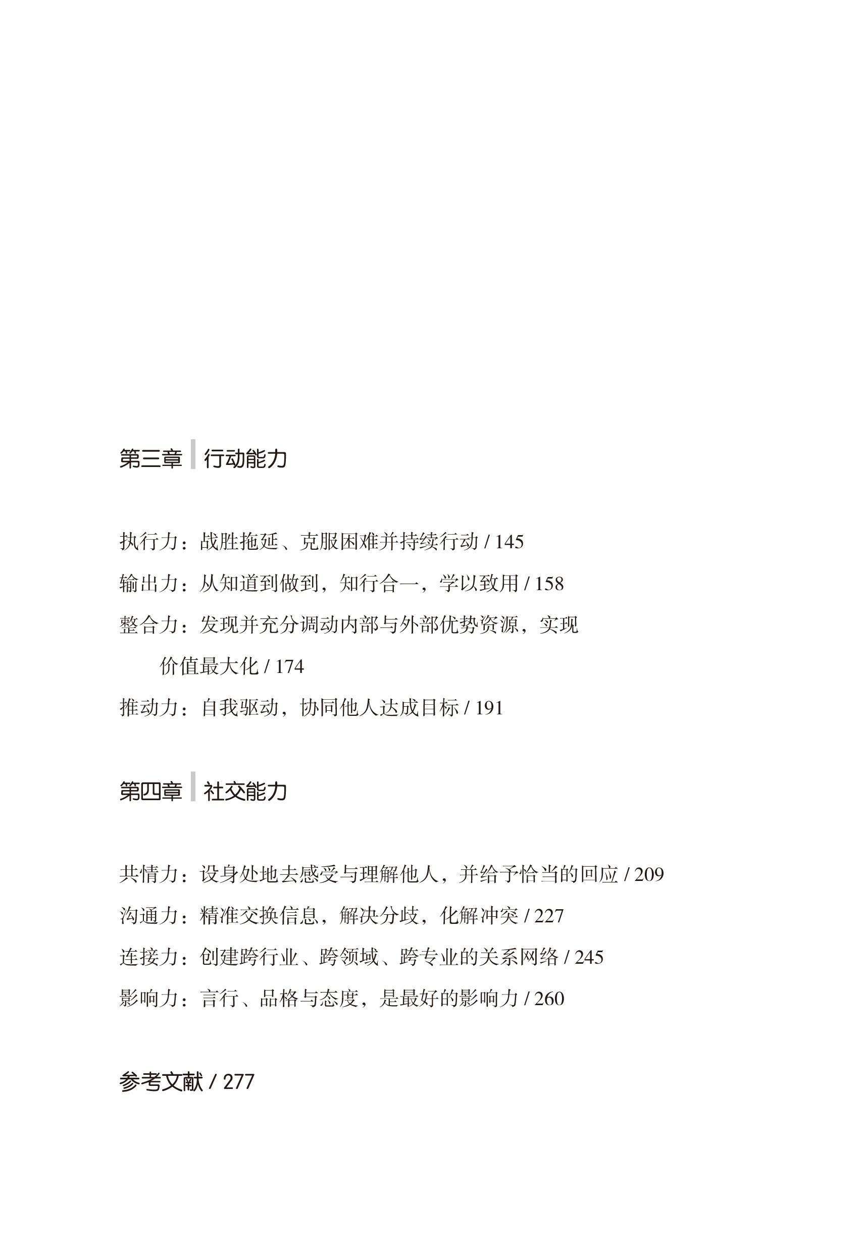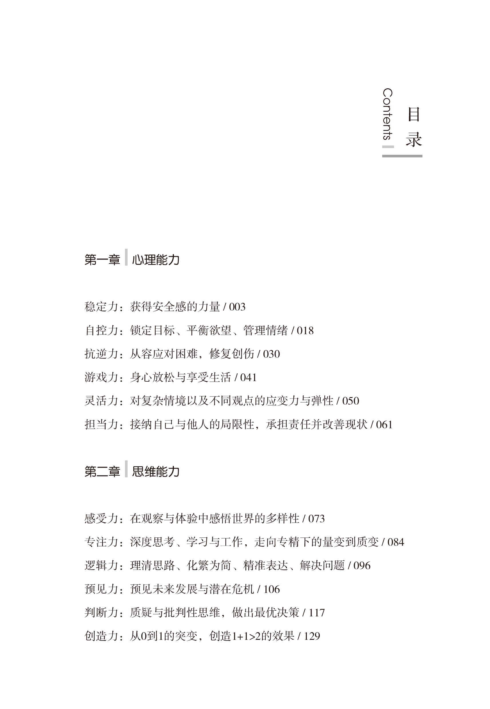 本书以发展心理学、社会心理学的视角,将软实力归纳为四大重要的组成部分 —— 心理能力、思维能力、行动能力和社交能力,相当于自我检视的 “软实力分类大图谱”,基于此,每个人都可以有针对性地提高自身某几种特定能力,从思维与行为双管齐下弥补自己的短板、强化自己的长项,为自己打造一套完整的内在成长与外在成为的能力系统,成为自己想要成为的人,创造自己想要的人生。