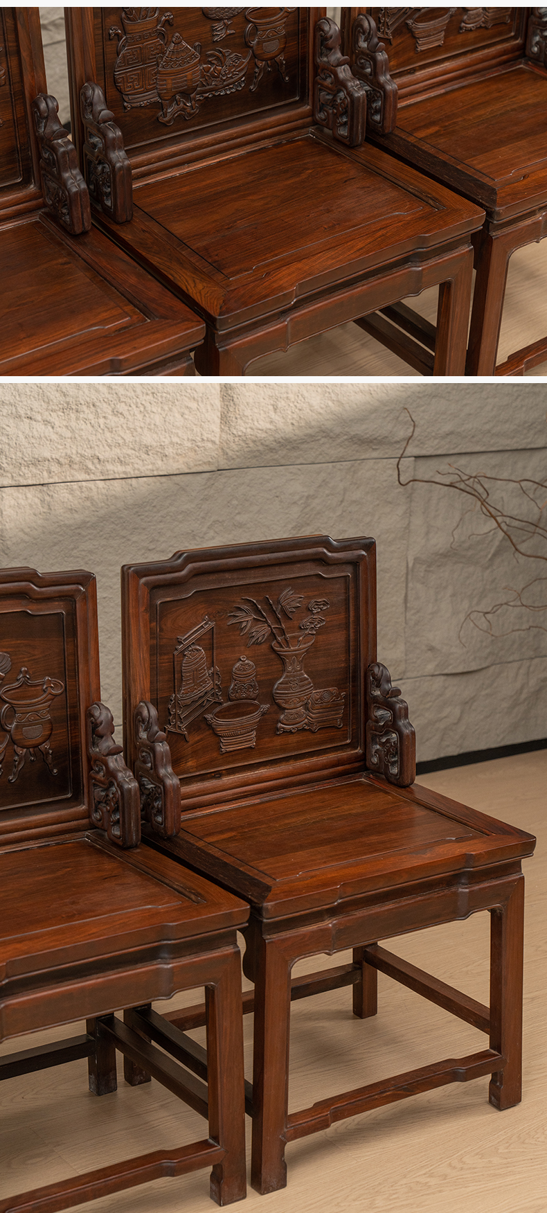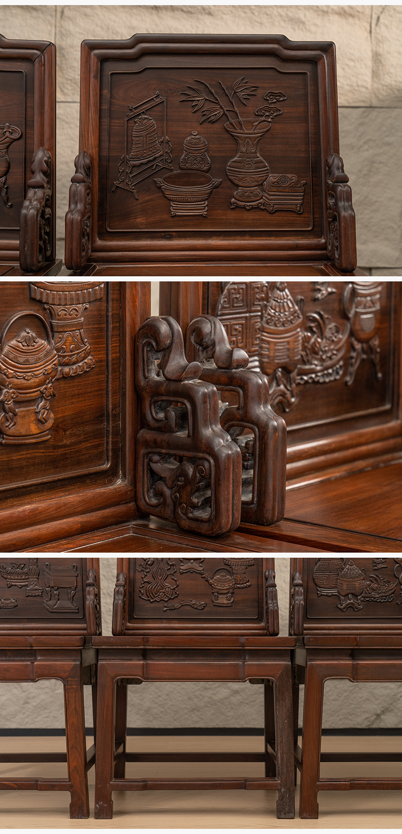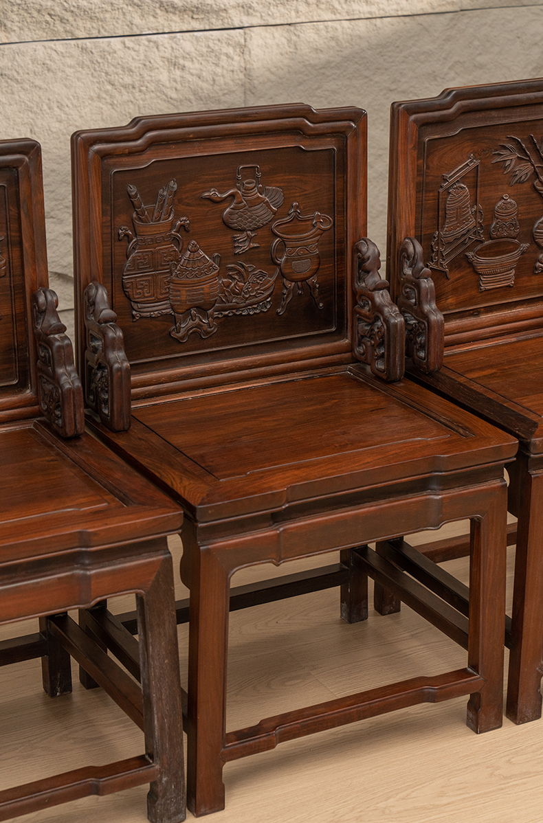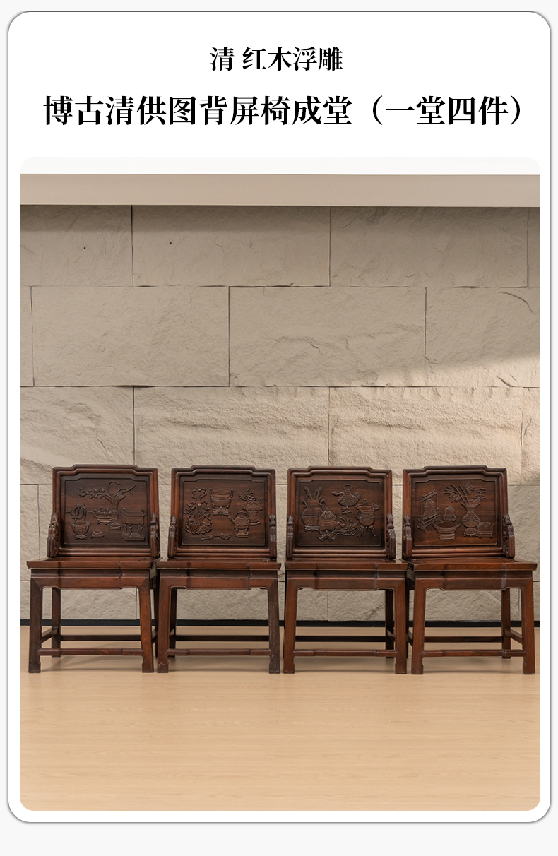 清 红木浮雕博古清供图背屏椅成堂(一堂四件)