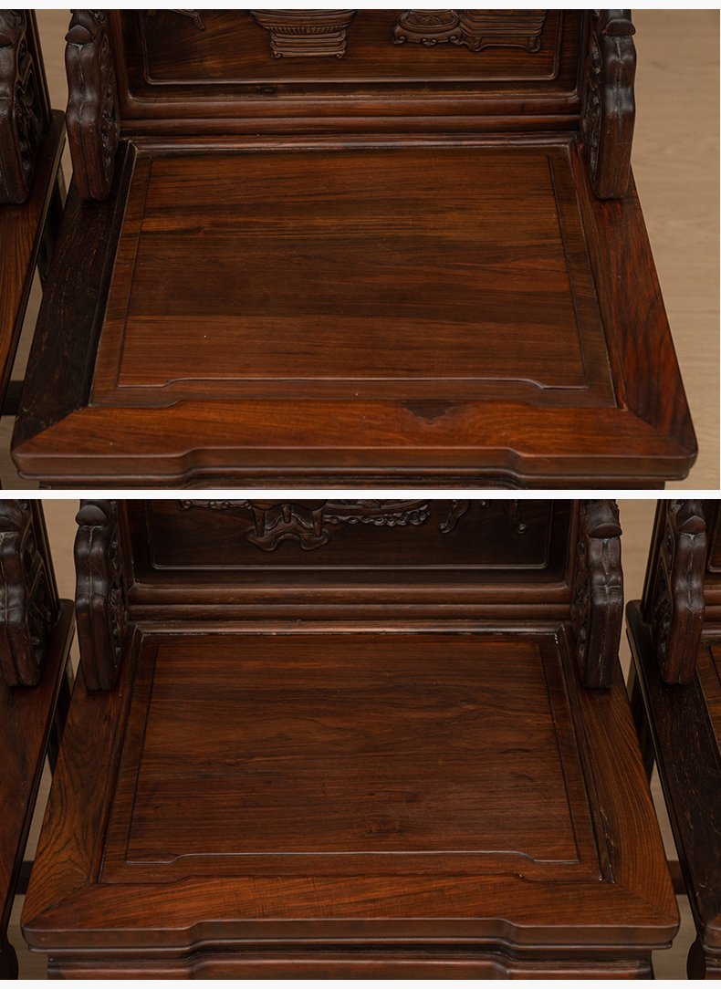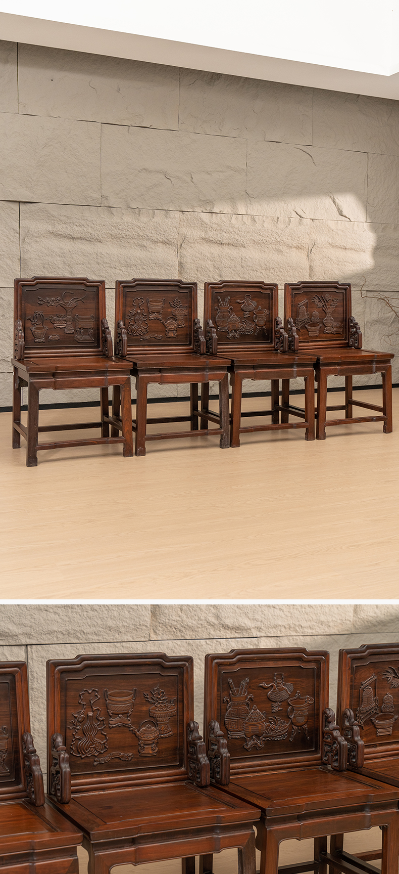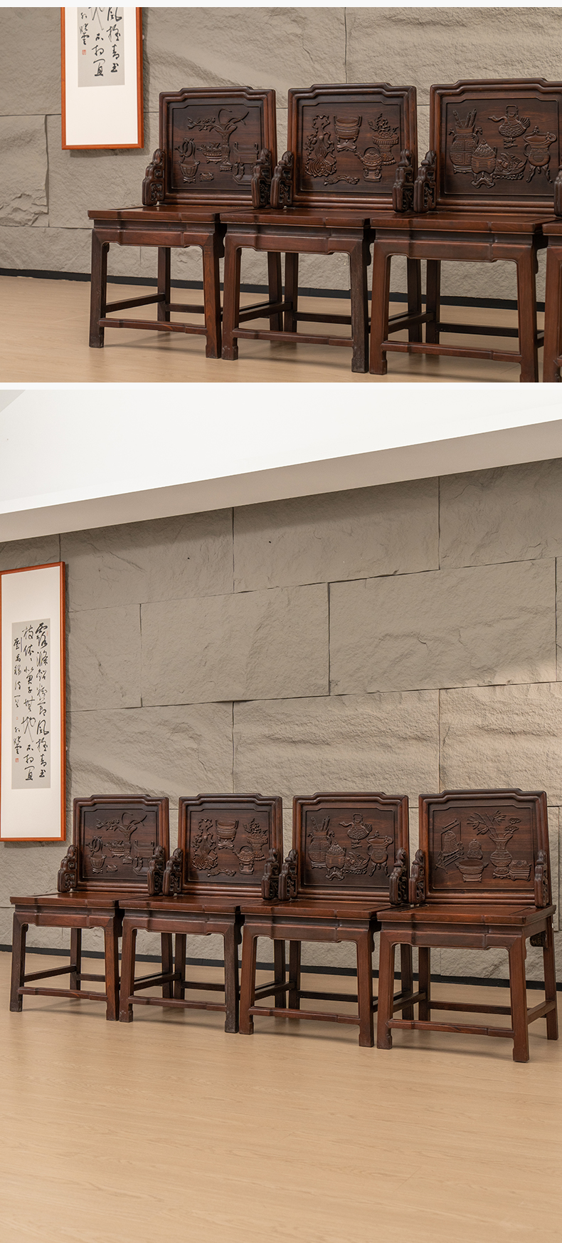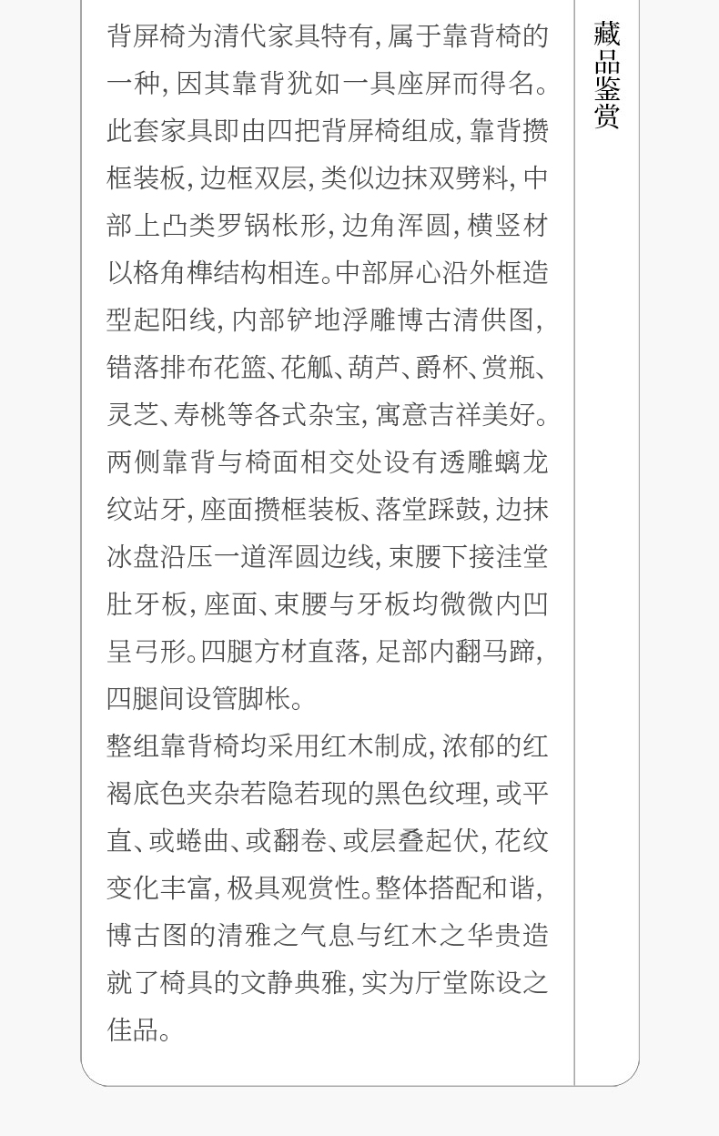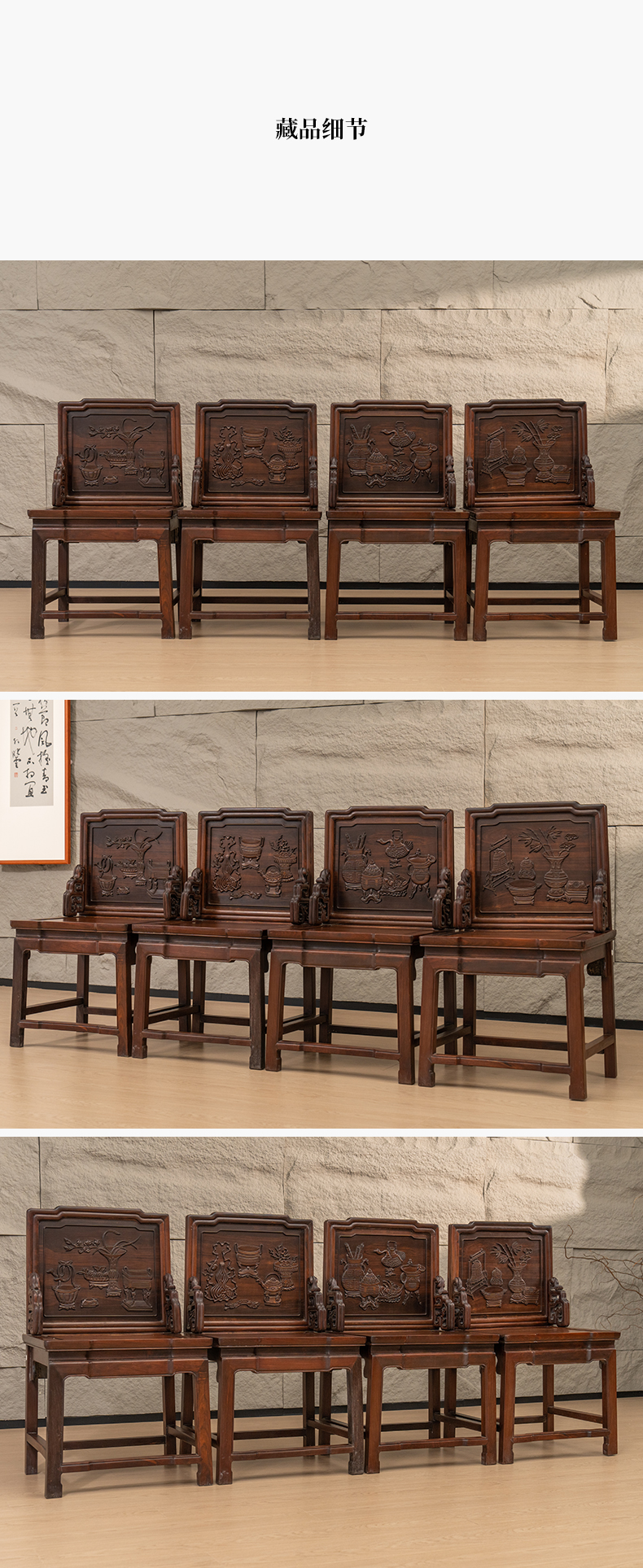 清 红木浮雕博古清供图背屏椅成堂(一堂四件)