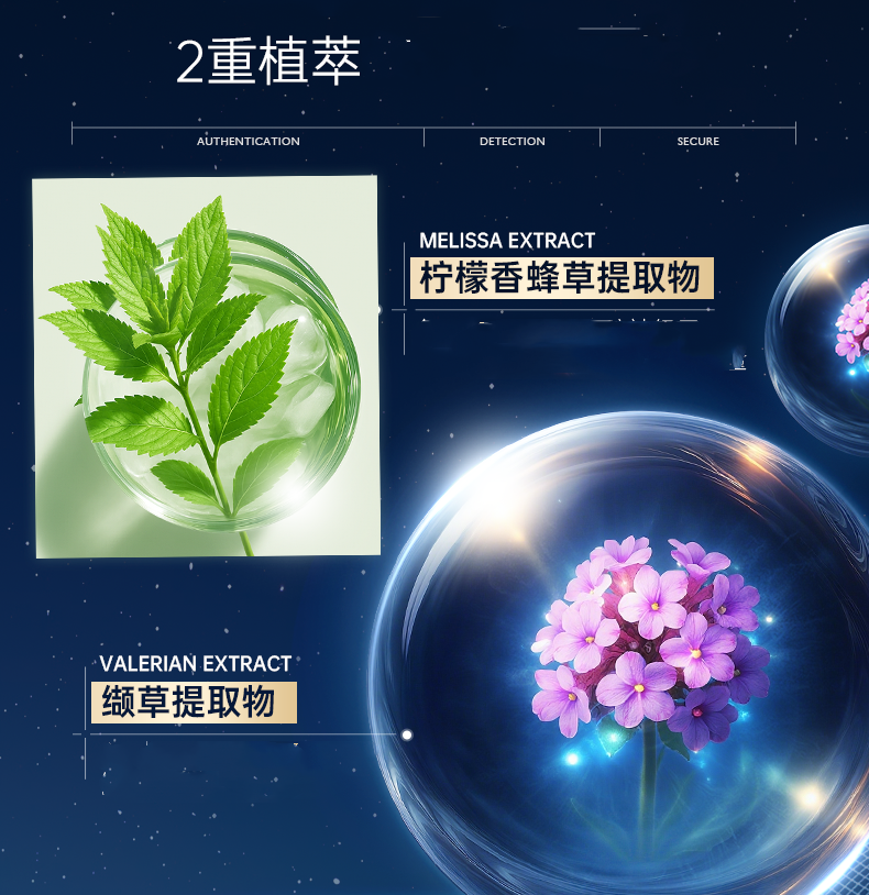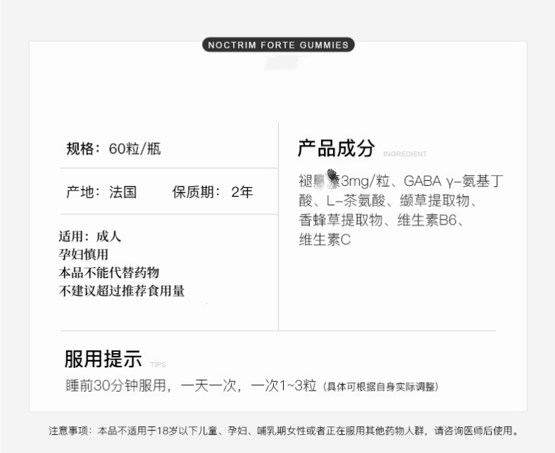 【产品成分】ths 3mg/粒、GABAY-氨基丁酸、L-茶氨酸、缬草提取物、香蜂草提取物、维生素B6、维生素C