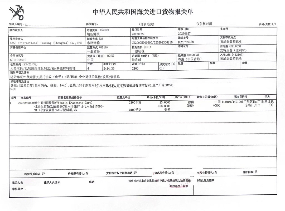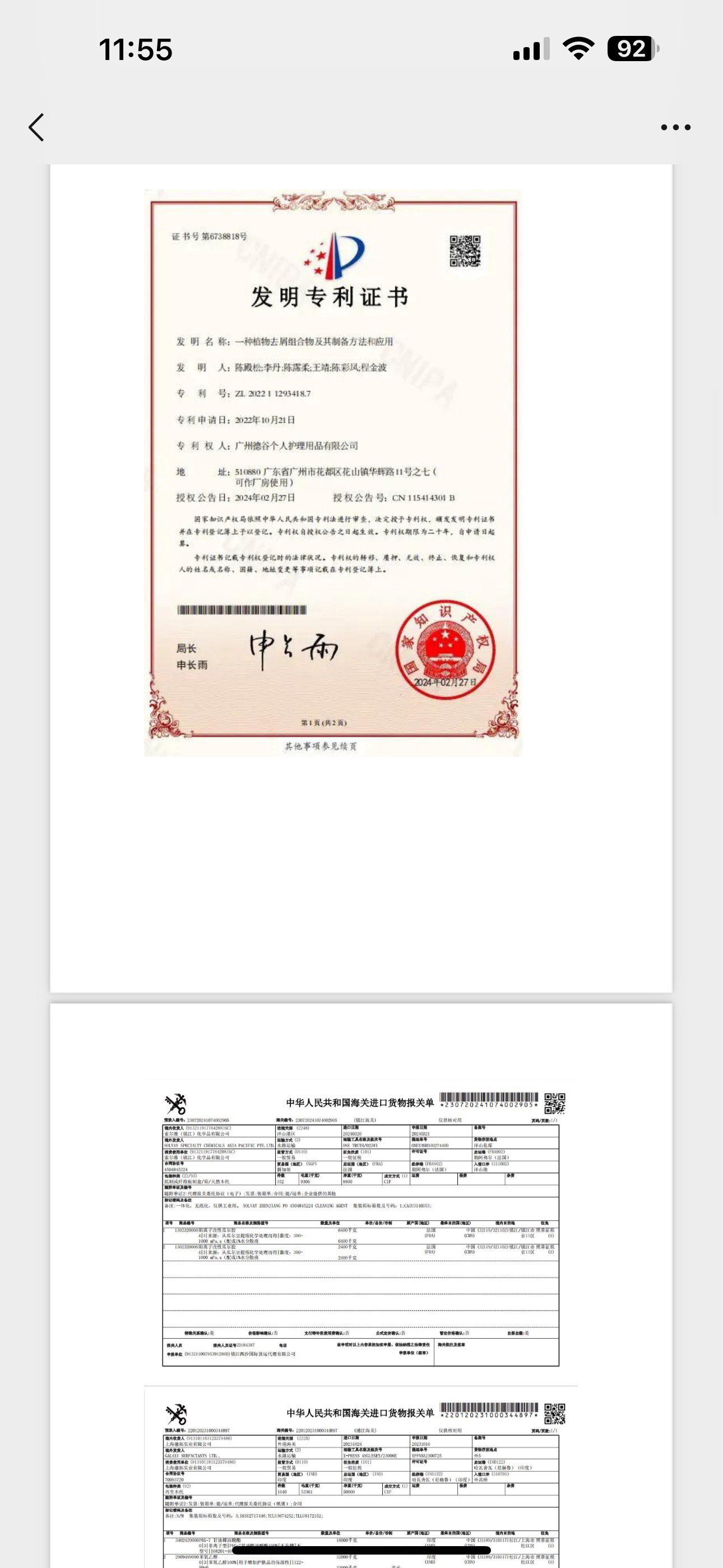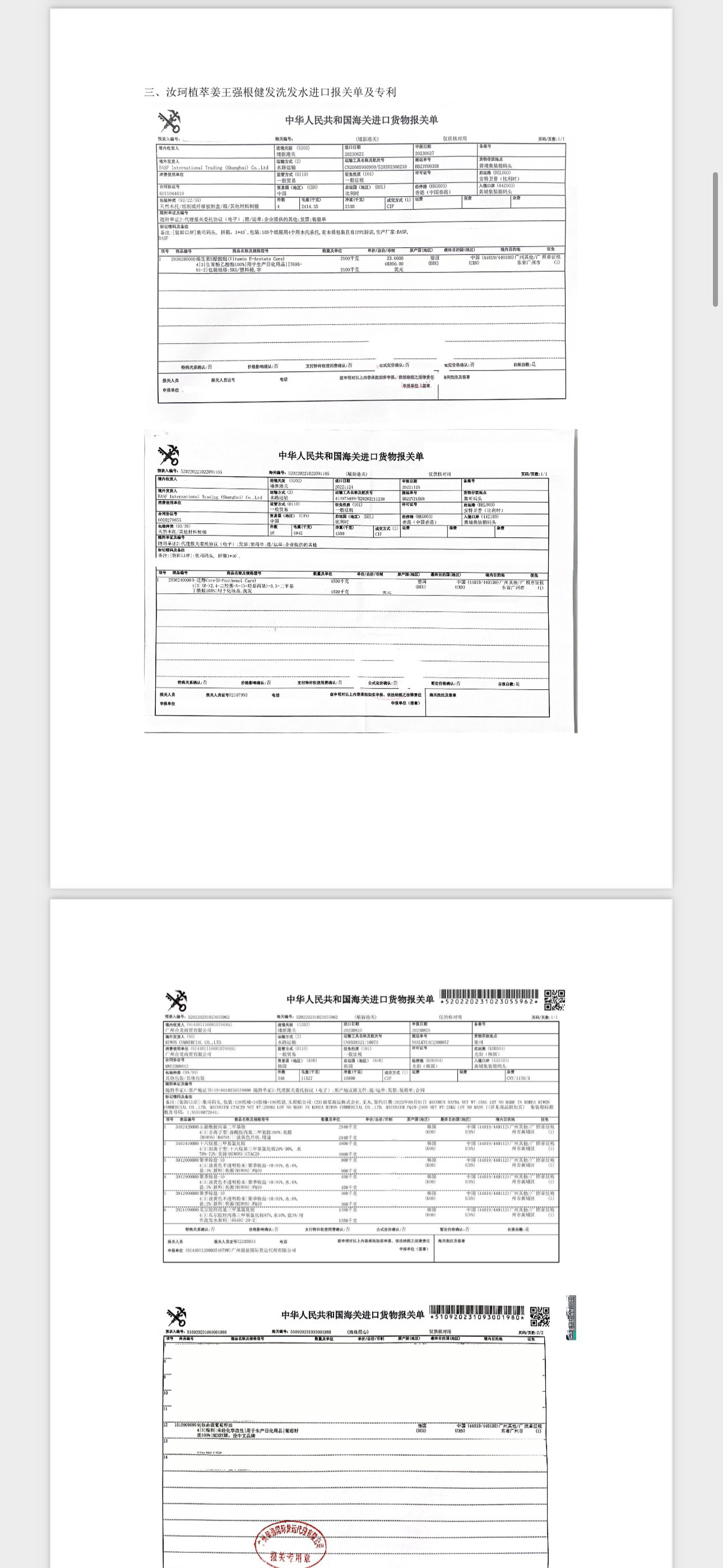 这是报关单,你们看看,他们从国外进的原料!!这个一看就是那种贵的,所有的资质都齐全!!这个洗发水它是有功效的,厂里说是绝对有用的,但是他的生发备案申请还没下来,因为你现在洗的话,是能感觉到它很蓬松,然后很轻松的,但是它要生发出来是要一到两个月是有见效,你们可以持续的用半年看看,那个南京同仁堂的洗发水也在他们工厂生产,说是卖好几百,都是差不多的原材料