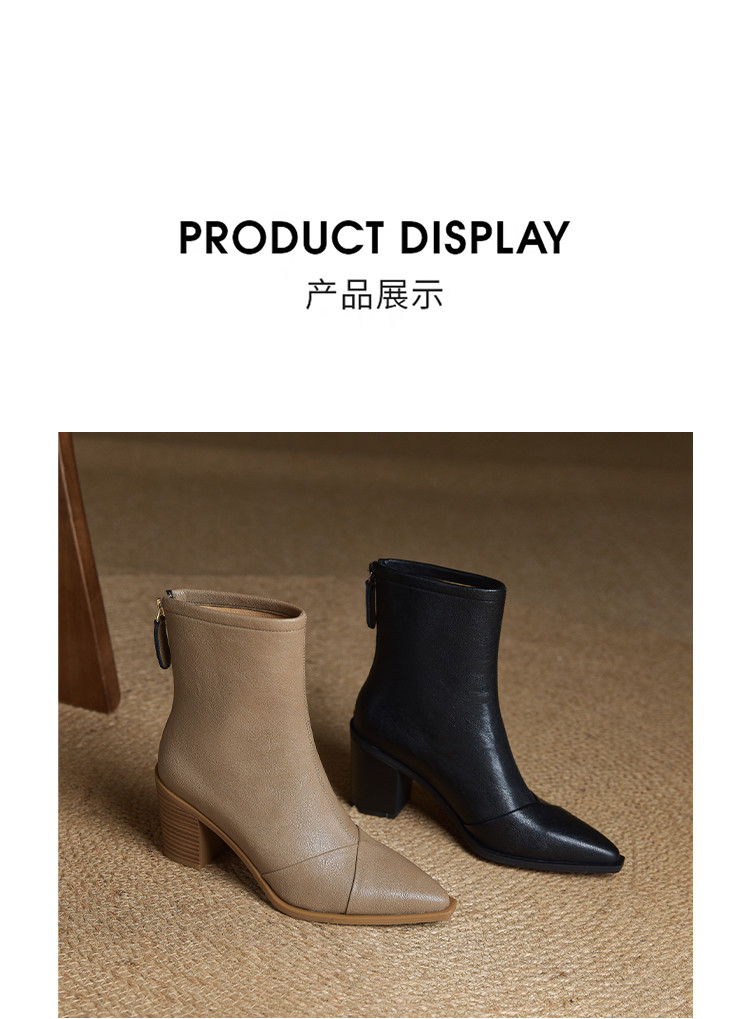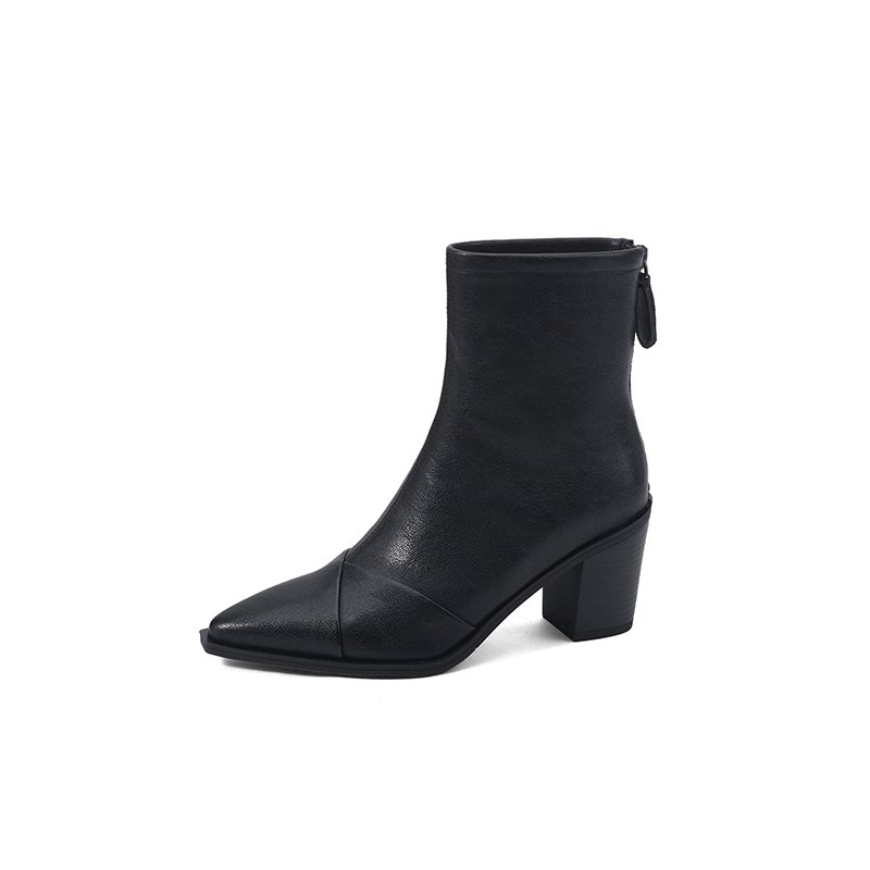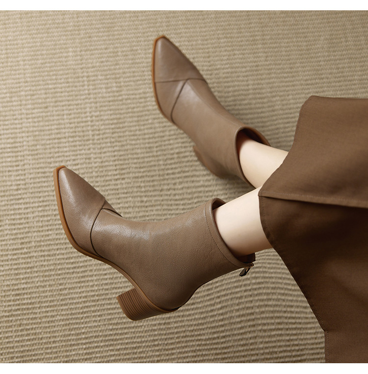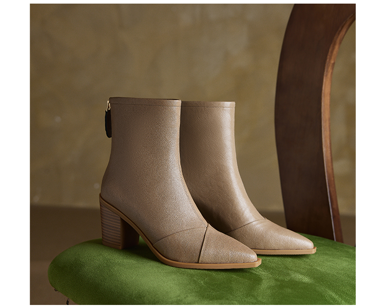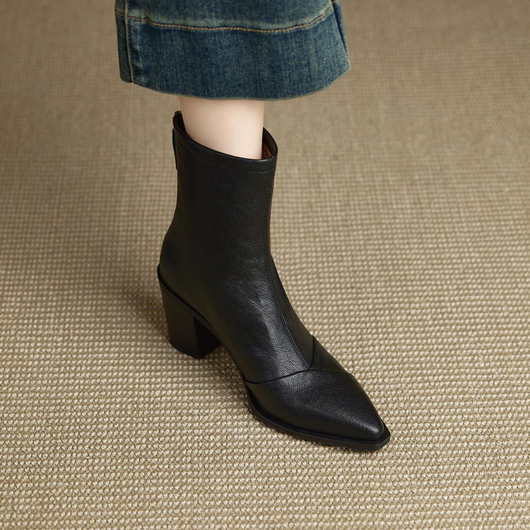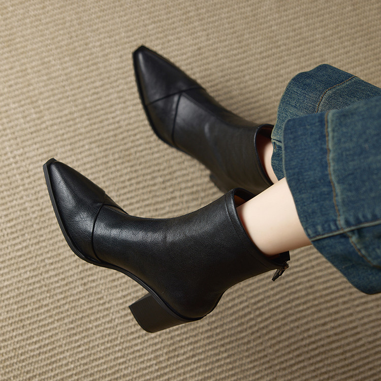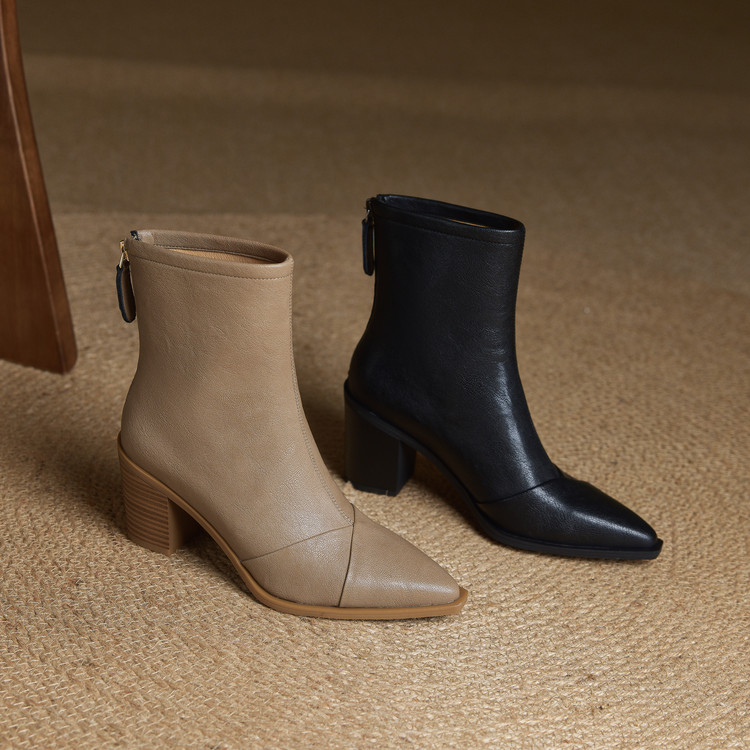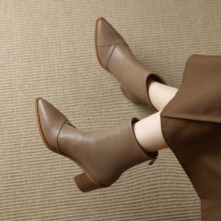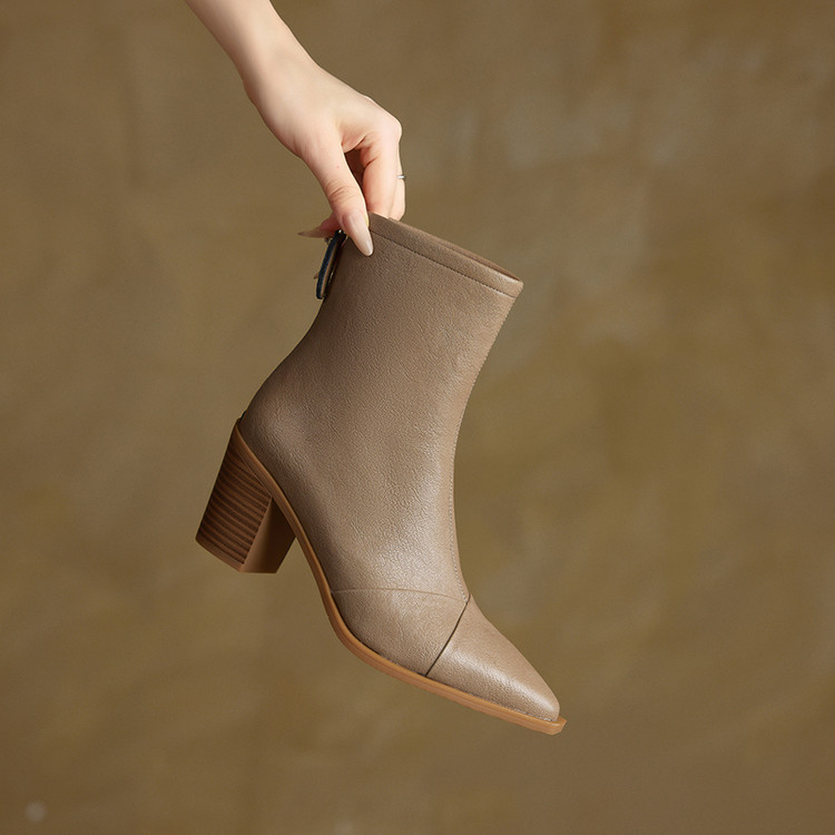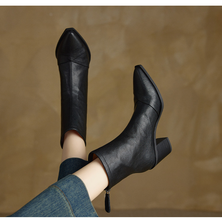 【预售5天】复古气质尖头粗跟短靴女后拉链高跟切尔西靴显瘦真皮裸靴YS&A1906