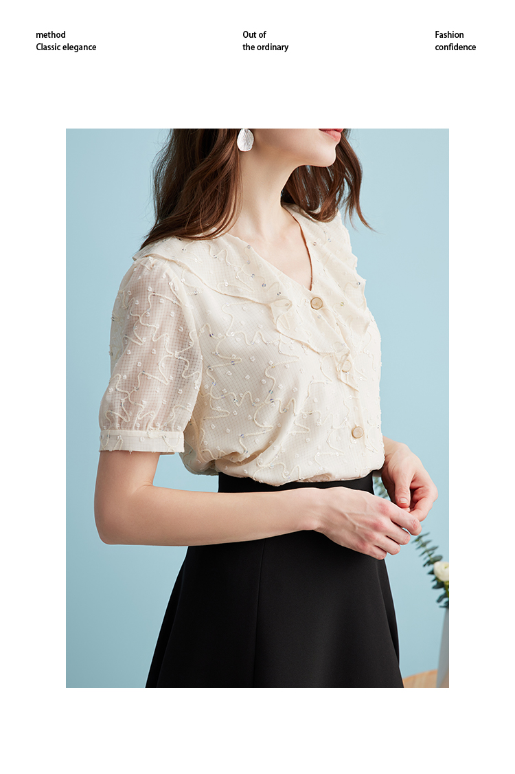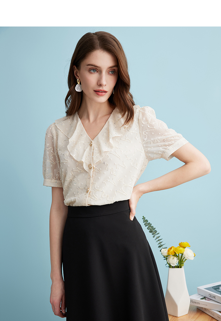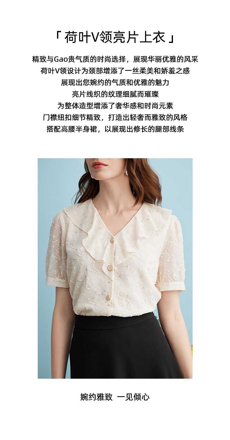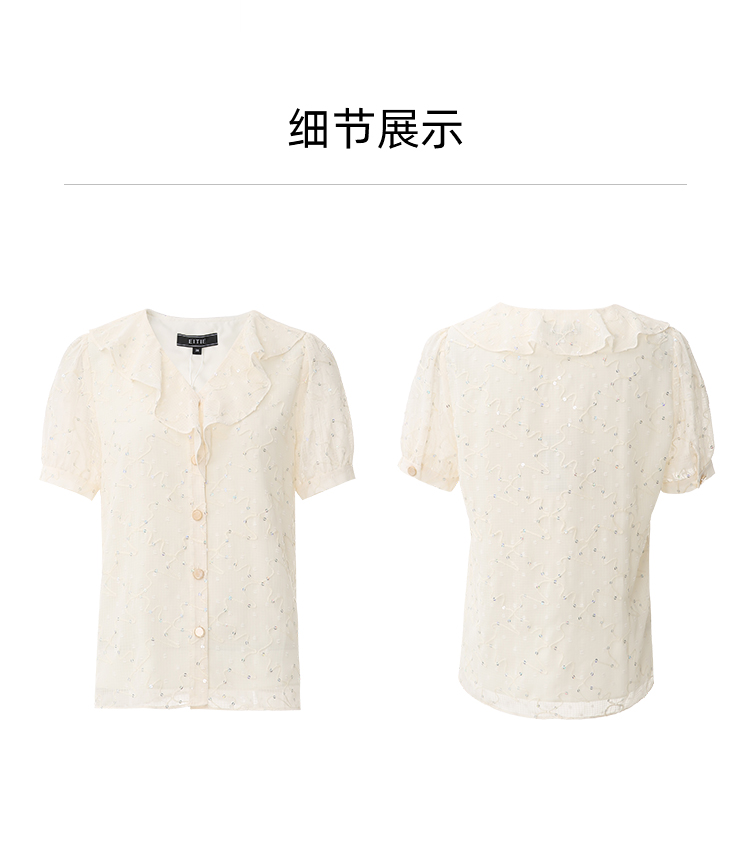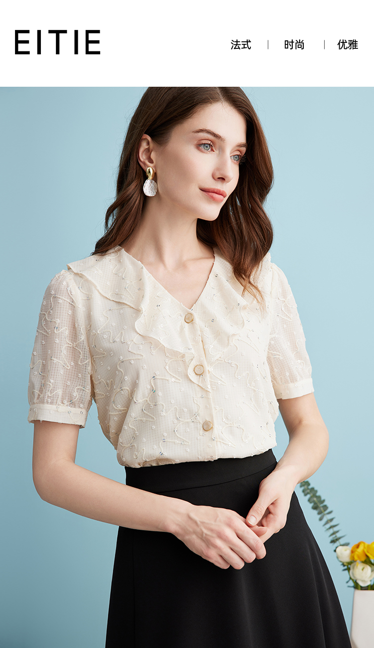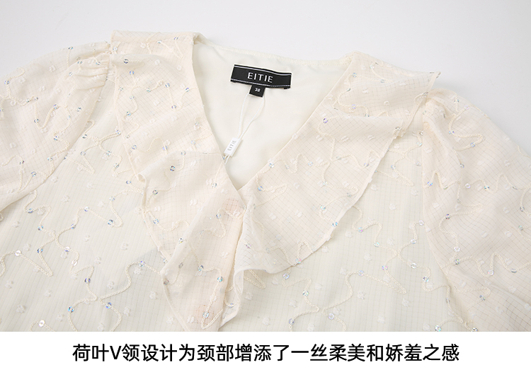 EITIE爱特爱时尚亮片V领荷叶边泡泡袖绣花雪纺衬衫上衣夏新款B2413310