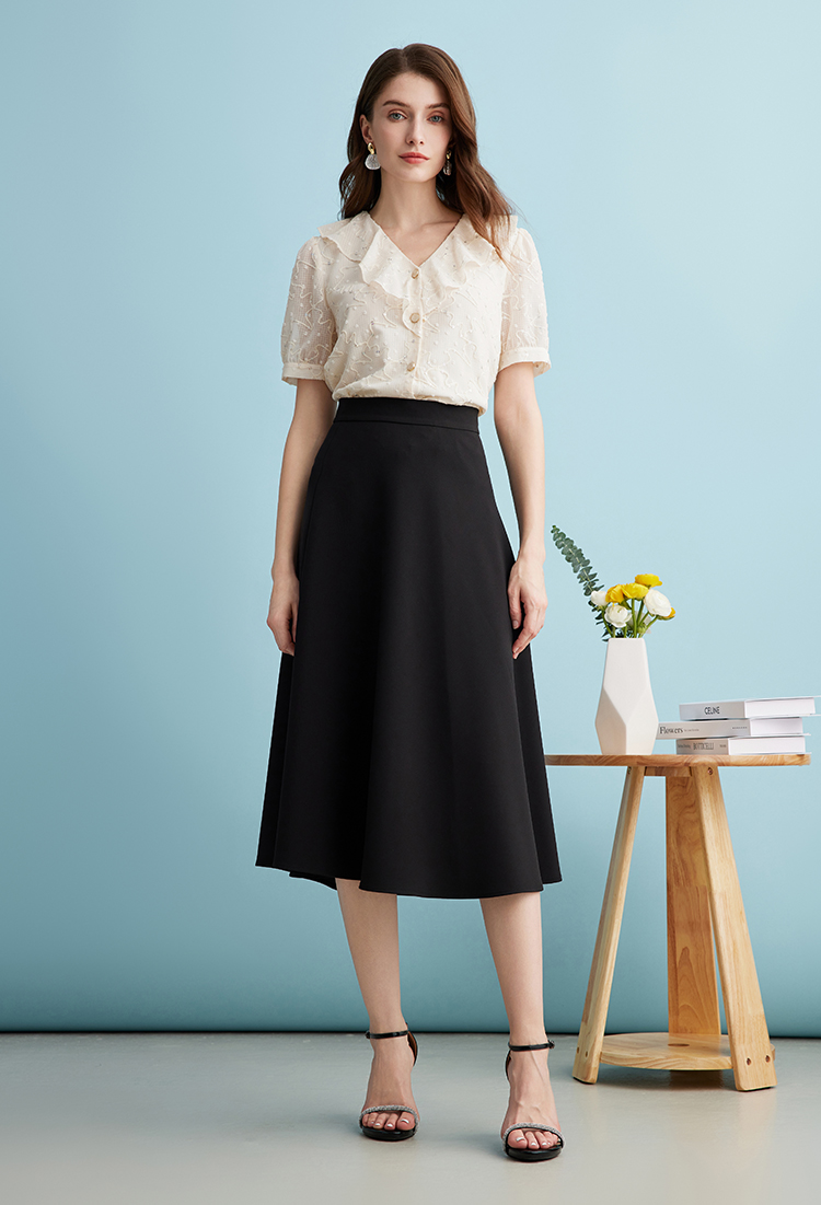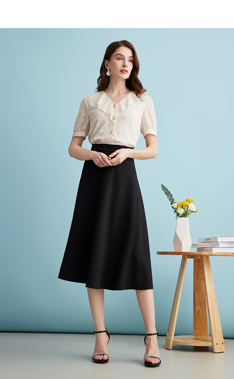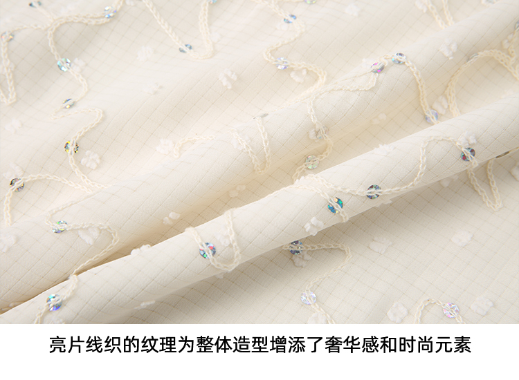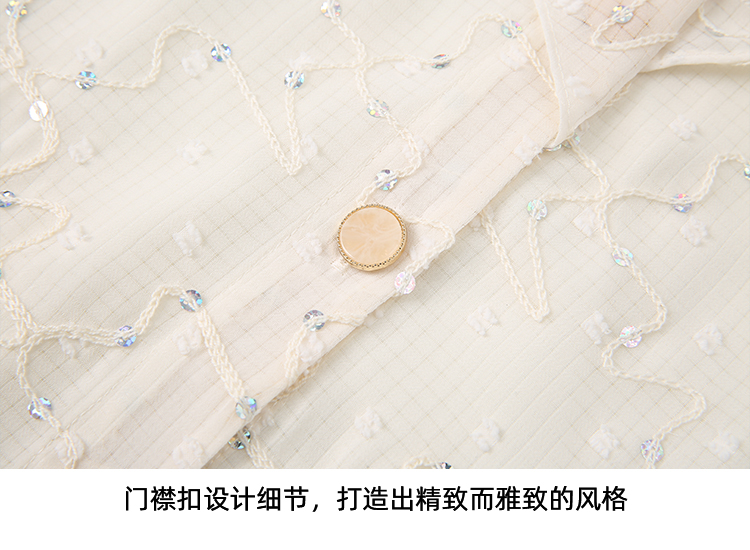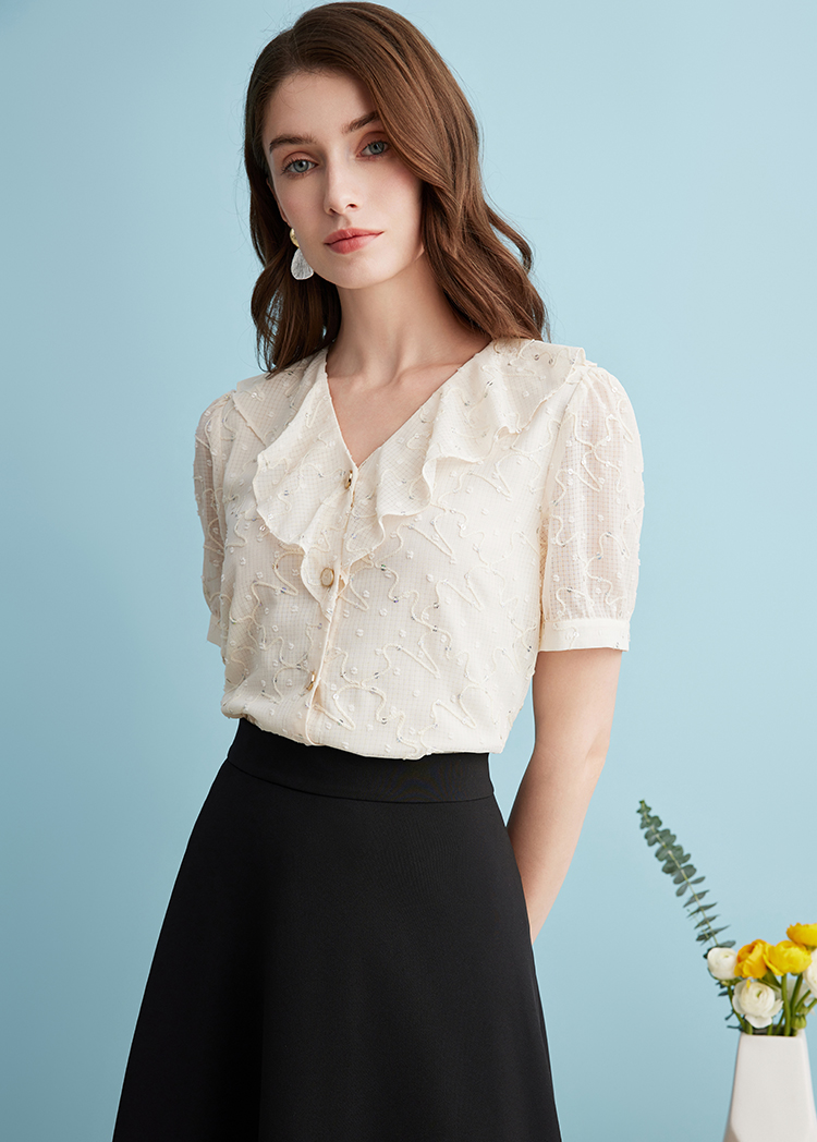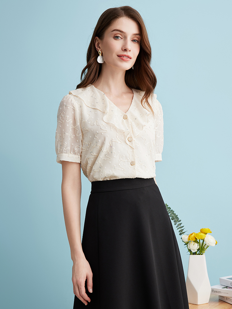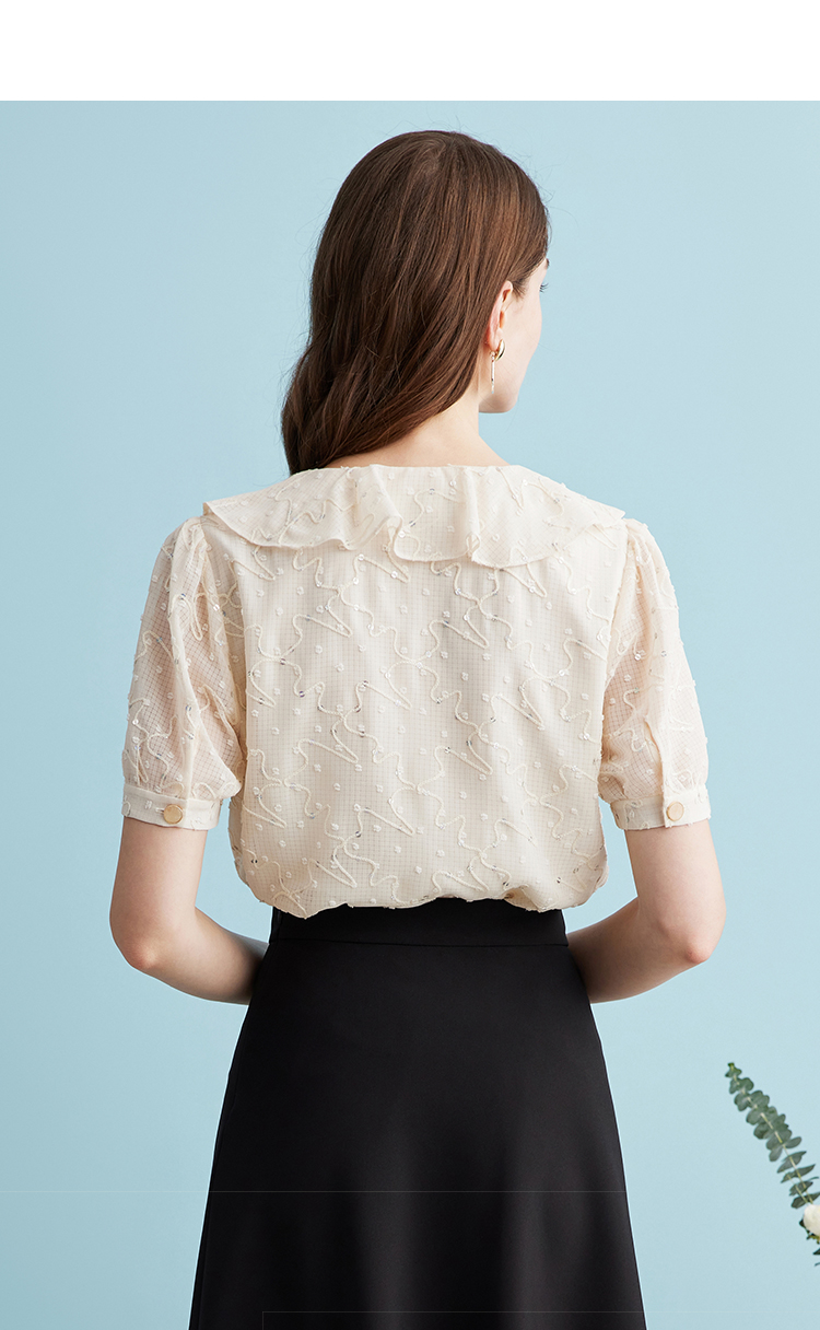 EITIE爱特爱时尚亮片V领荷叶边泡泡袖绣花雪纺衬衫上衣夏新款B2413310