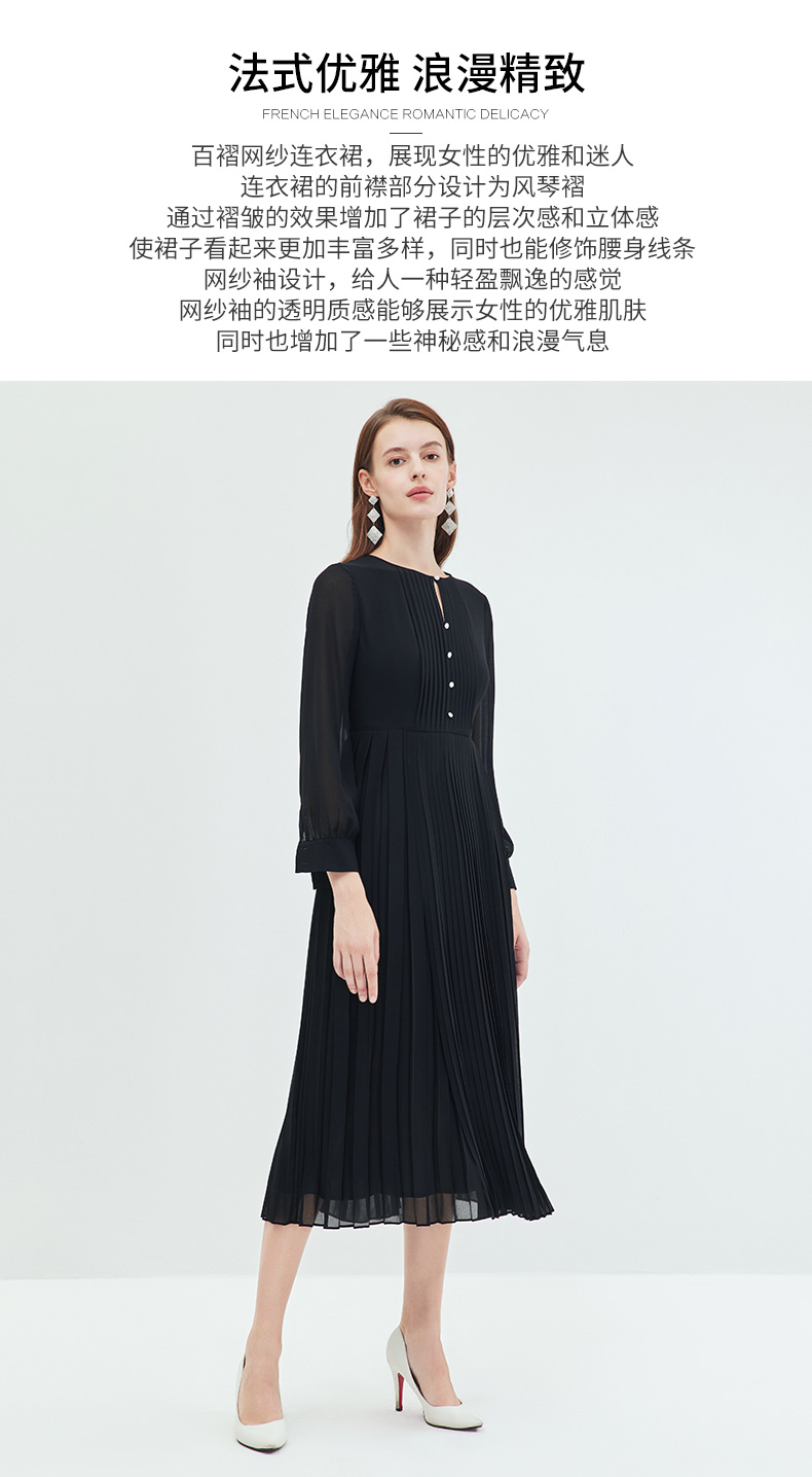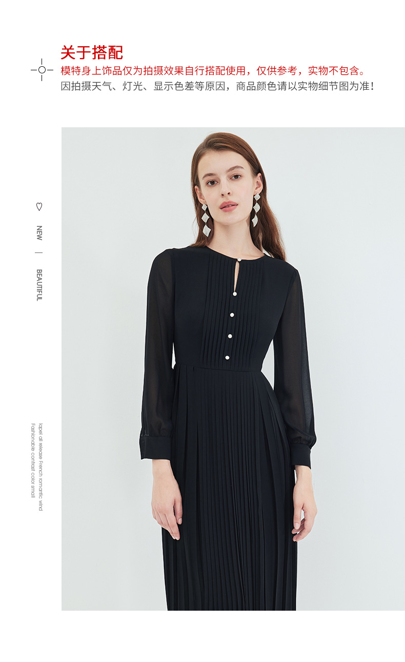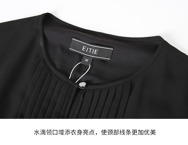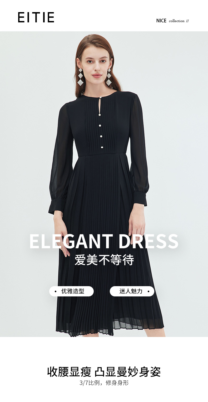 EITIE连衣裙时尚纯色气质百褶收腰连衣裙显瘦法式优雅秋季新款C07254