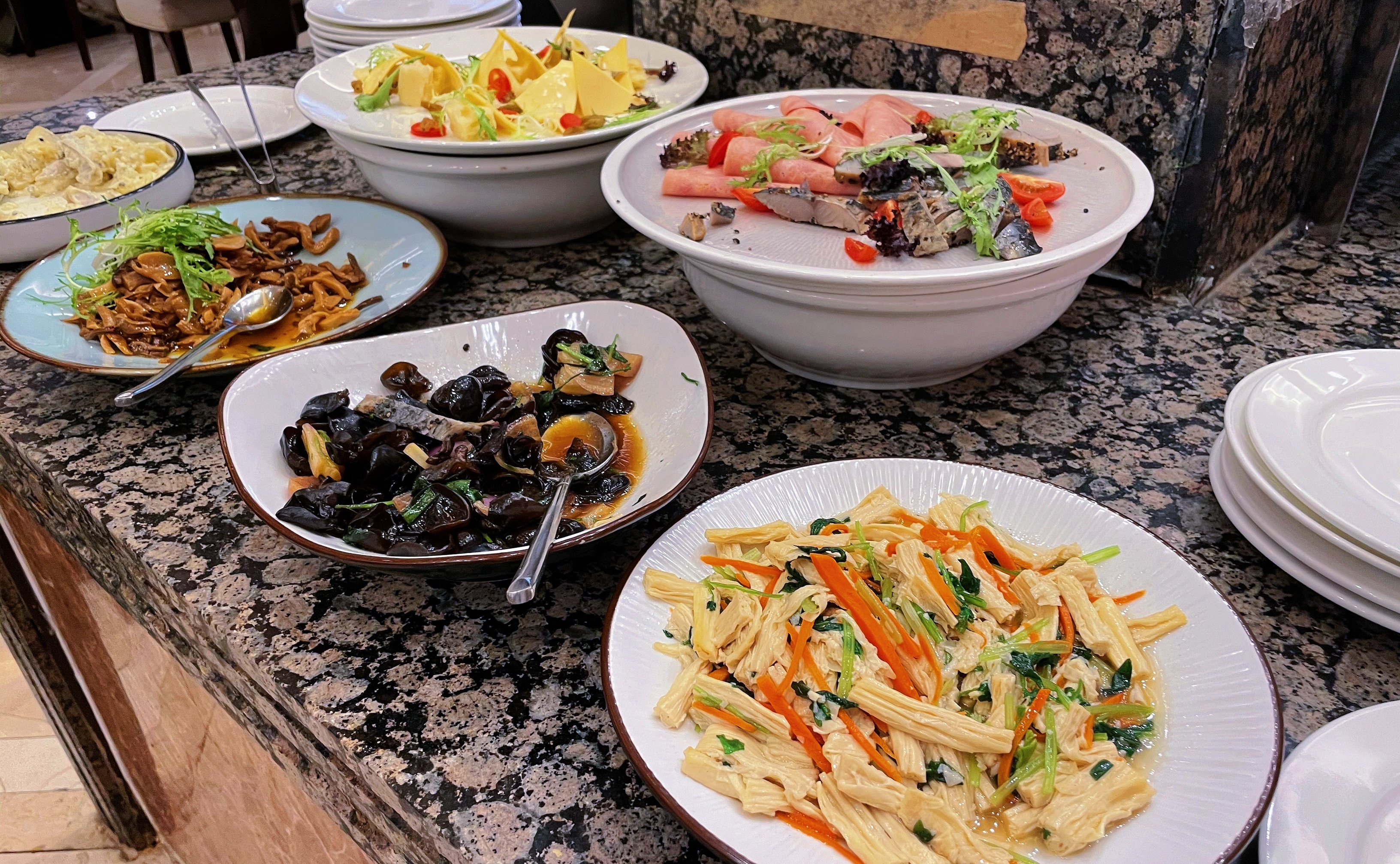 自助早餐在酒店1楼的西餐厅享用。早餐有各式面包、中式烤肠、培根、中式煎饺、油条、面条等一应俱全,可以同时满足一家老小的不同口味。