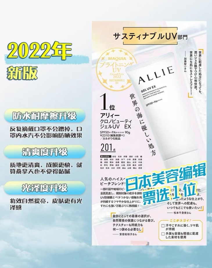 👑ALLIE 嘉娜宝防晒霜90g 22版 💥升级版新加入了“耐摩擦”技术,戴口罩也可以防摩擦,就是随意蹭都不怕被蹭掉 💦无香精添加,敏感肌也可以放心使用! ✨自然提亮肤色,无需卸妆,洁面即可。 🌊去海边也可以放心使用!清爽水润不油腻 🙌保湿款~面部/身体都可用,适合较干性的肤质使用,保湿效果会更好