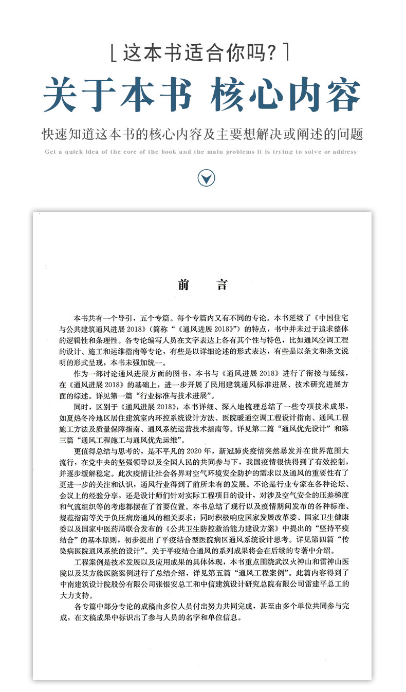 《中国住宅与公共建筑通风进展2020》一方面延续开展行业和技术进展综述,并详细介绍了编写组近几年开展的有关民用建筑通风优先设计、施工和运行全过程的技术研究成果;同时结合新冠疫情爆发引起的社会对传染病医院通风系统的需求、技术进展以及代表性工程案例分别开展了专题分析。主要内容包括:夏热冬冷地区居住建筑暖通空调季节转换与节能设计、标准规范中有关负压隔离病房通风系统的条文要求、平疫结合型医院病区通风系统设计思考、模块化负压(隔离)病房通风系统与空气安全控制解决方案、民用建筑通风相关标准规范的进展与述评等。