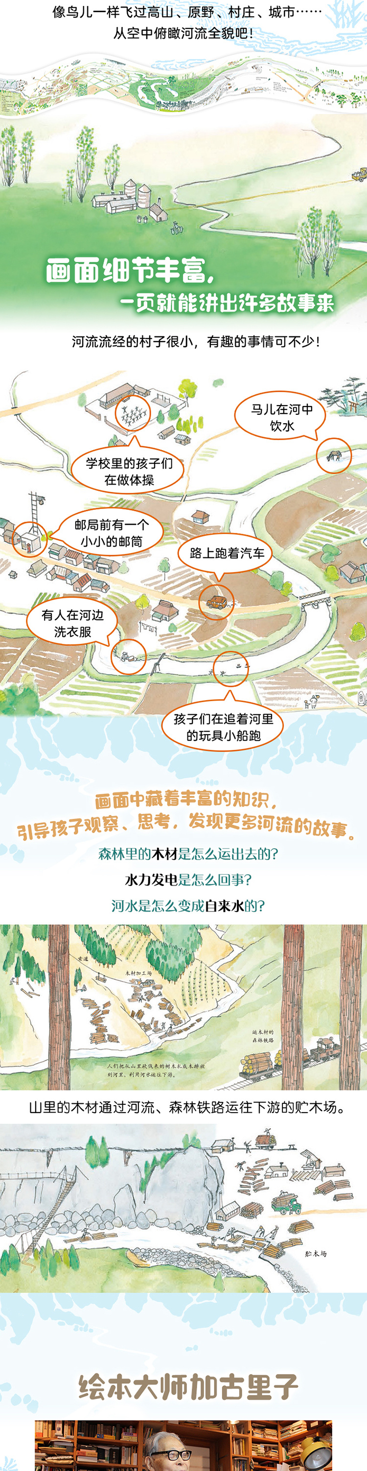 从高山、森林、平原到村庄、城市,加古里子以一条河的流经之地为线索,描绘出不断变换的地形地貌,以及岸边人们的生活,展现出河流从发源到入海的壮阔之旅。画面细节丰富生动,孩子可以自由地观察河流沿岸的植被、农田、村落,还有学校、邮局、工厂等各种建筑,看看生活在河流附近的人在干什么,每一页都能讲出很多故事来,是一本幼儿园孩子也看得懂、看得开心的自然科普绘本。