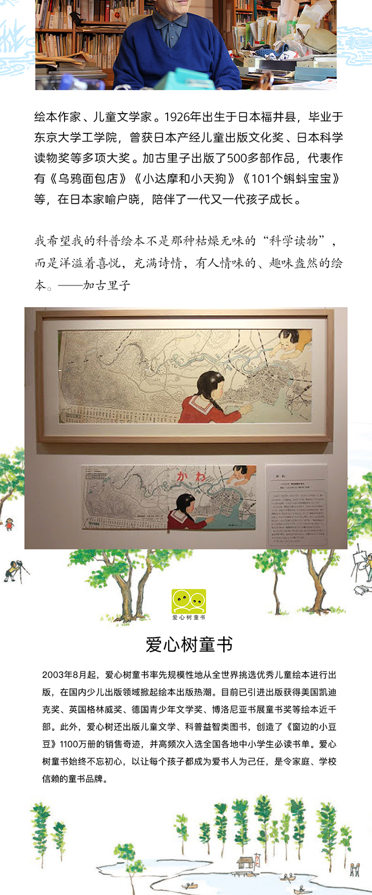 绘本作家、儿童文学家。1926 年出生于日本福井县,毕业于东京大学工学院,曾获日本产经儿童出版文化奖、日本科学读物奖、菊池宽奖等多项大奖,以及 2011 年***安徒生奖画家奖提名。加古里子从 1959 年开始创作绘本,出版了 500 多部作品,其中《乌鸦面包店》《小达摩和小天狗》《101 个蝌蚪宝宝》等绘本在日本家喻户晓,陪伴了一代又一代孩子成长。此外,拥有工学博士学位的加古里子还擅长创作科普绘本,他总是能把艰深、复杂的科学知识讲得有趣又充满诗情,代表作有《河川》,“加古里子科学图鉴”系列(《海》《地球》《宇宙》《人类》)等。