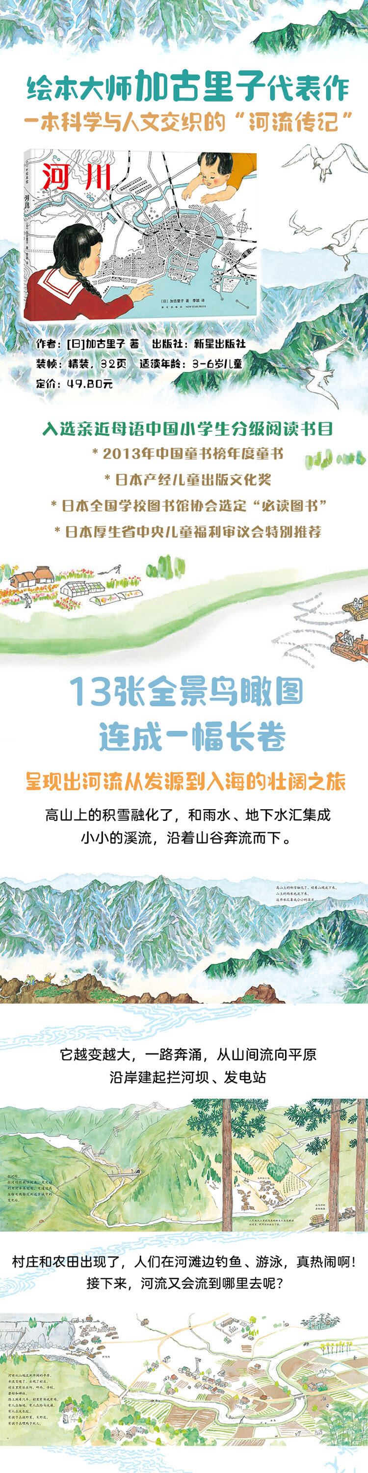 从高山、森林、平原到村庄、城市,加古里子以一条河的流经之地为线索,描绘出不断变换的地形地貌,以及岸边人们的生活,展现出河流从发源到入海的壮阔之旅。书中13张鸟瞰图是连续的,连起来就是一幅长长的画卷,如同翻开了一条河流的“传记”。