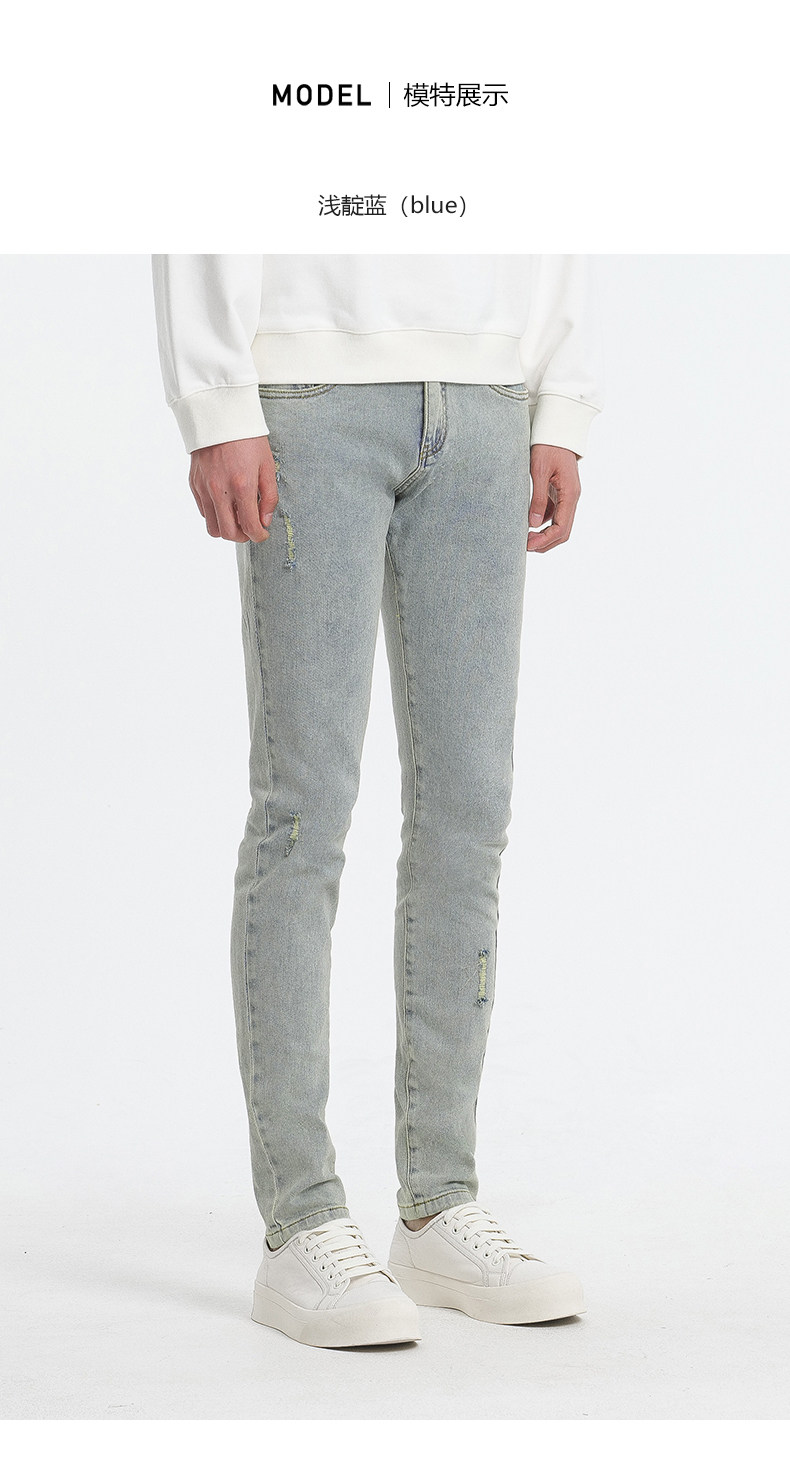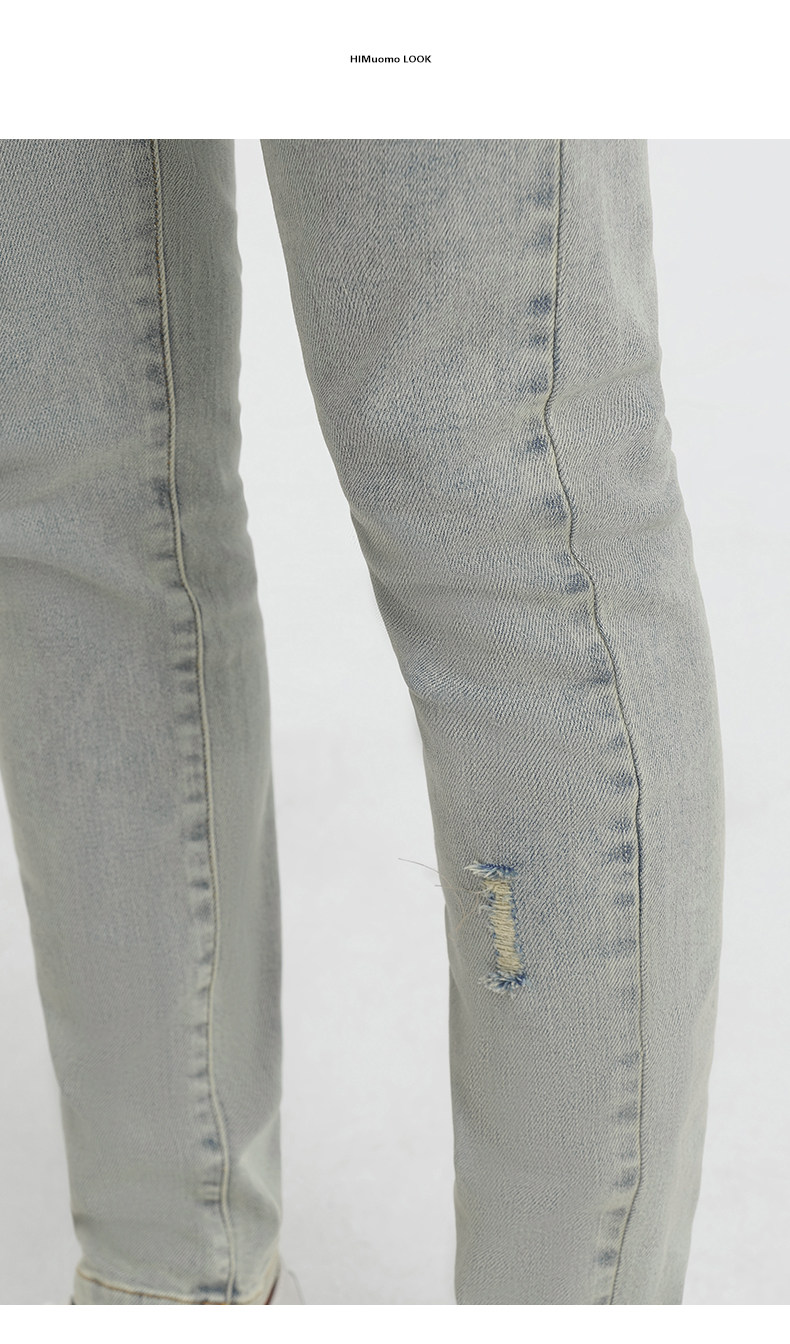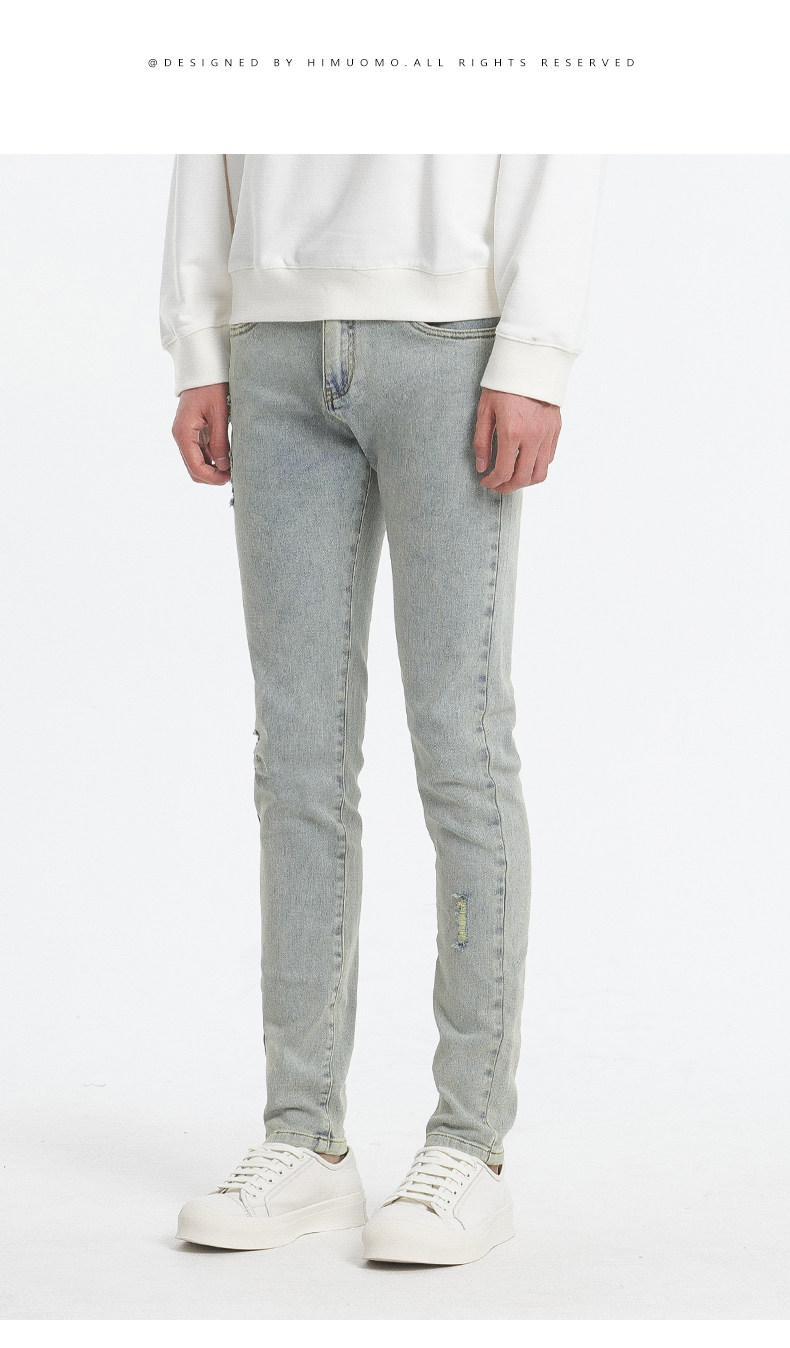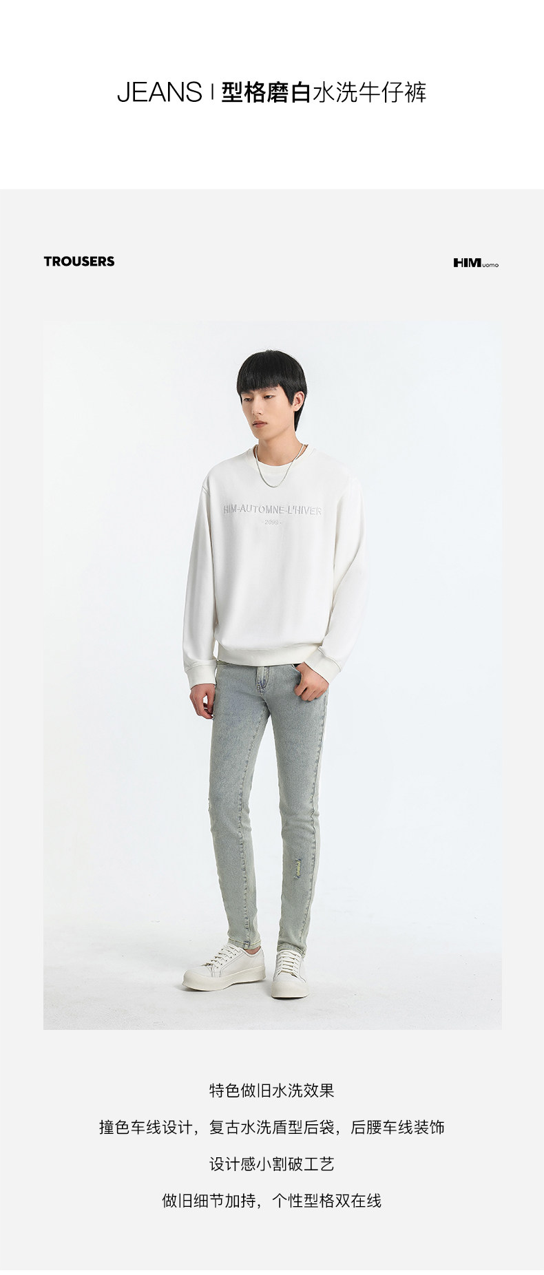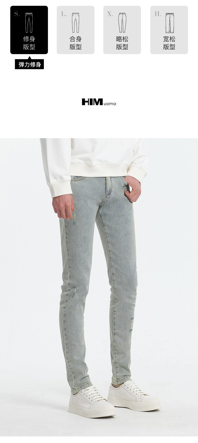 HIM漢崇 修身弹力锥形小脚牛仔裤男 复古淡蓝色破洞做旧 2025秋季