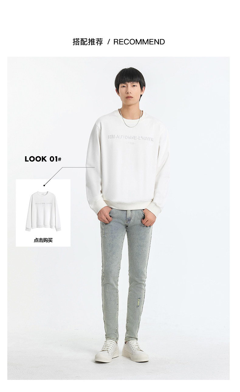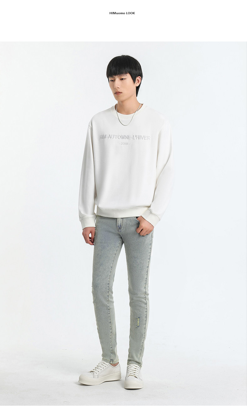 HIM漢崇 破损植绒印花圆领套头长袖T恤男休闲白色打底衫 2025秋季