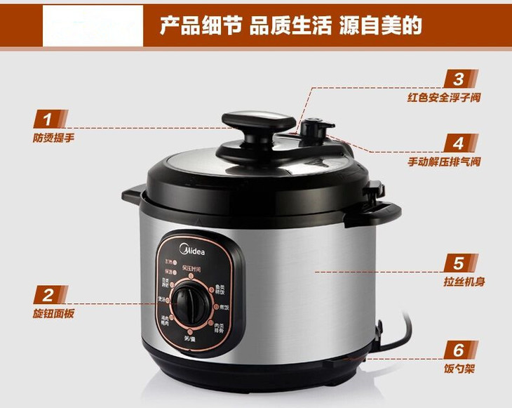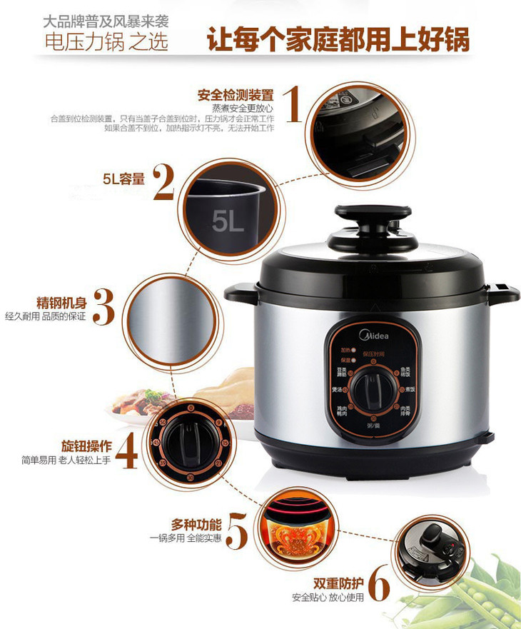 【高压锅】美的12PCH502A电压力锅5L家用厨房机械式高压锅小型饭煲5-6人