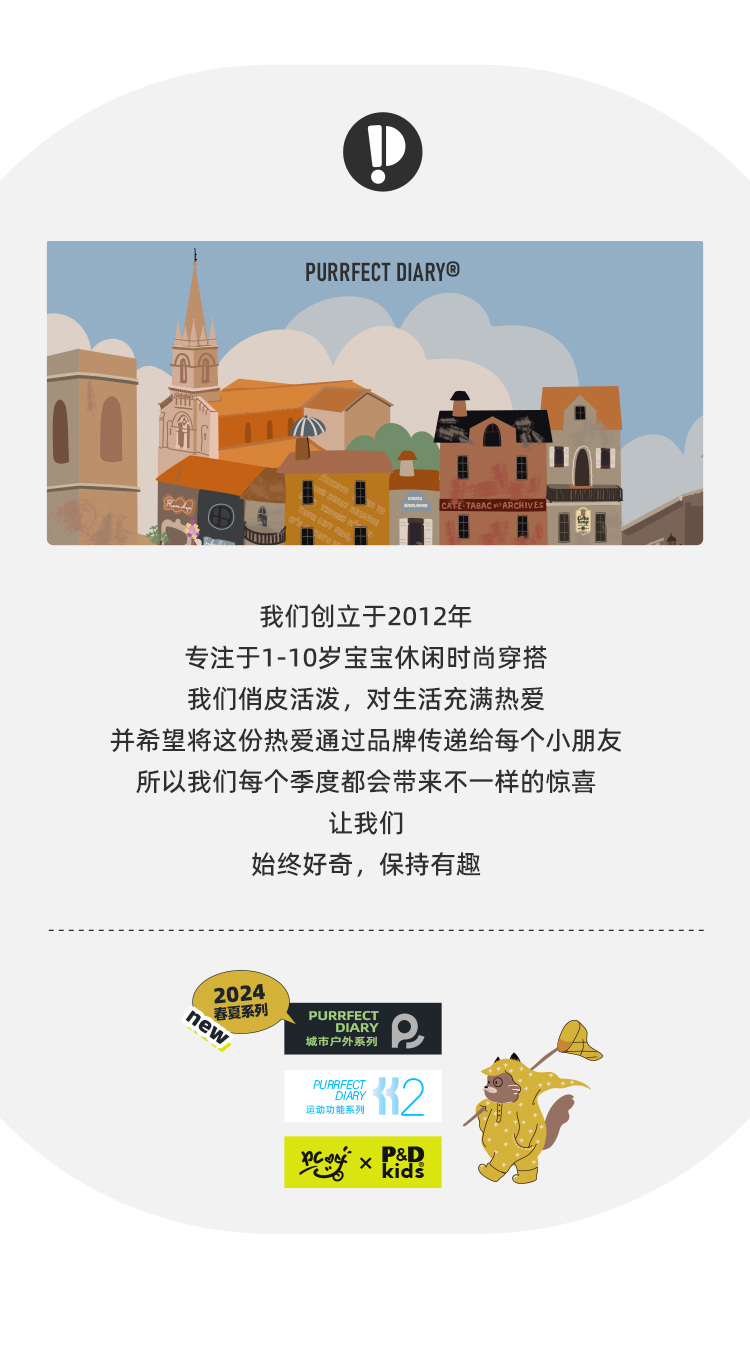 - Purrfect-Diary专注于贴近自然随性的穿着概念,轻奢平价的童装文化传播,在产品设计上更加注重婴童穿着的舒适性、安全性、更出众的国际化品牌,将欧美的育婴文化在中国进行深入的传播与推广。