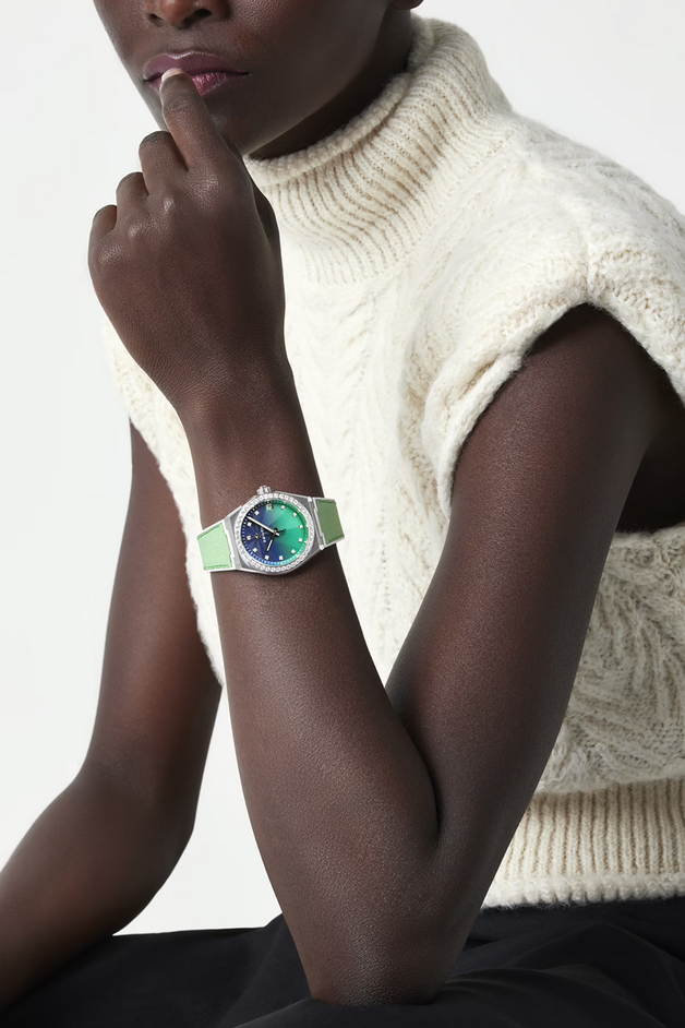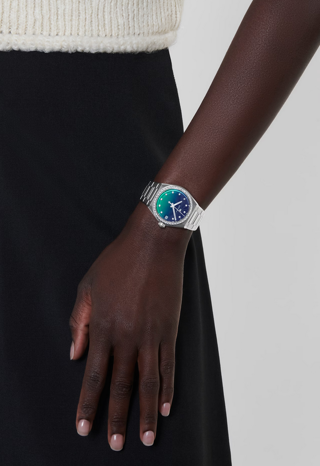 镜面 材质 | 蓝宝石水晶玻璃 | 表盘 | 精钢表壳和镶钻表圈,精钢表圈镶嵌44颗VVS明亮式切割钻石 蓝色至绿色渐变表盘,玑镂雕刻 日期显示 透底 |