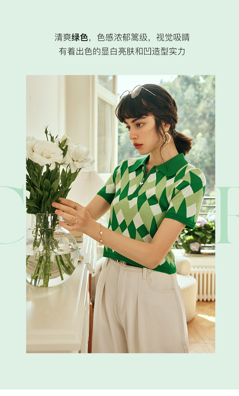 OLrain欧芮儿法式polo领针织衫女春季2023年新款修身几何拼色上衣