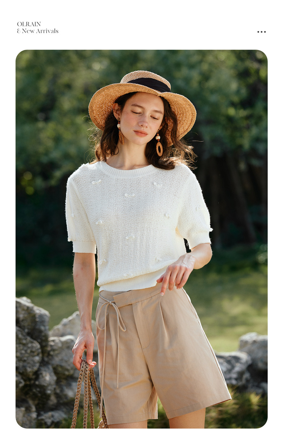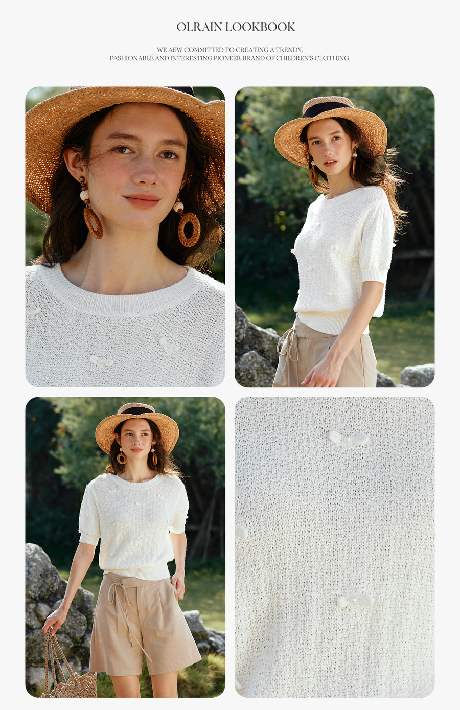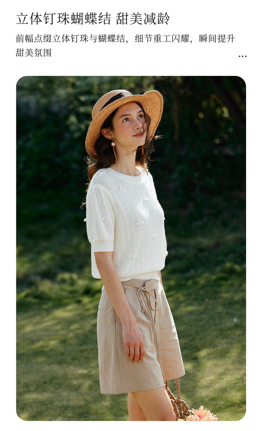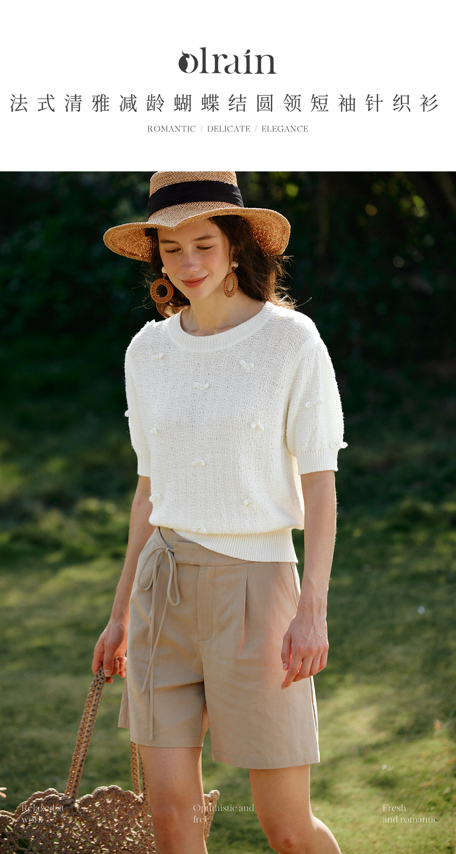 OLrain欧芮儿2026新款女夏季法式清雅减龄蝴蝶结圆领短袖针织衫